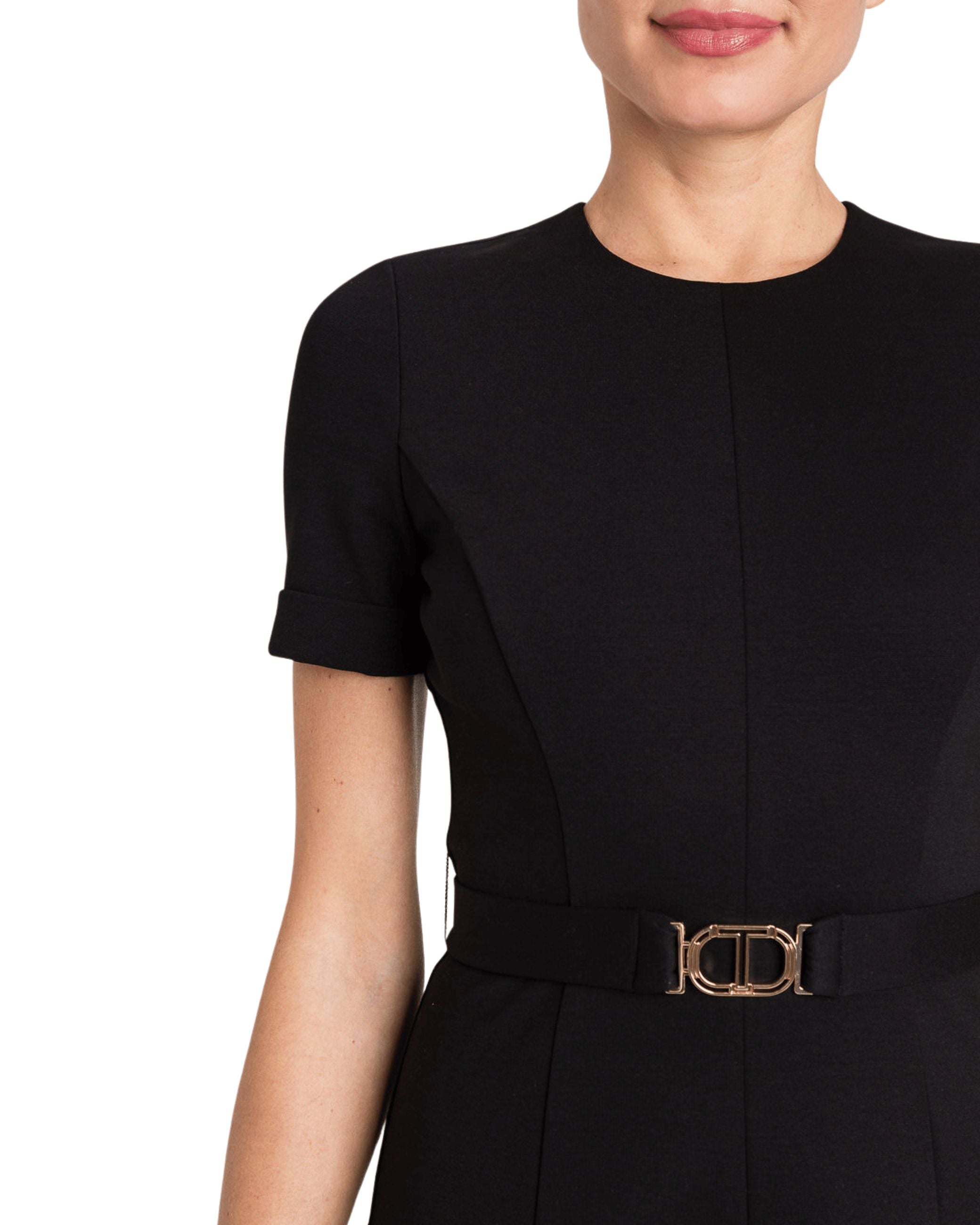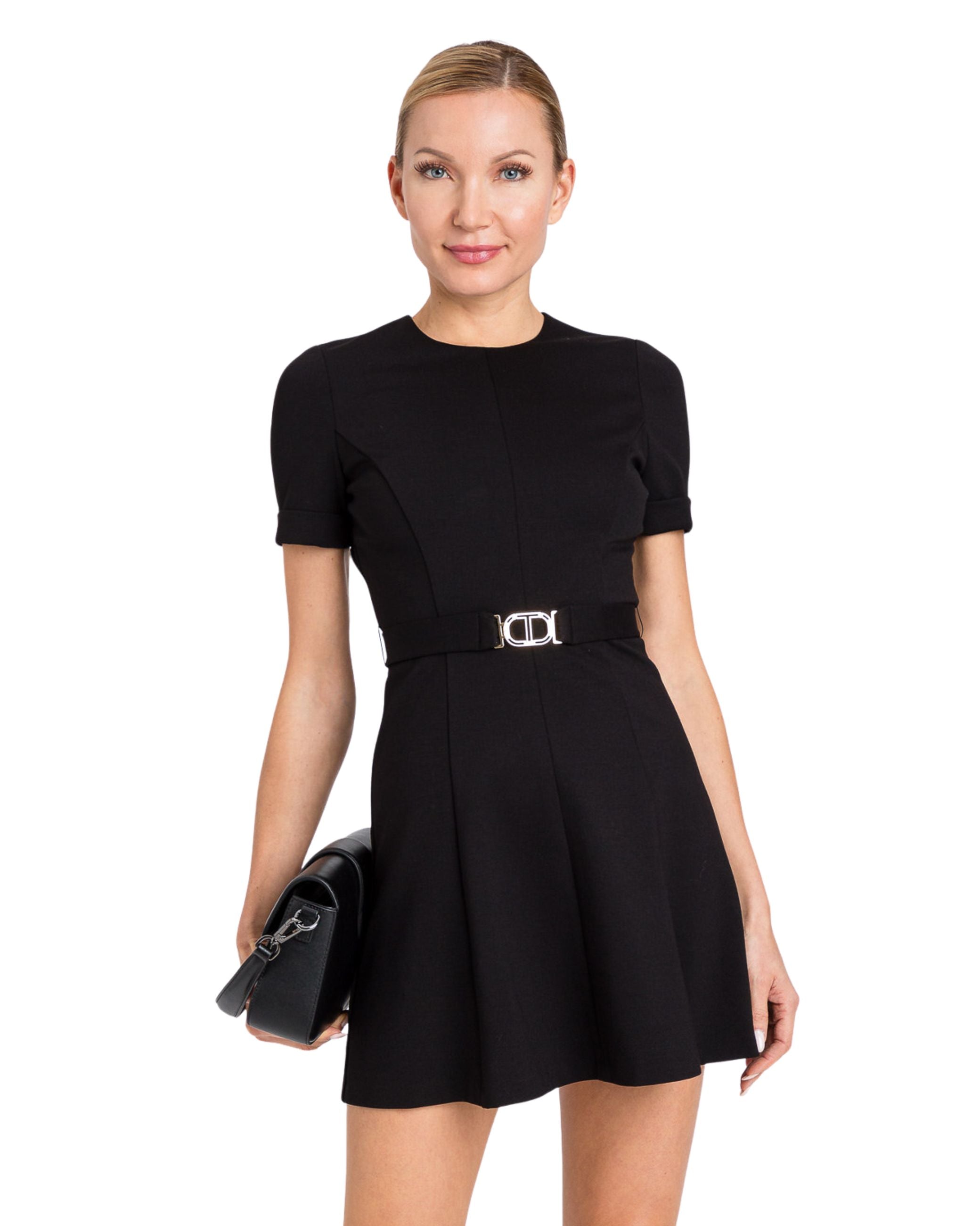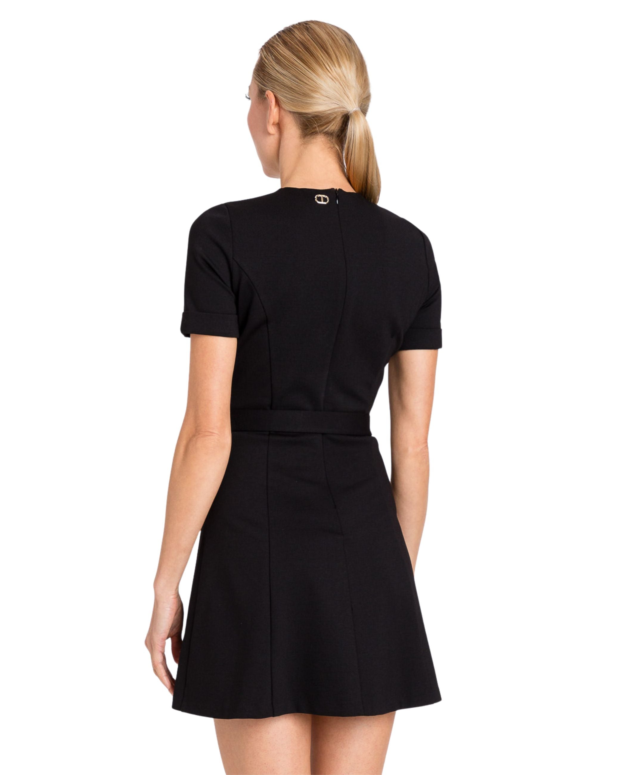Abito della nuova collezione fall winter 25/26 di Twinset realizzato in punto Milano di viscosa, linea svasata, cintura con fibbia logo, maniche corte e collo tondo, ha chiusura con zip sul retro.