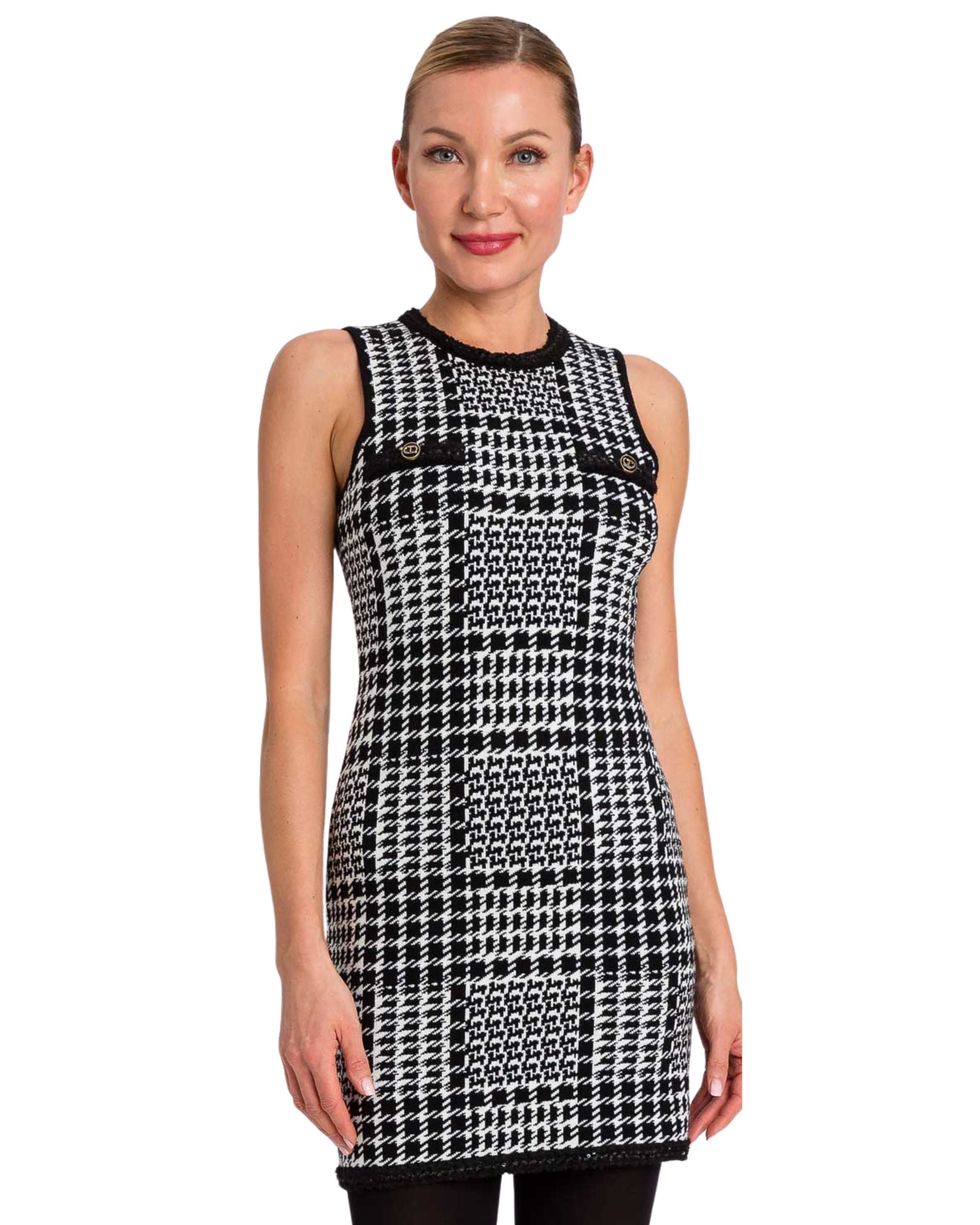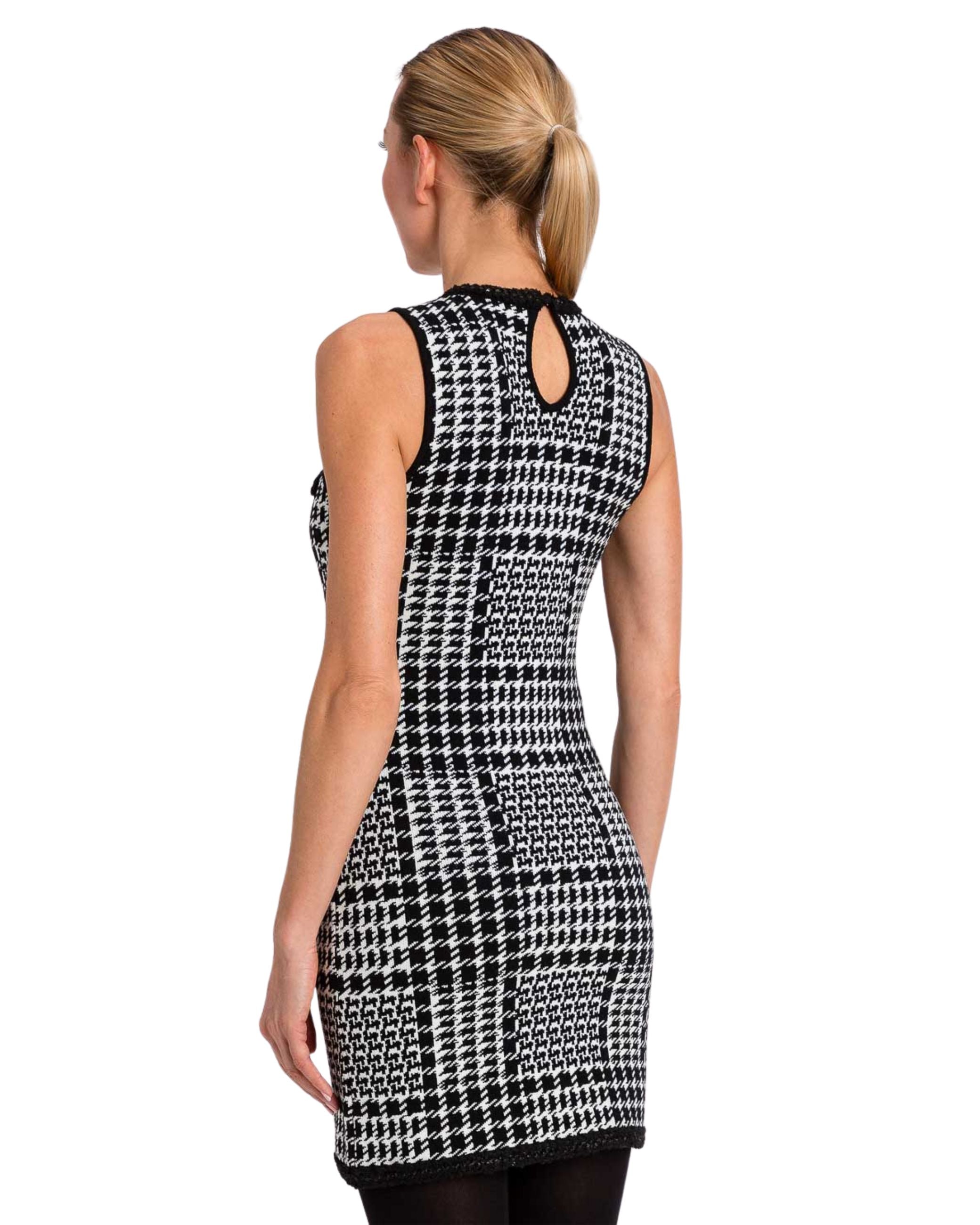 Abito della nuova collezione fall winter 25/26 di Twinset realizzato in maglia con lavorazione pied de poule, senza maniche, collo tondo, linea fitted.