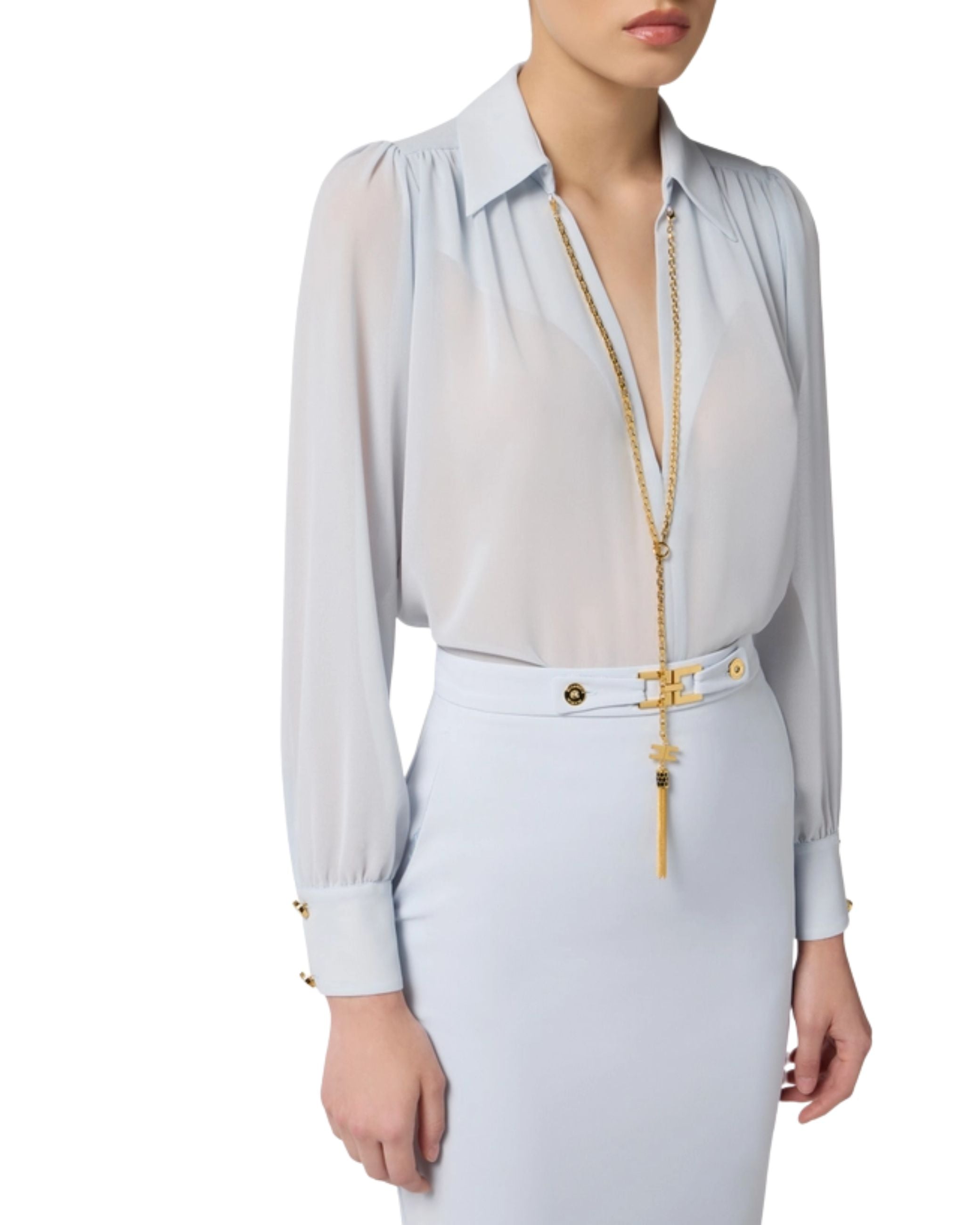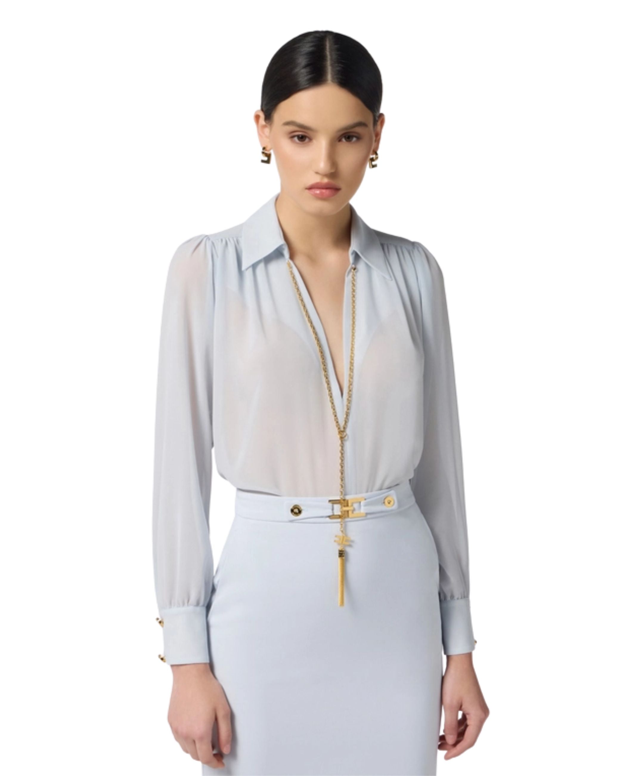 Camicia della nuova collezione fall winter 25/26 del brand Elisabetta Franchi realizzata in georgette, ha spalle leggermente arricciate, scollo V decorata con catena, ha una vestibilità slim.