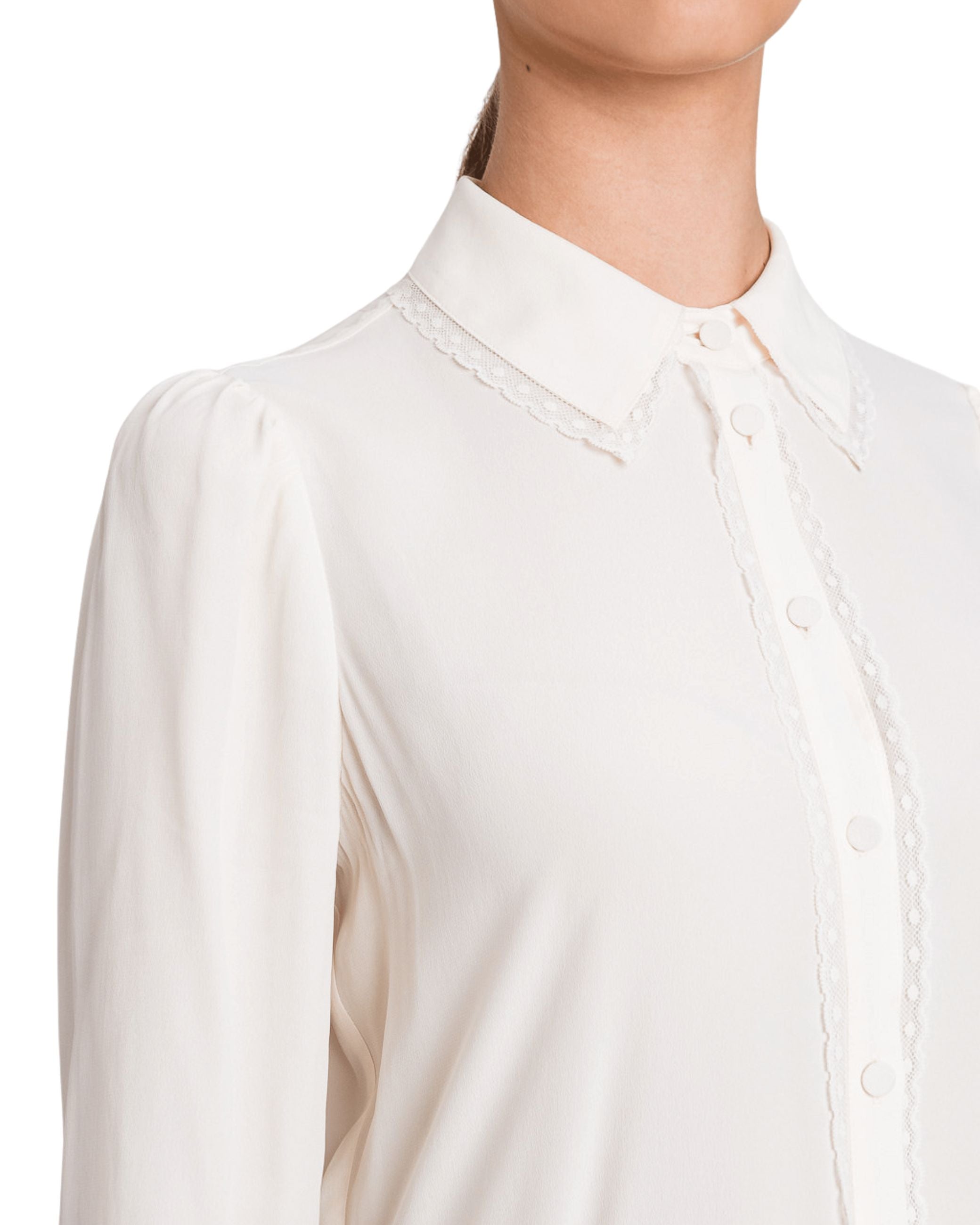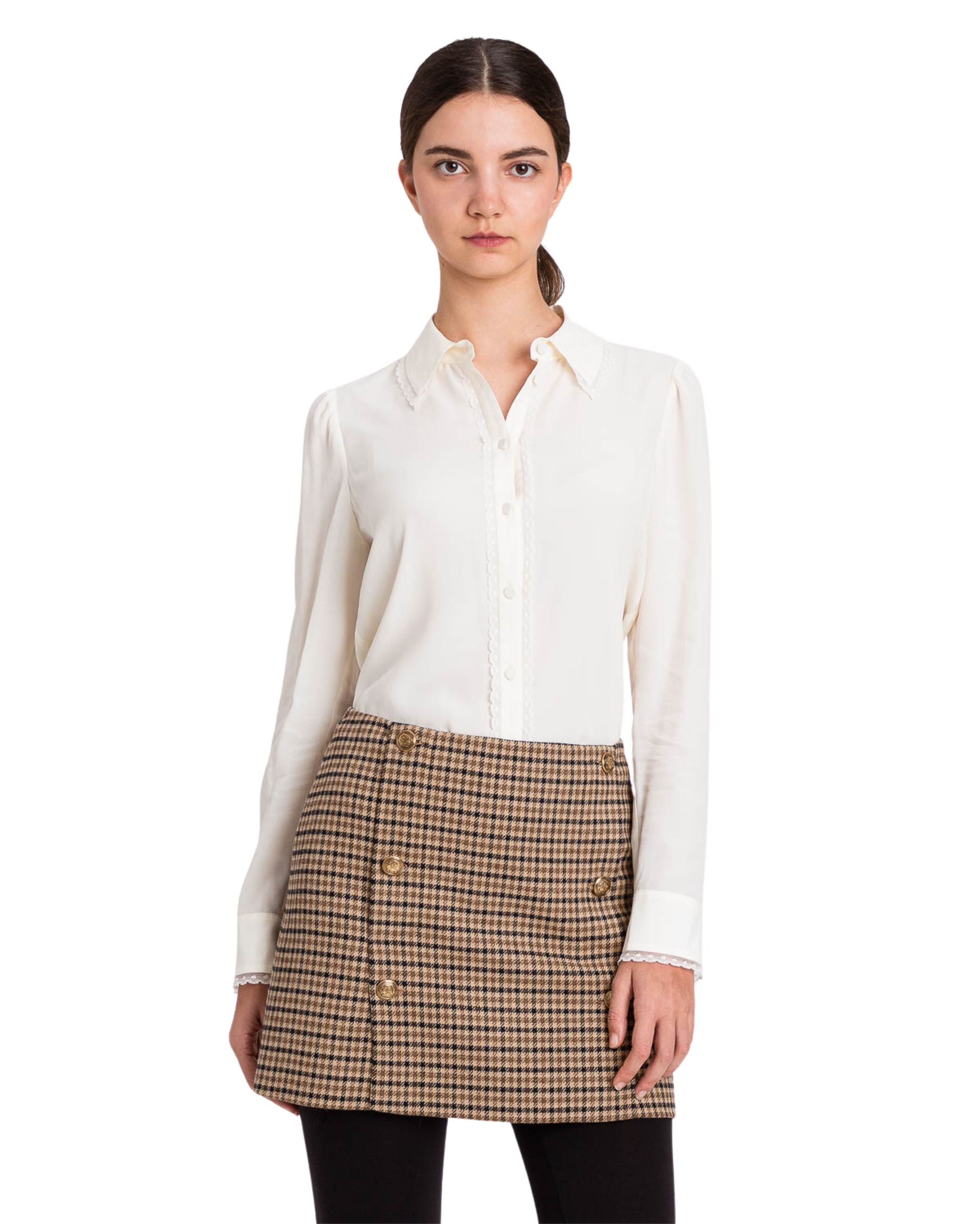 Camicia della nuova collezione fall winter 25/26 di Twinset realizzata in crêpe de Chine fluido di viscosa e seta, sofisticati dettagli di passamaneria al collo, sul davanti e ai polsi, ha una linea dritta.