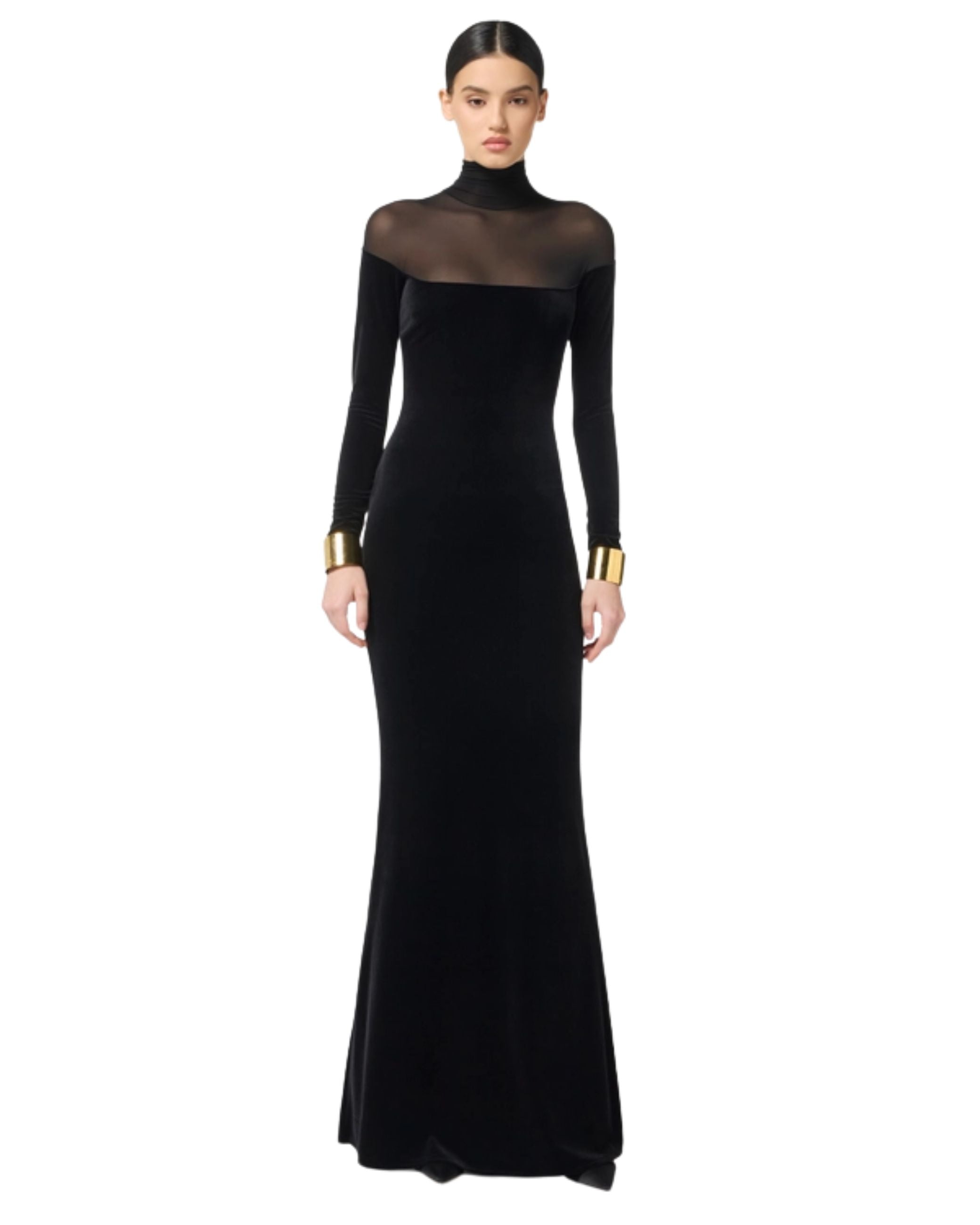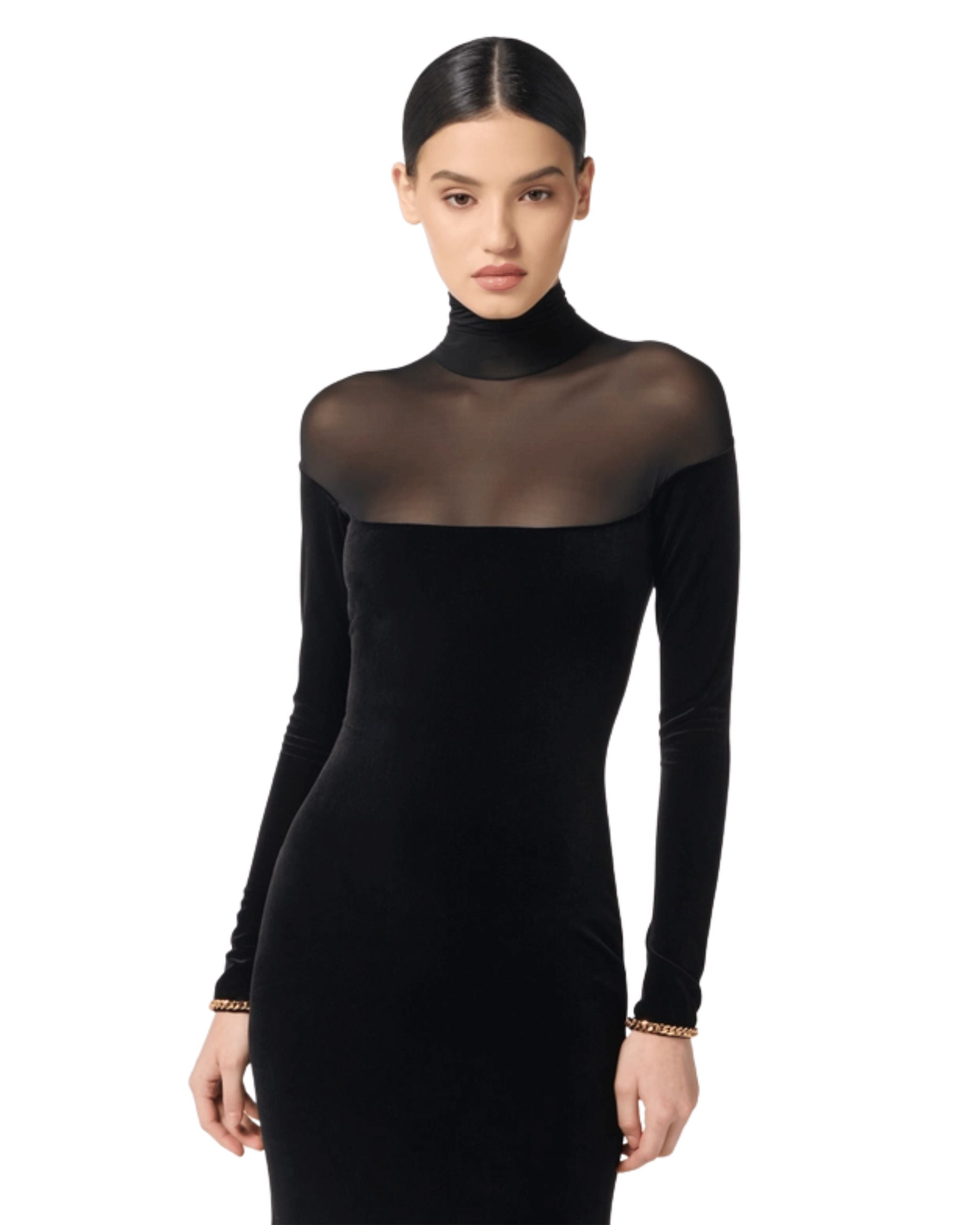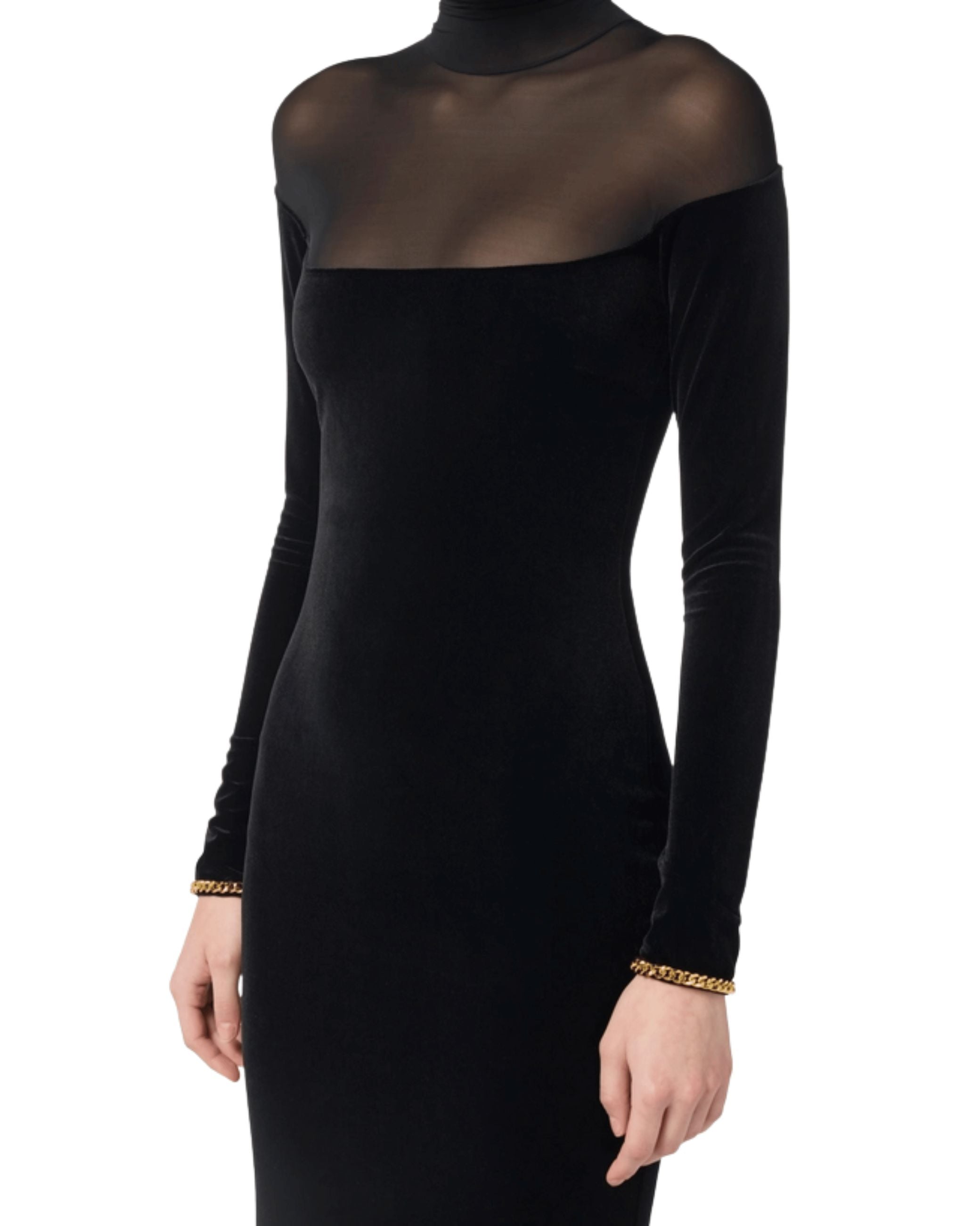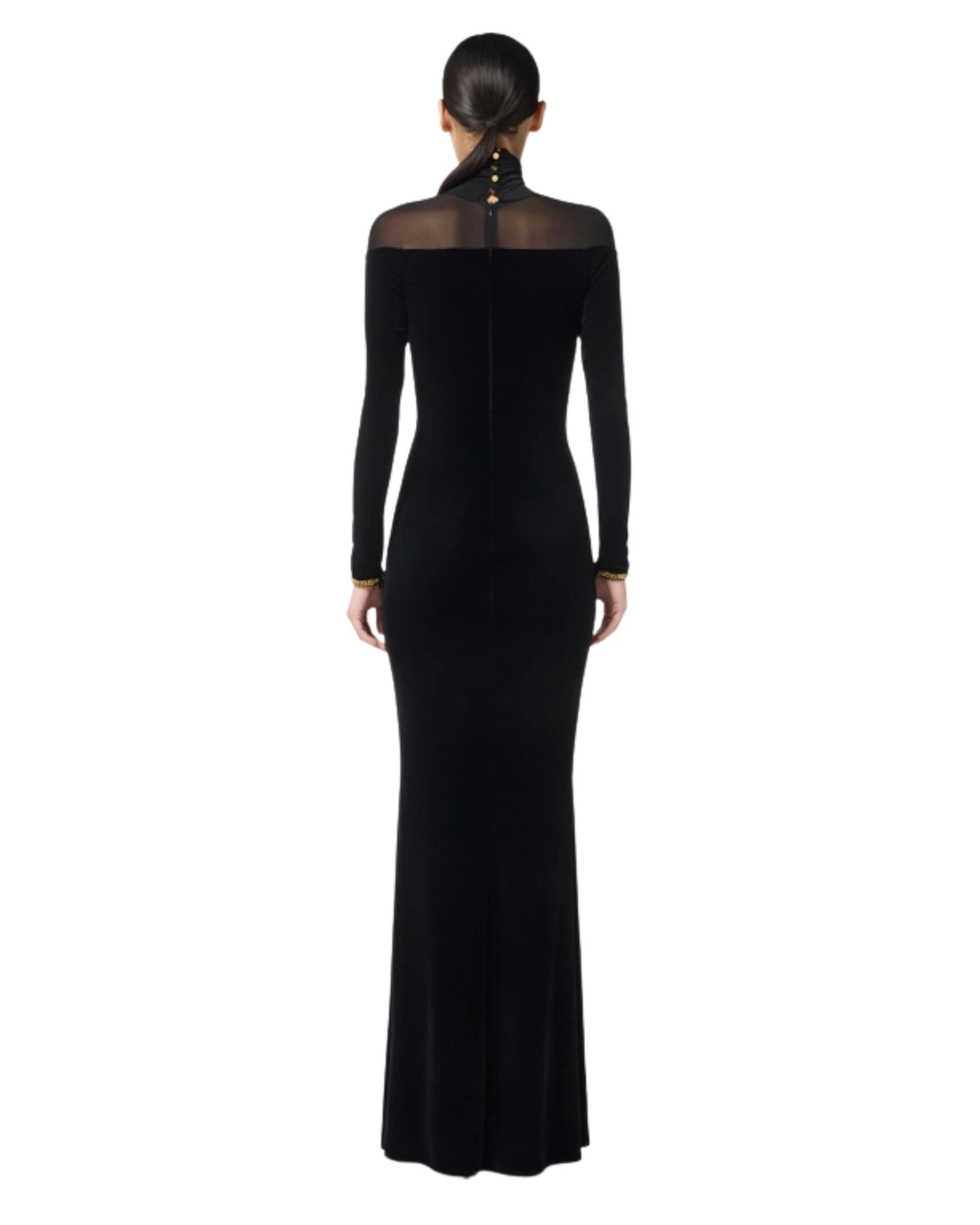 Abito della nuova collezione fall winter 25/26 del brand Elisabetta Franchi Red Carpet realizzato in velluto e jersey semi trasparente alle spalle, i polsi sono impreziositi da catene gioiello che donano luminosità mentre la gonna leggermente a sirena conferisce sensualità alla figura, ha una vestibilità slim.