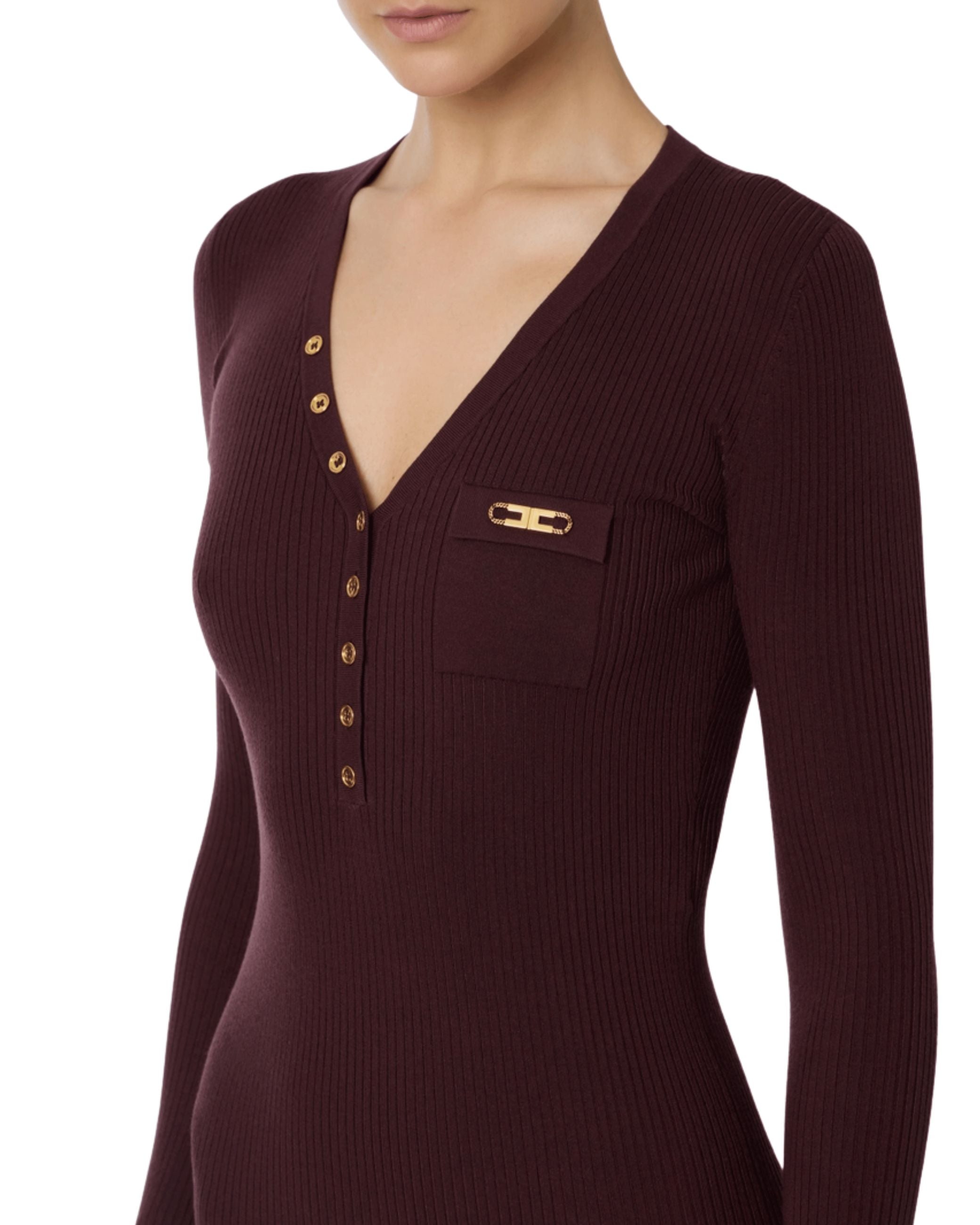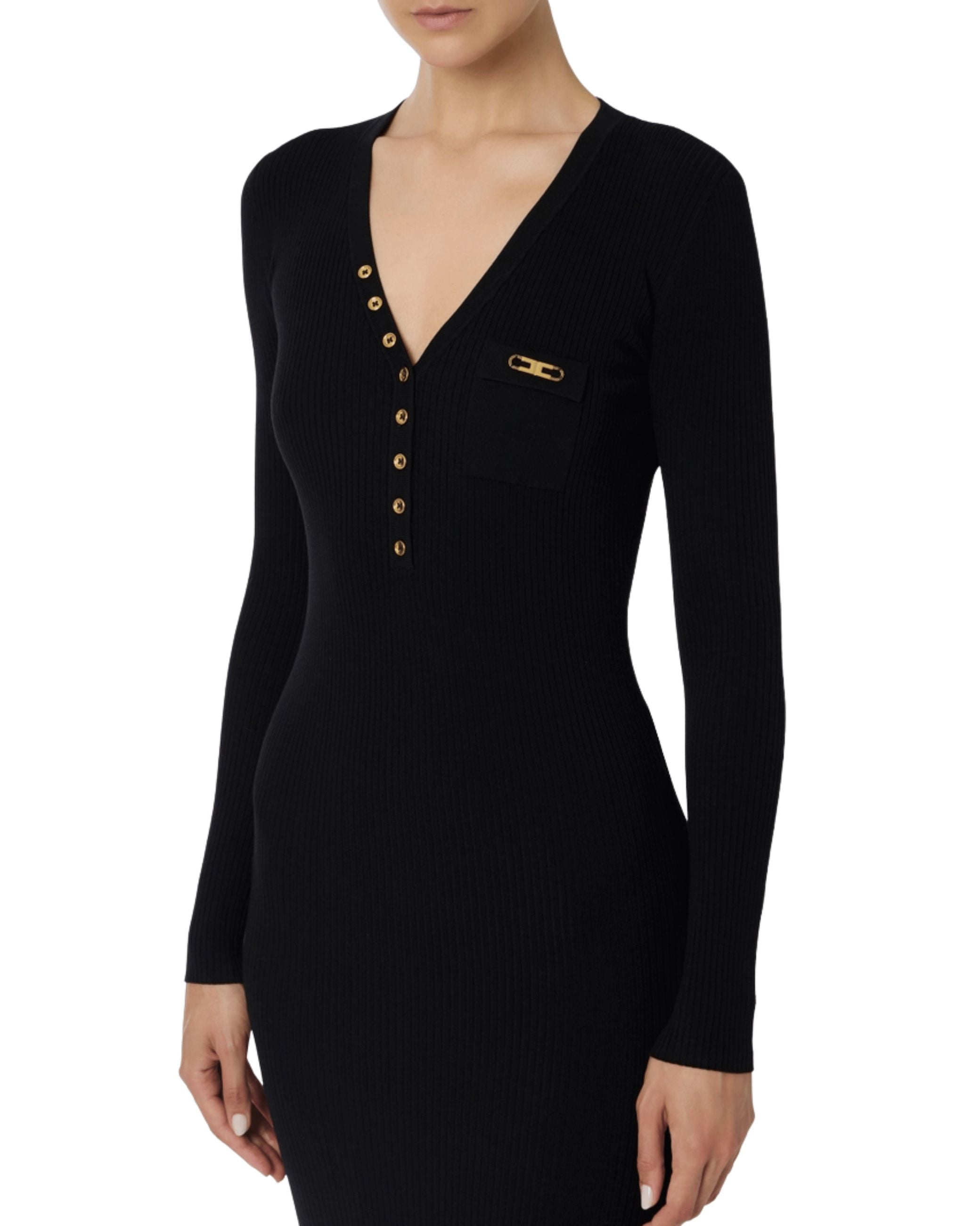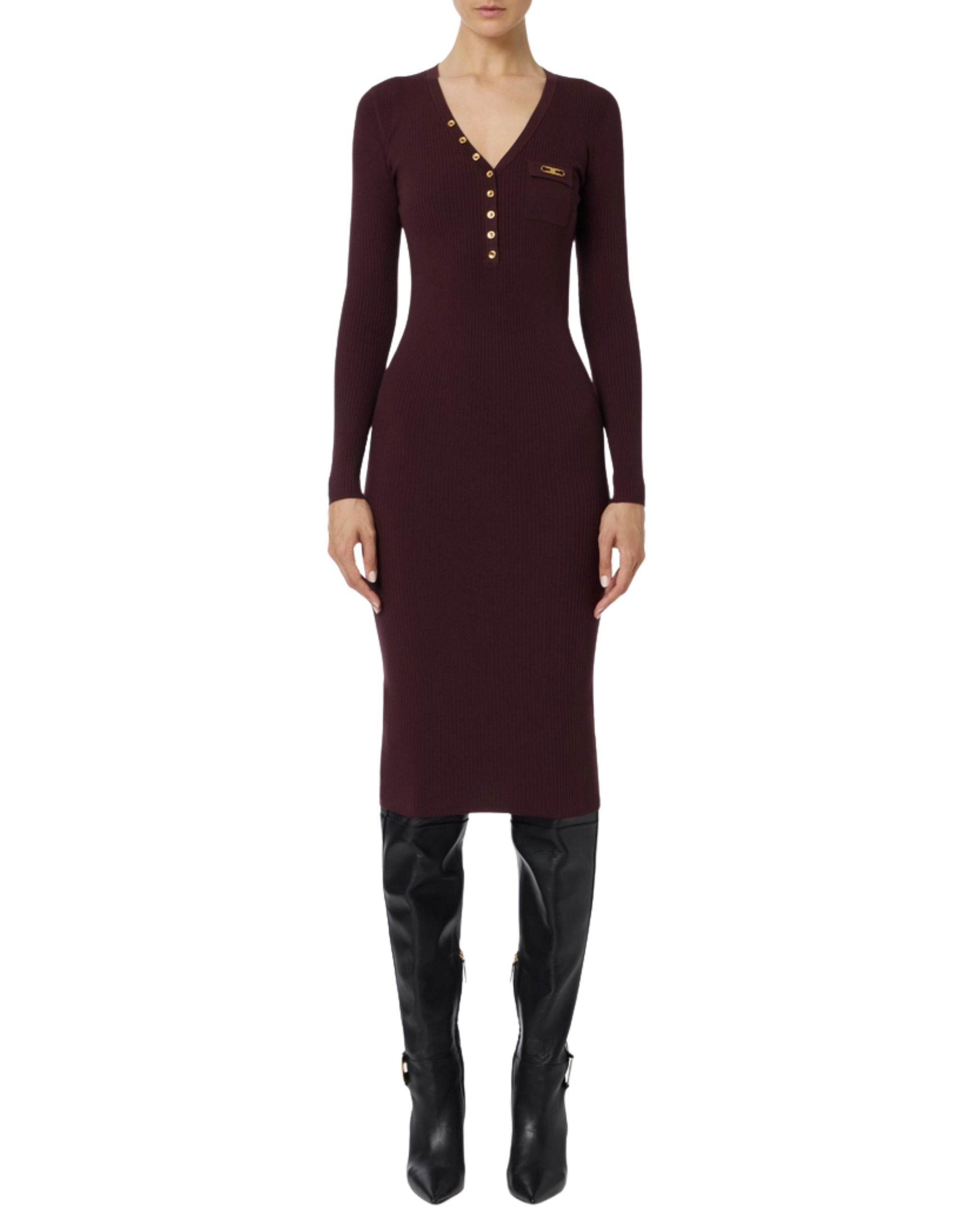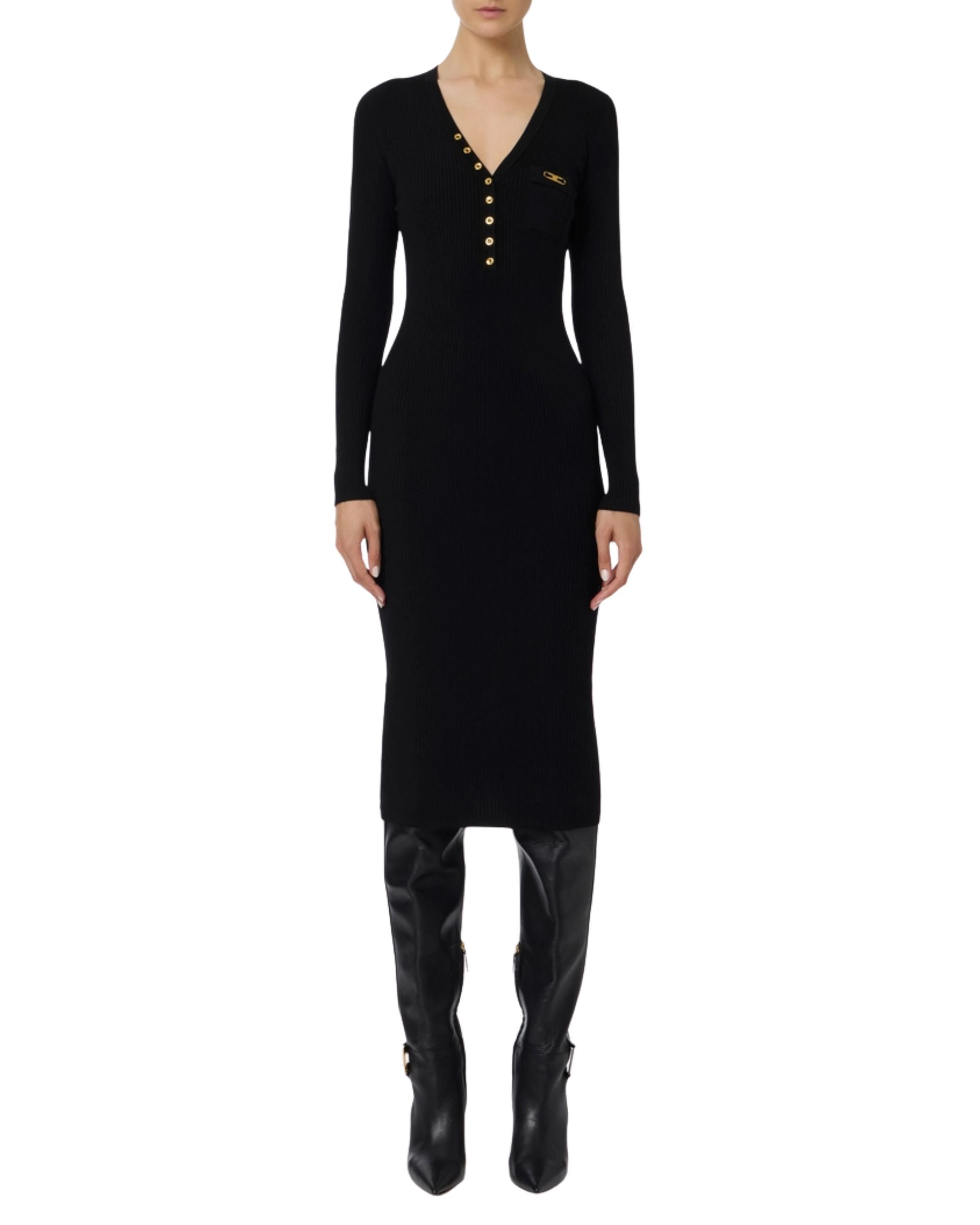 Abito in maglia della nuova collezione fall winter 25/26 del brand Elisabetta Franchi realizzato in misto seta. Modello longuette a tubino dalla lavorazione a costine, maniche lunghe, decorato allo scollo da bottoni in metallo colore oro e taschino in raso con applicazione in metallo colore oro, ha una vestibilità slim.