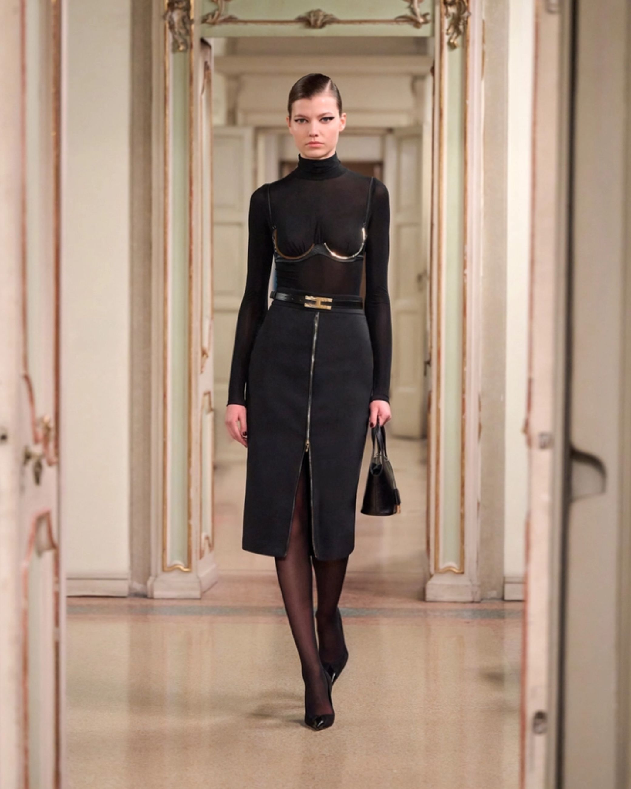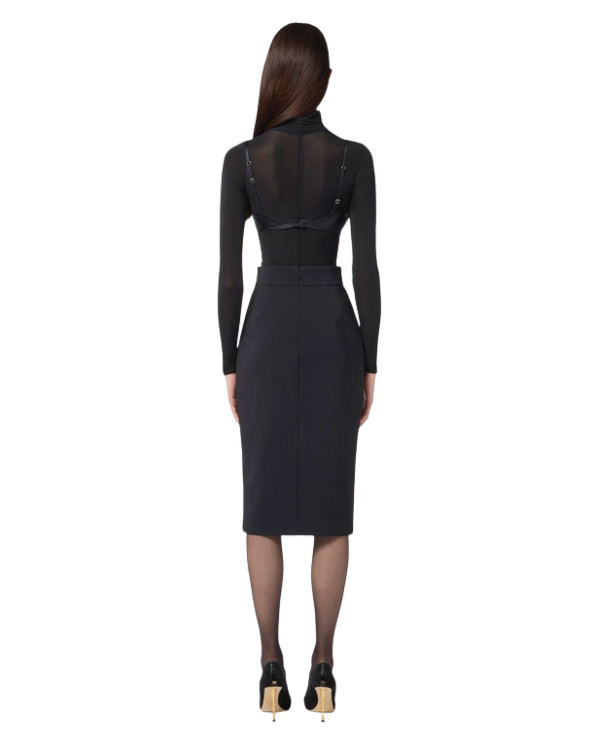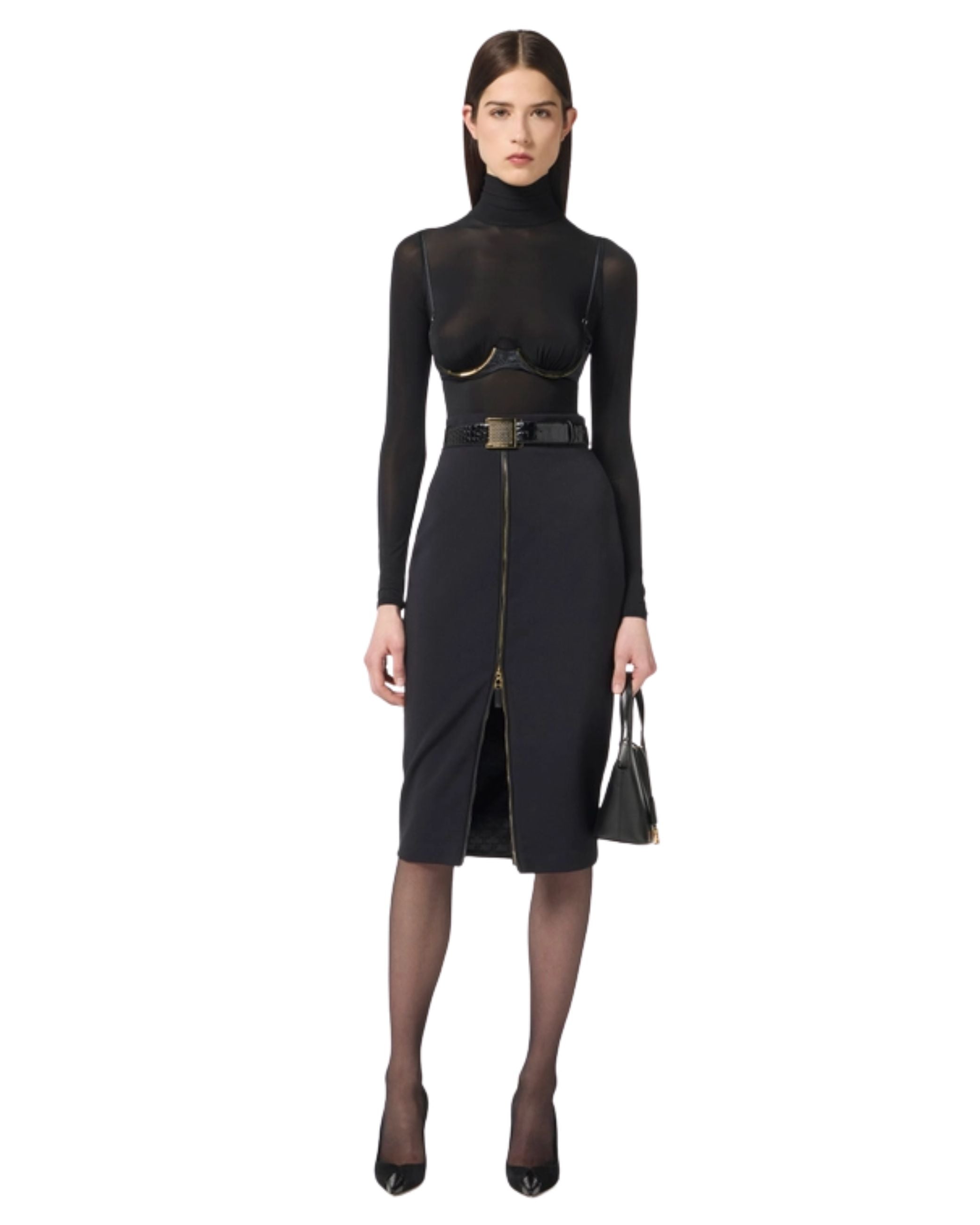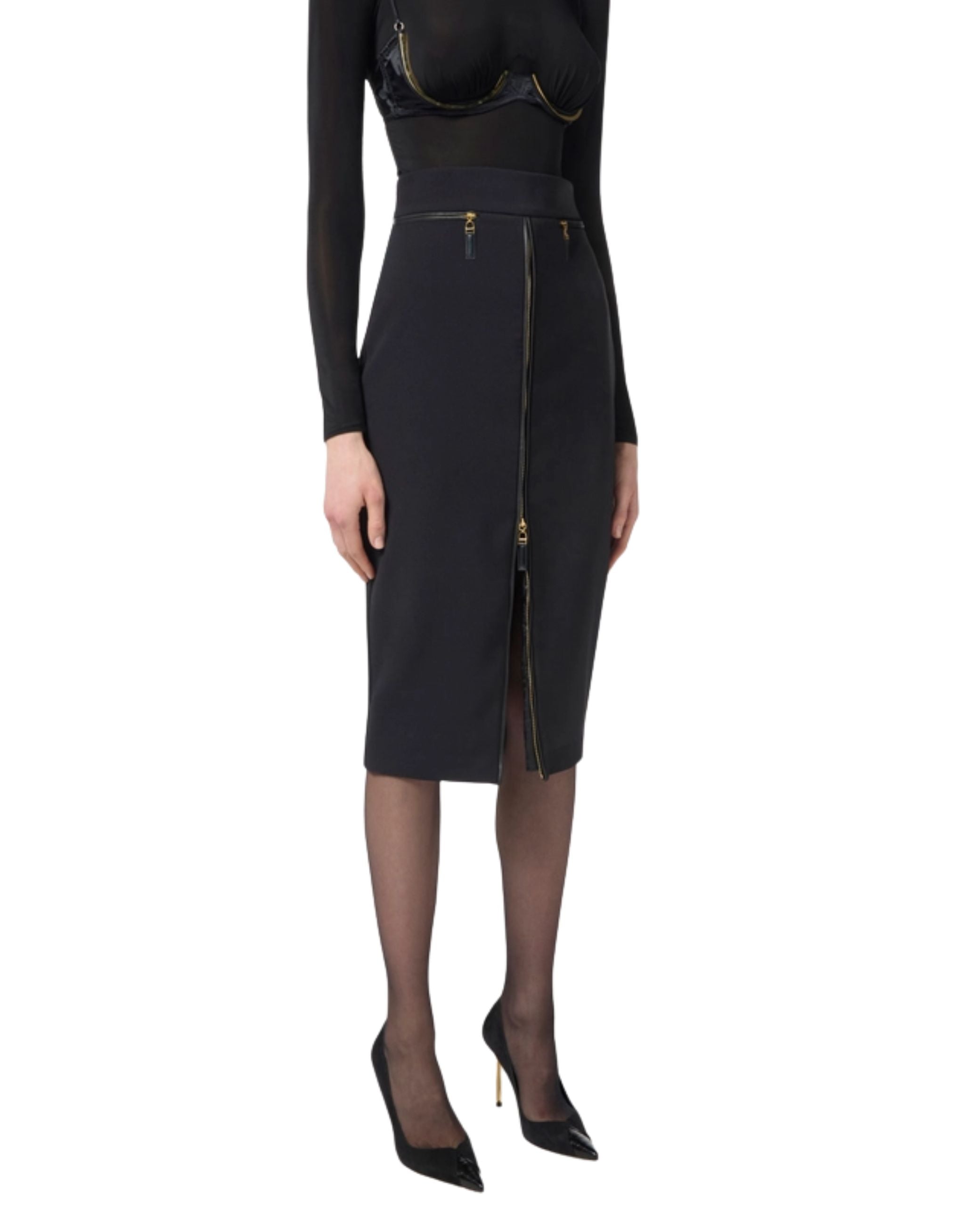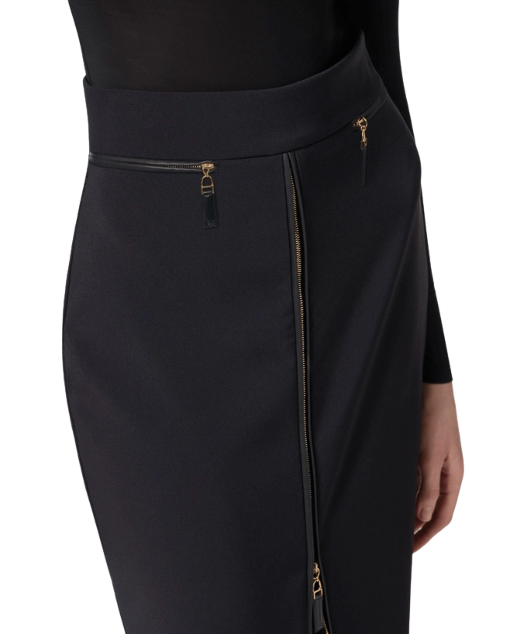 Gonna della nuova collezione fall winter 25/26 del brand Elisabetta Franchi modello tubino decorata con zip laterali e zip centrale che crea uno spacco sul davanti, ha una vestibilità slim.