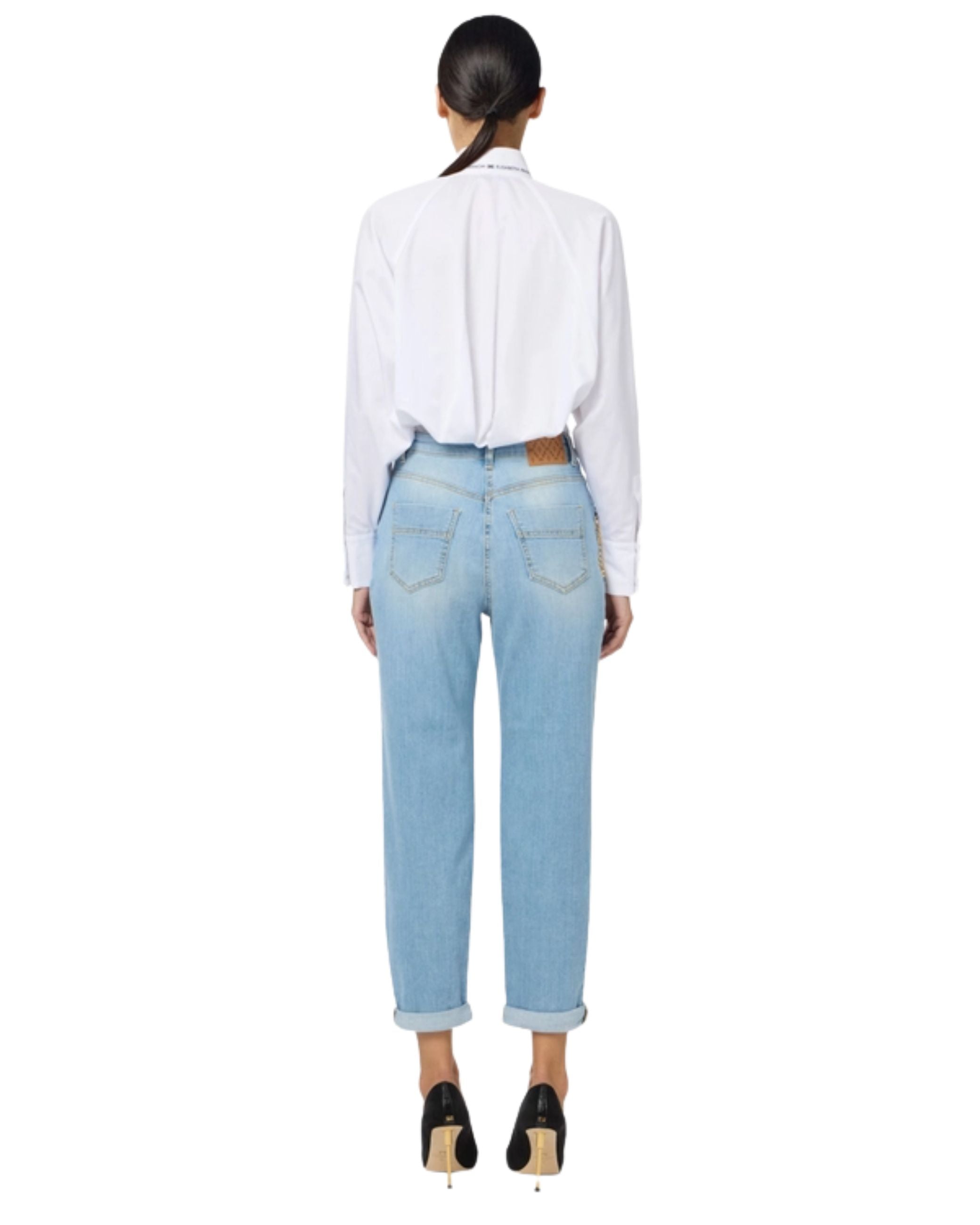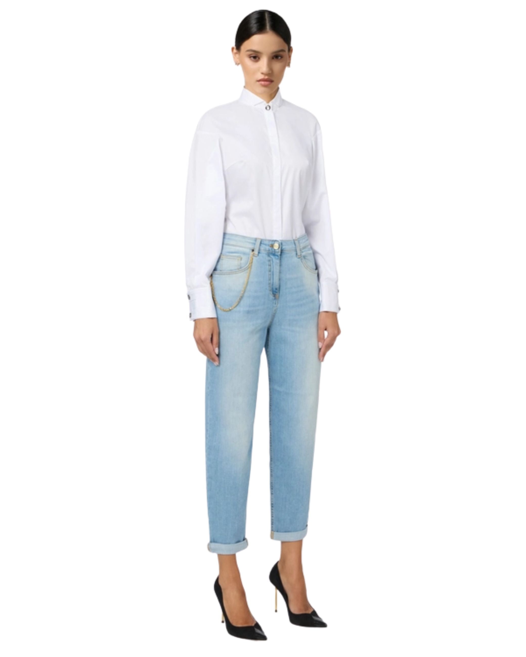 Jeans della nuova collezione fall winter 25/26 del brand Elisabetta Franchi modello cinque tasche con vita regolare e gamba boyfriend, impreziosito da catena in metallo colore oro.
