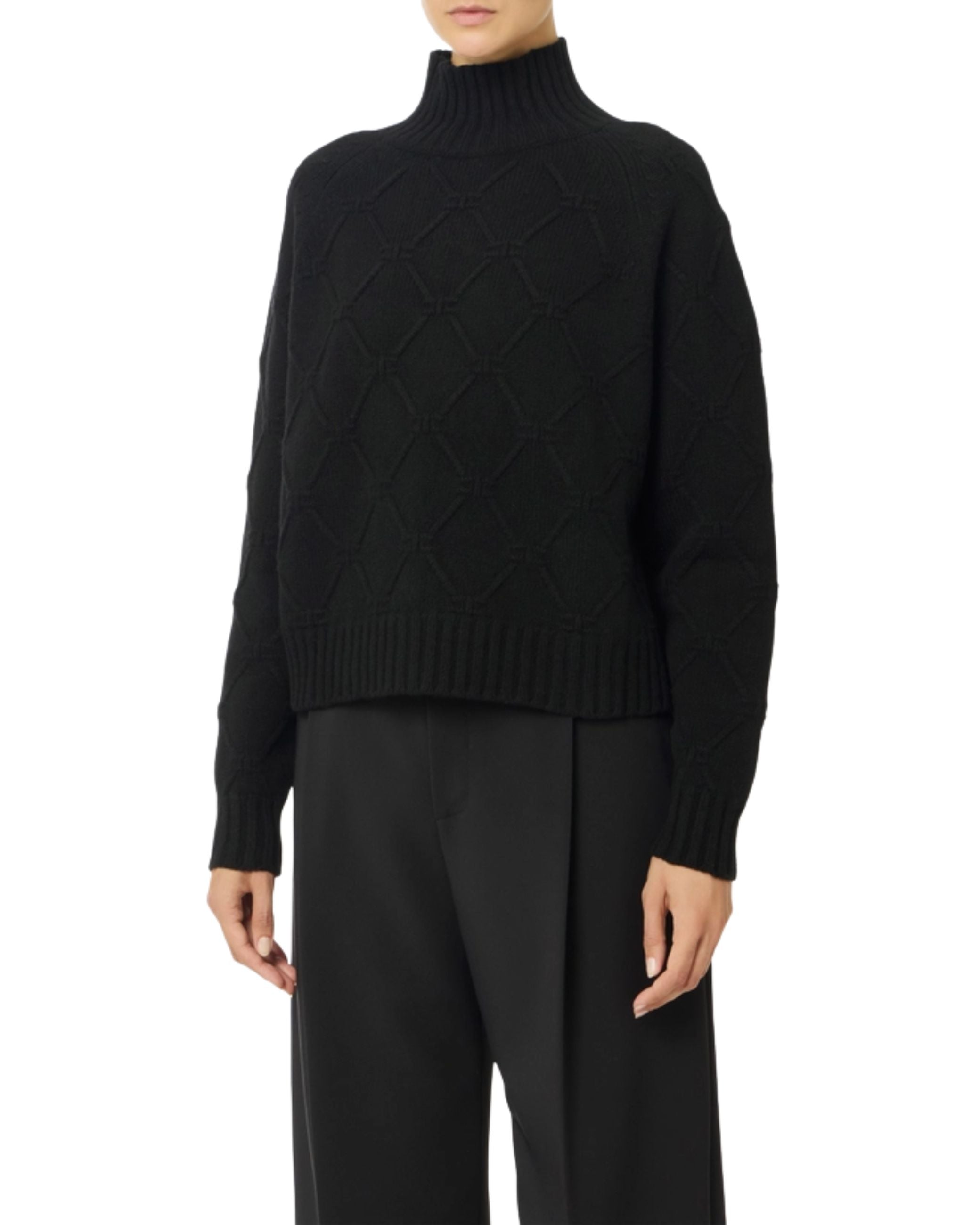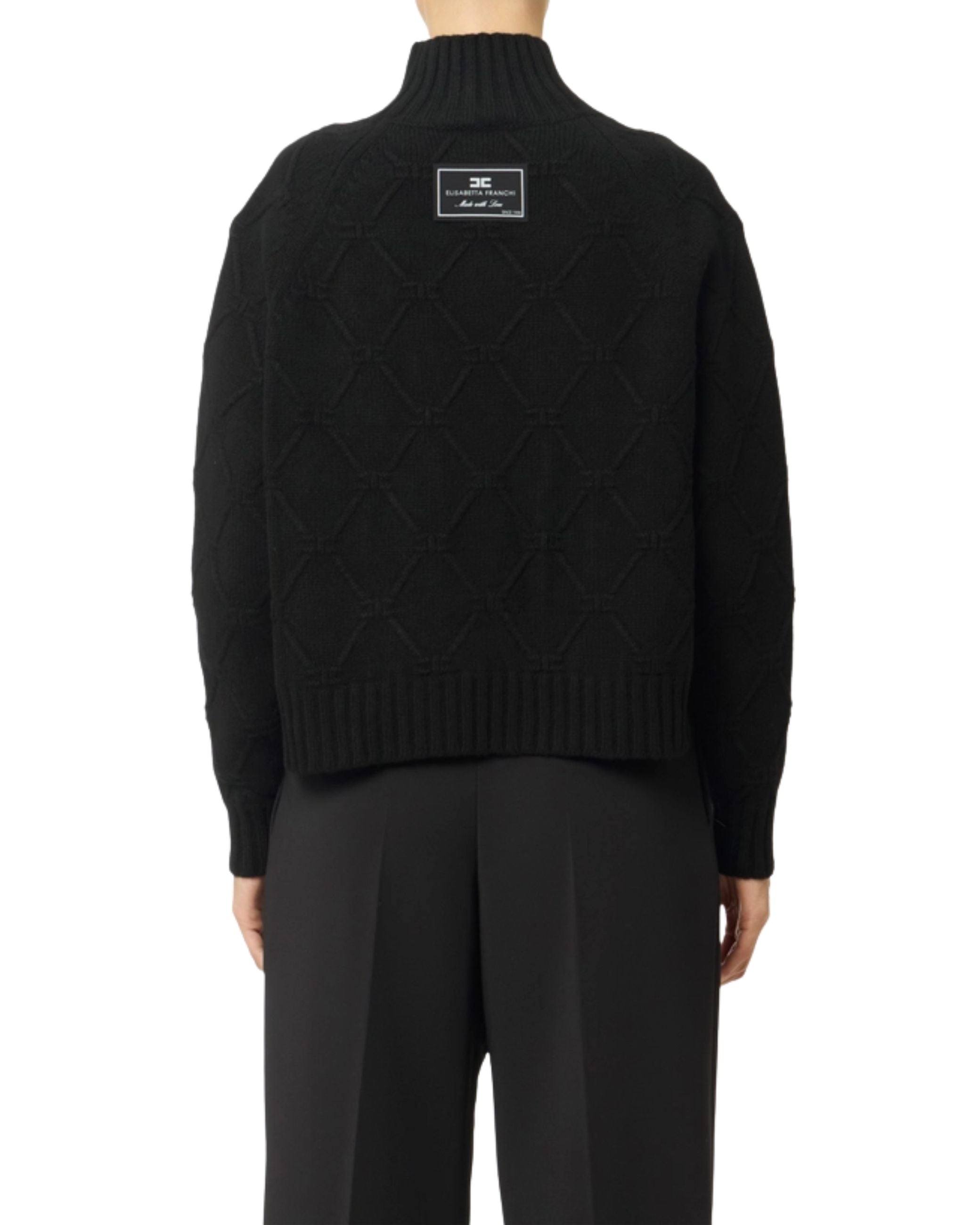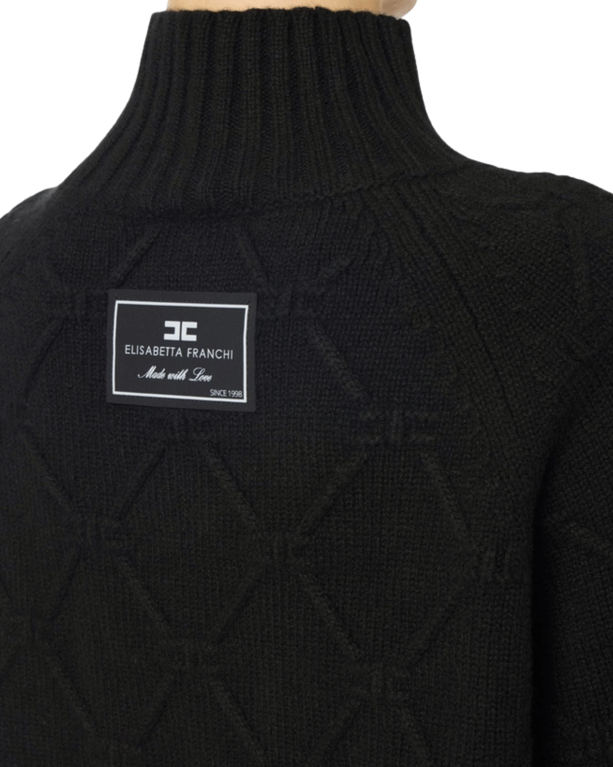 Maglia della nuova collezione fall winter 25/26 del brand Elisabetta Franchi modello collo alto dal taglio boxy caratterizzato da pattern con losanghe in trama jacquard, bordi rifinite a coste, ha una vestibilità over.