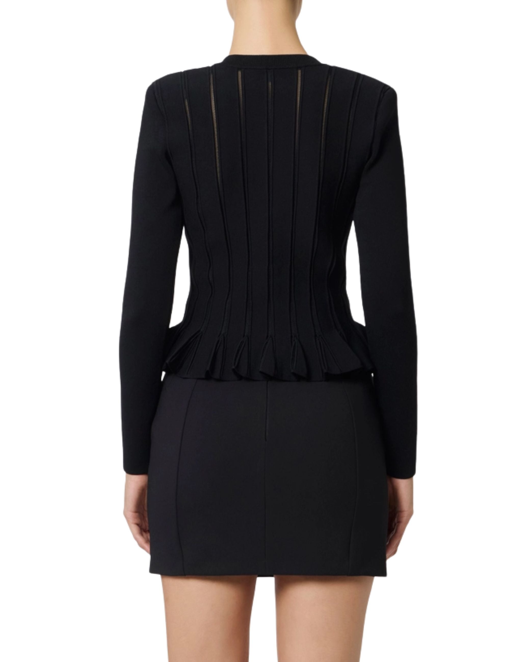Giacca in maglia della nuova collezione fall winter 25/26 del brand Elisabetta Franchi modello girocollo e maniche lunghe con particolare ricamo a jour che termina a baschina ricreano l'effetto di un bustier, i bottoni sono in metallo dorato, ha una vestibilità aderente.