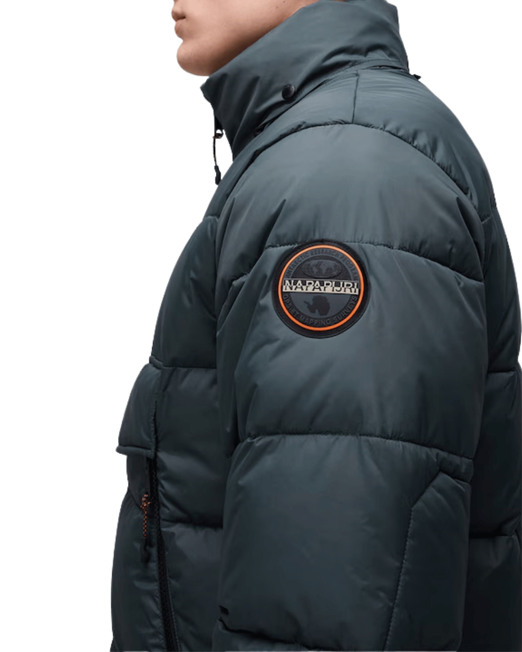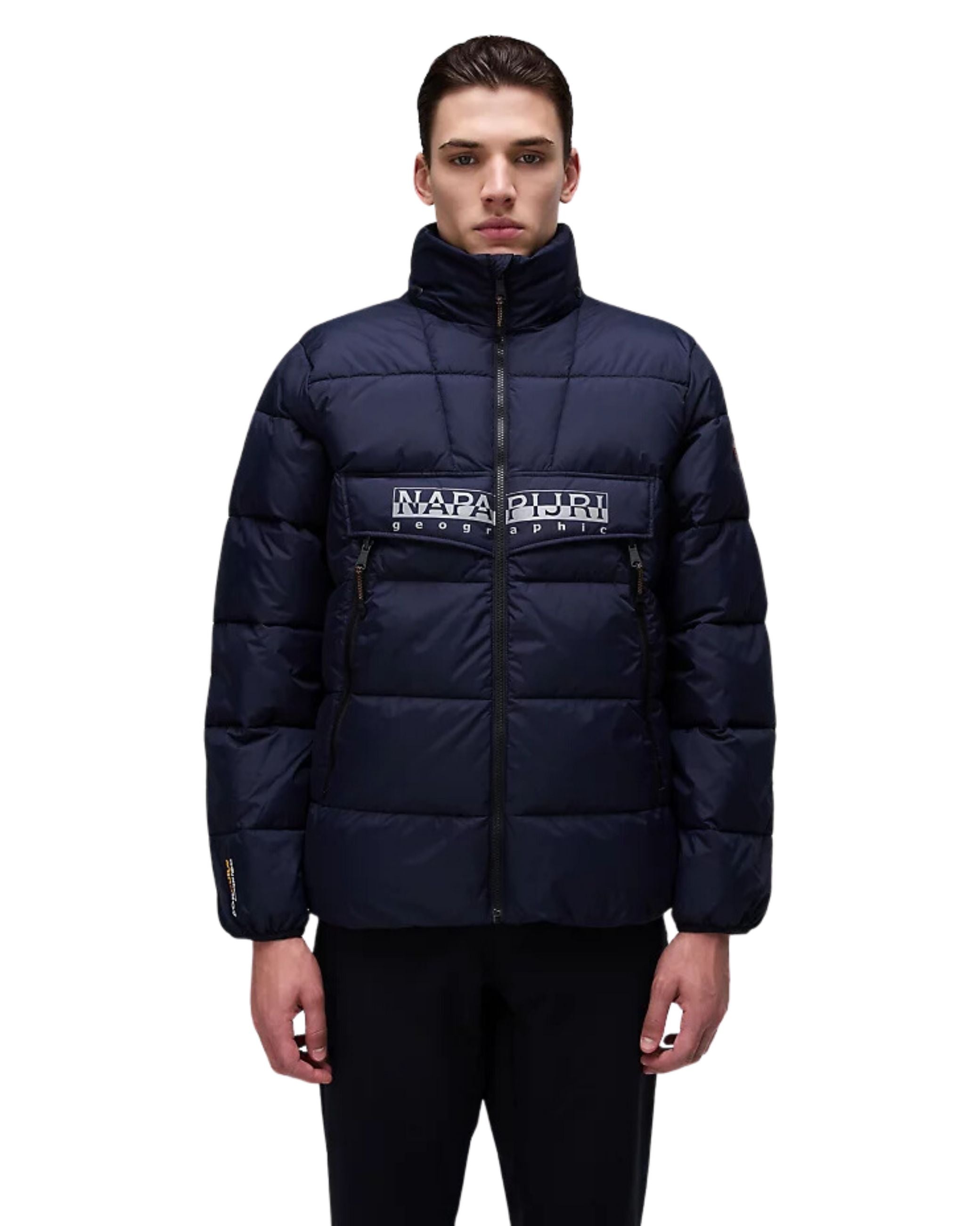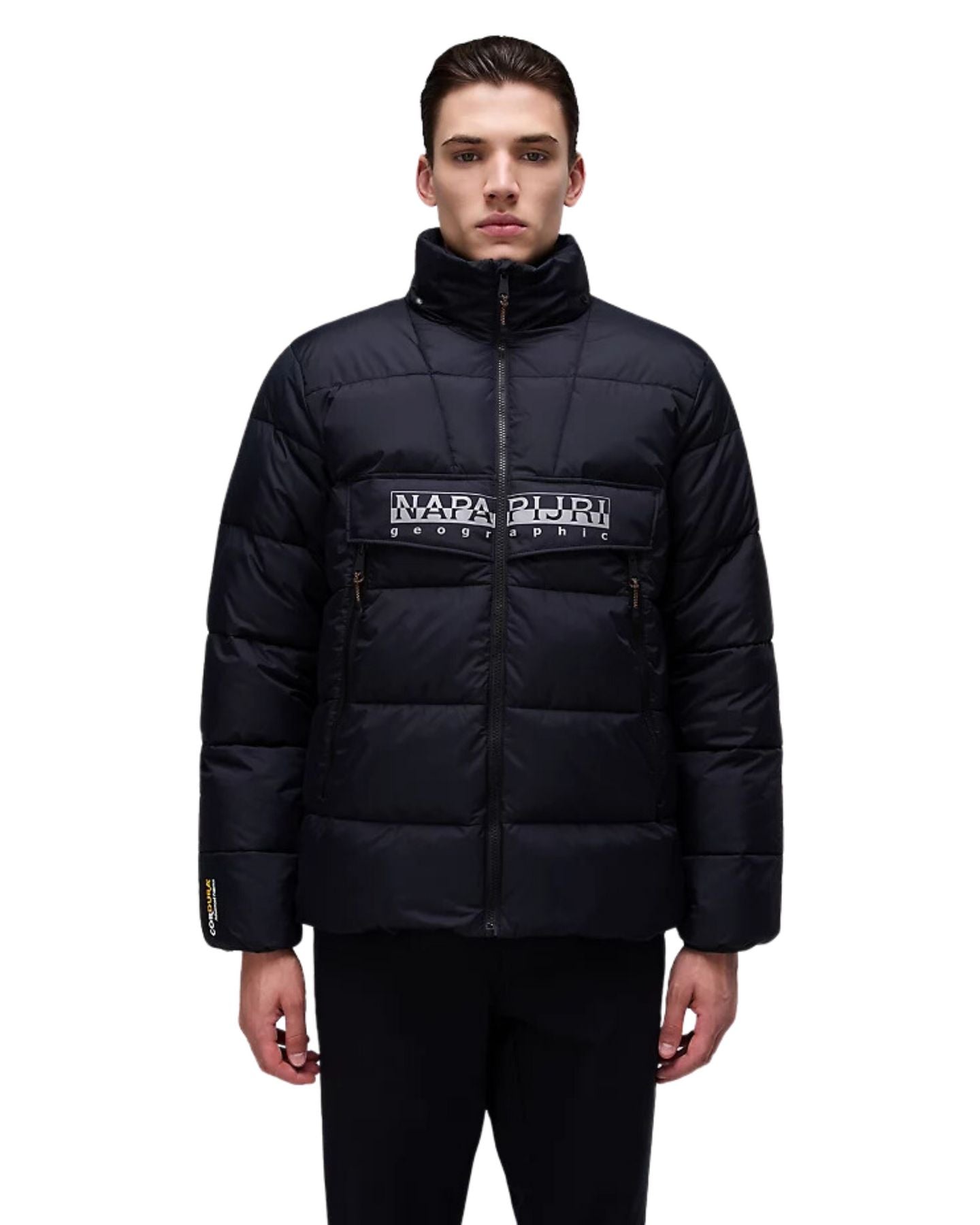 Giubbino della collezione fall winter 24/25 del brand Napapijri modello RF-Puffer Open senza cappuccio e con collo alto, ha tasche laterali, chiusura zip, decorato sul davanti da patta cucita con ricamo logo.