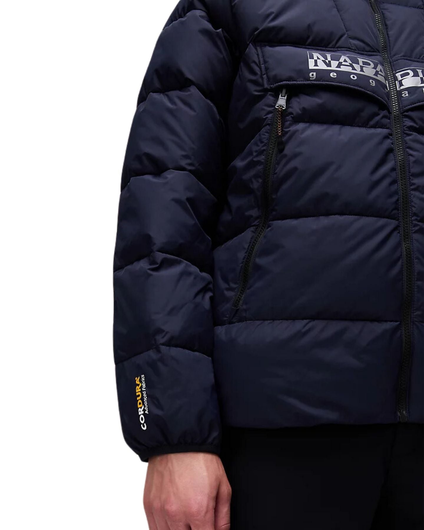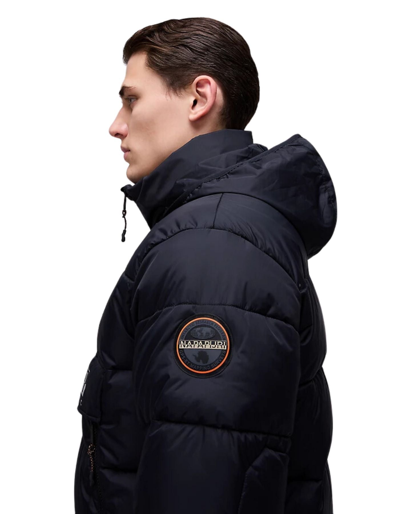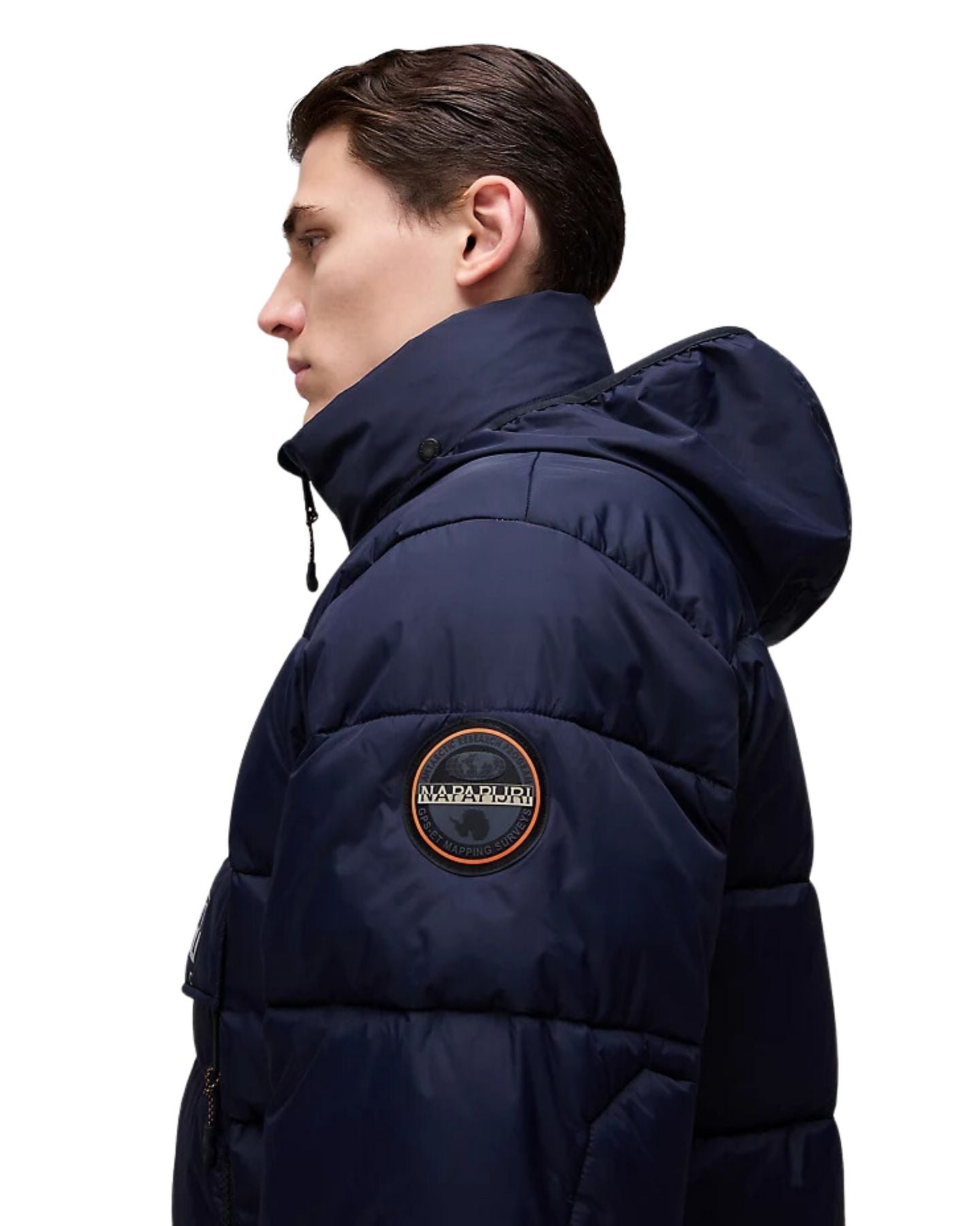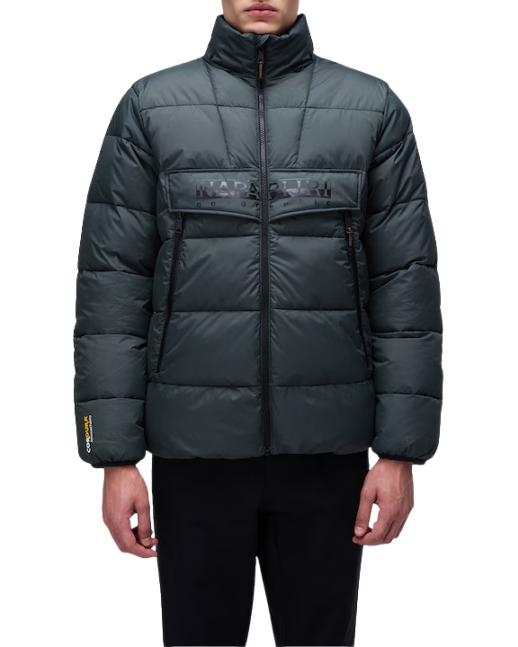 Giubbino della collezione fall winter 24/25 del brand Napapijri modello RF-Puffer Open senza cappuccio e con collo alto, ha tasche laterali, chiusura zip, decorato sul davanti da patta cucita con ricamo logo.