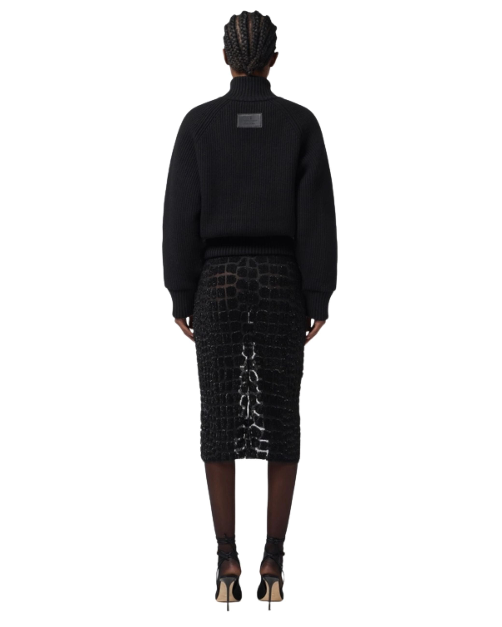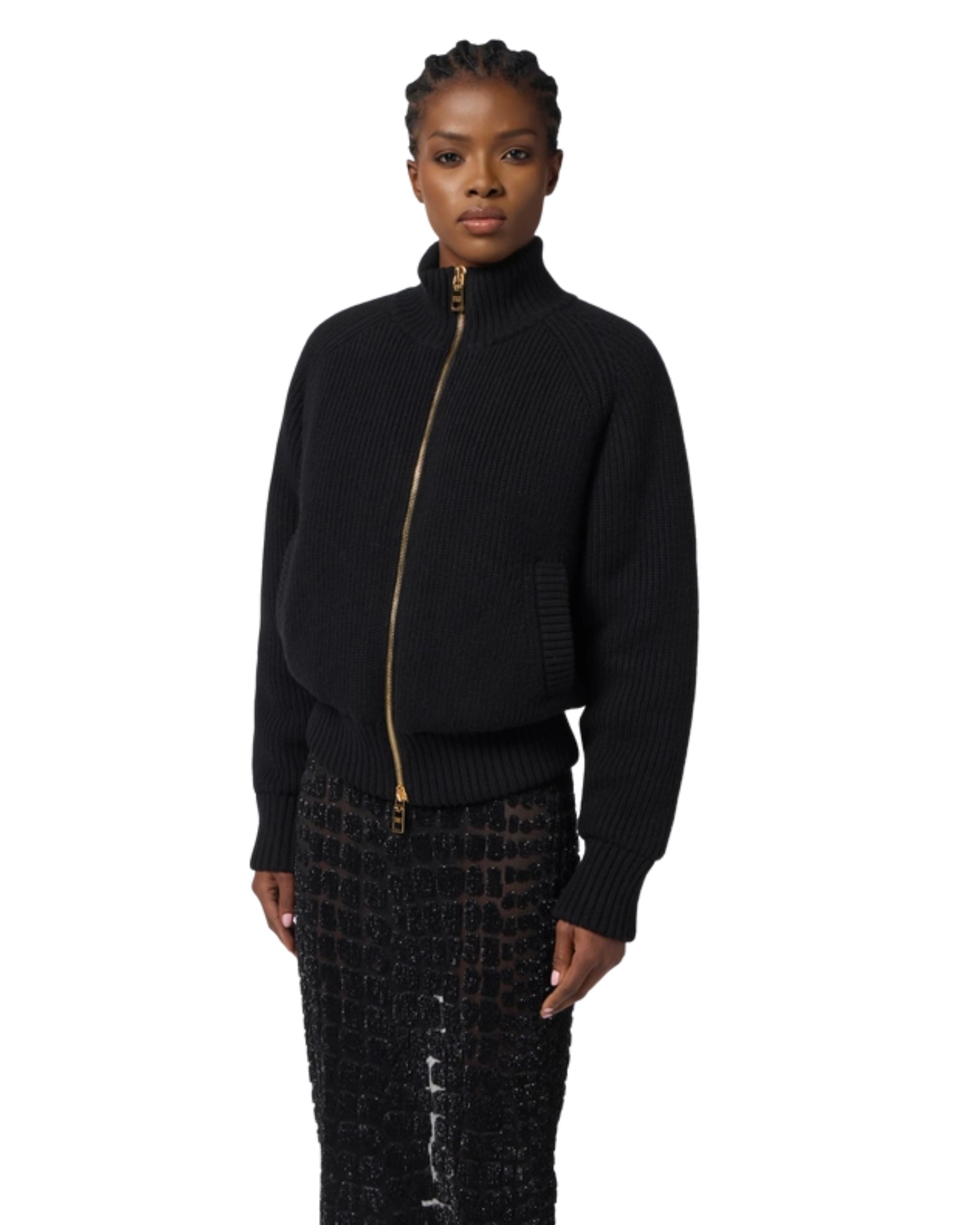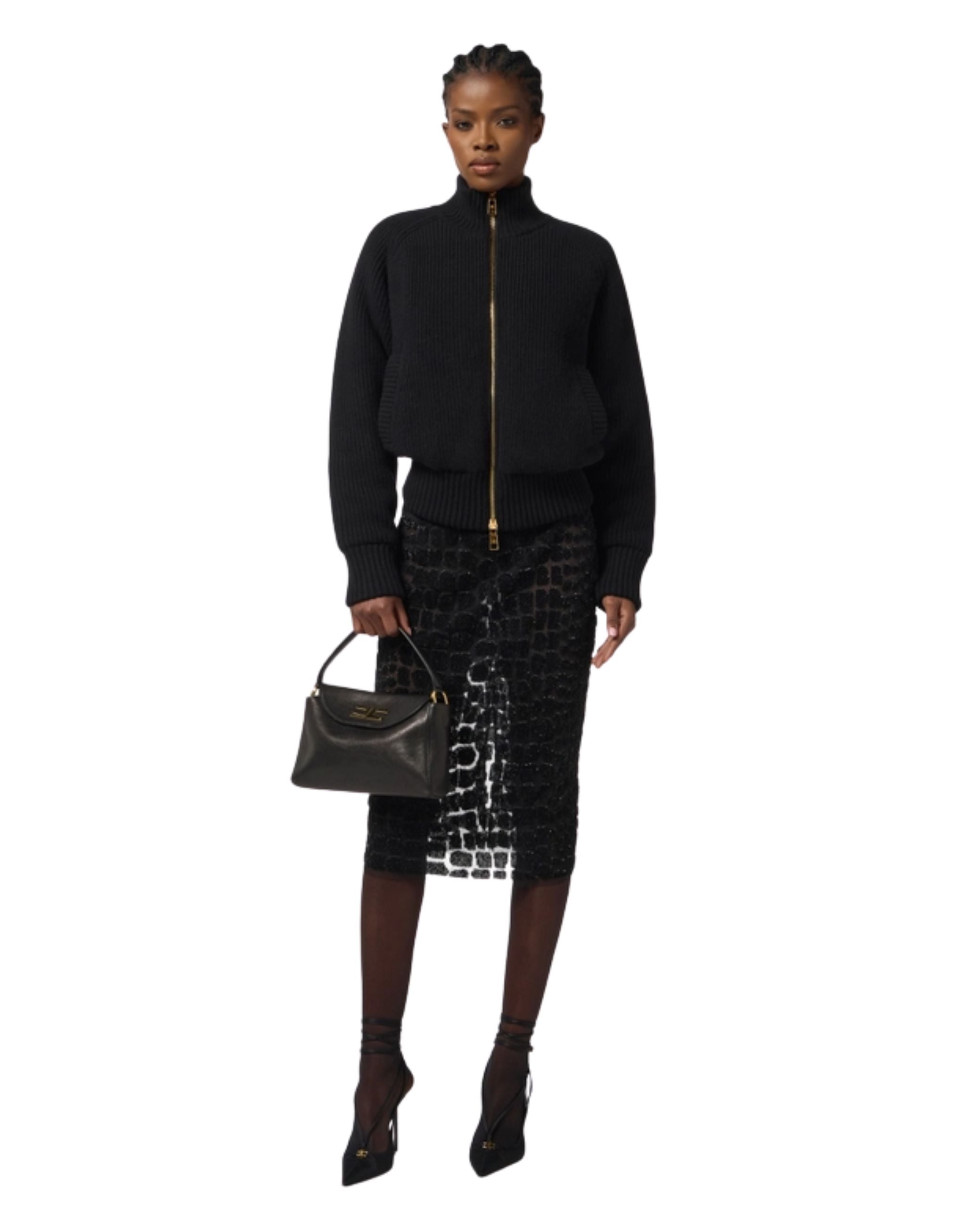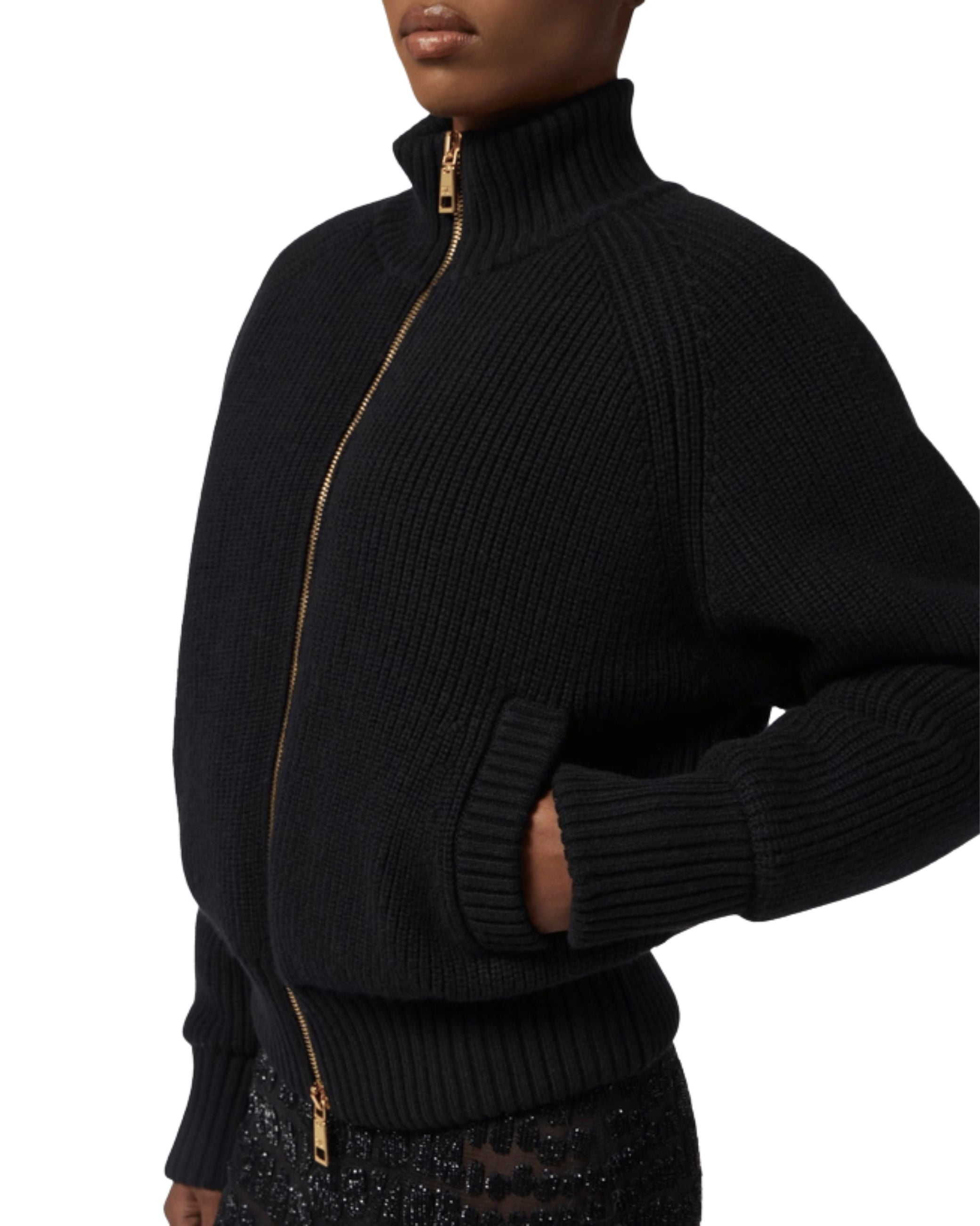 Bomber in maglia della nuova collezione Elisabetta Franchi fall winter 25/26 dalla vestibilità over, comoda e avvolgente. Modello caratterizzato da collo alto, maniche raglan, tasche a filo e chiusura zip colore oro.