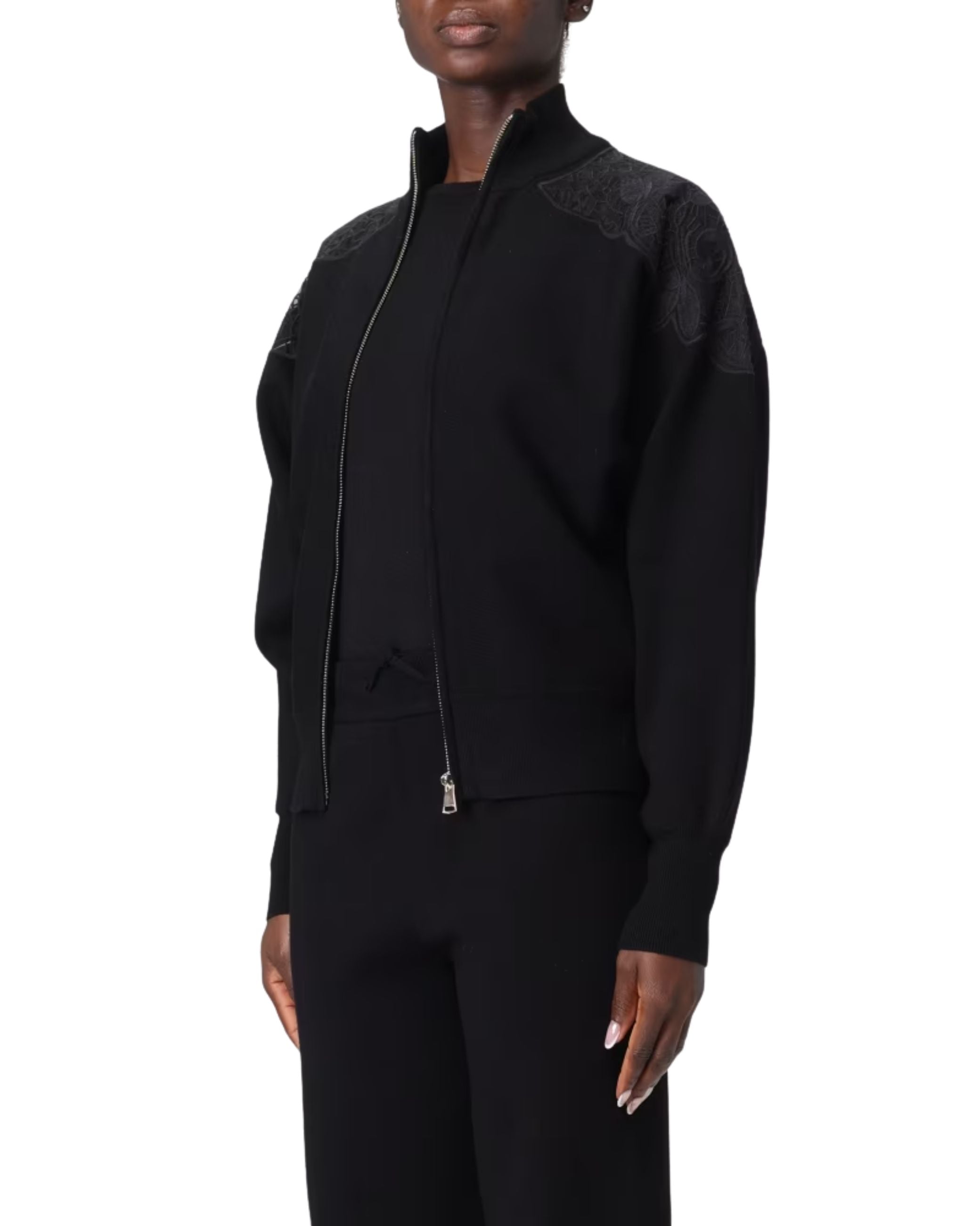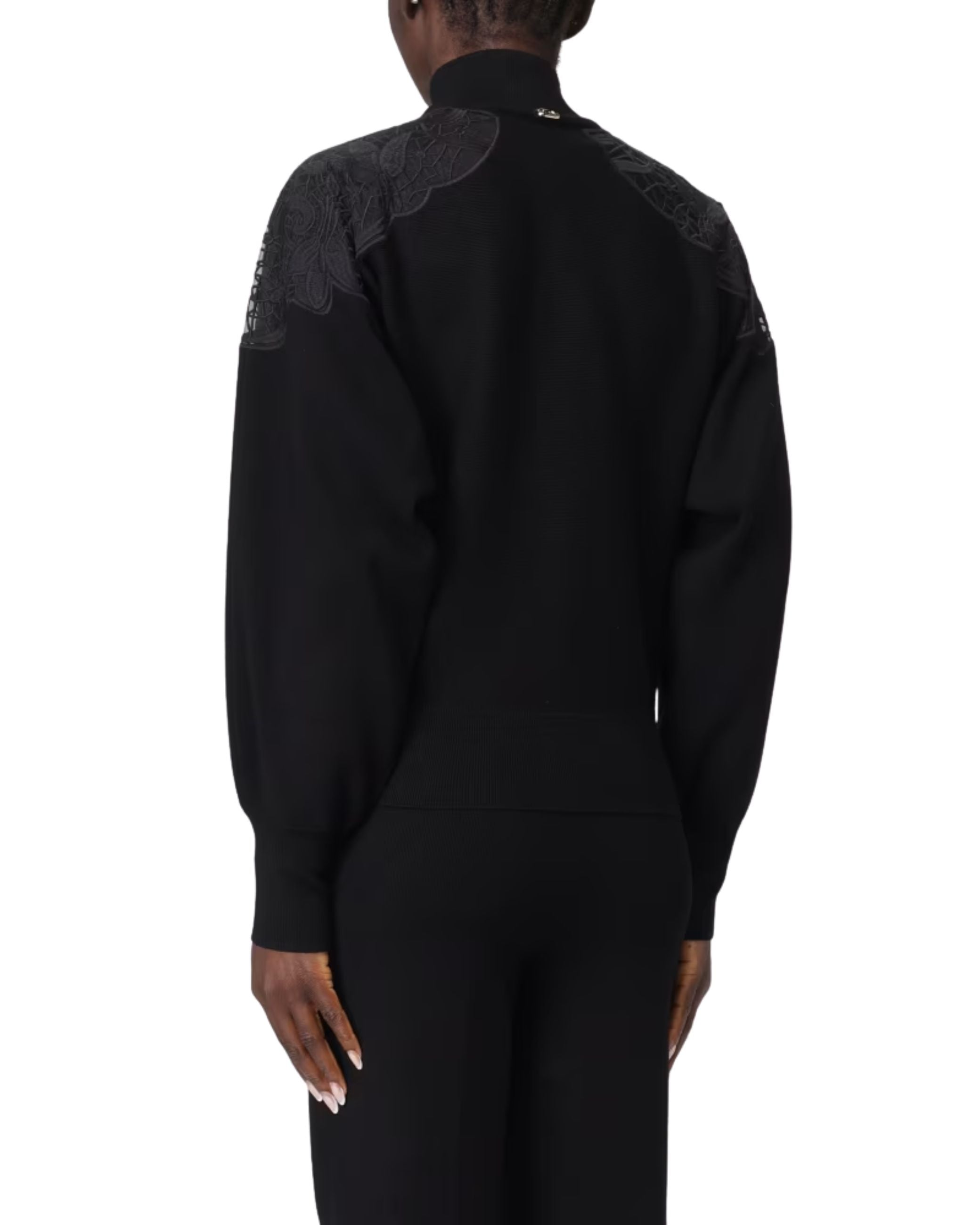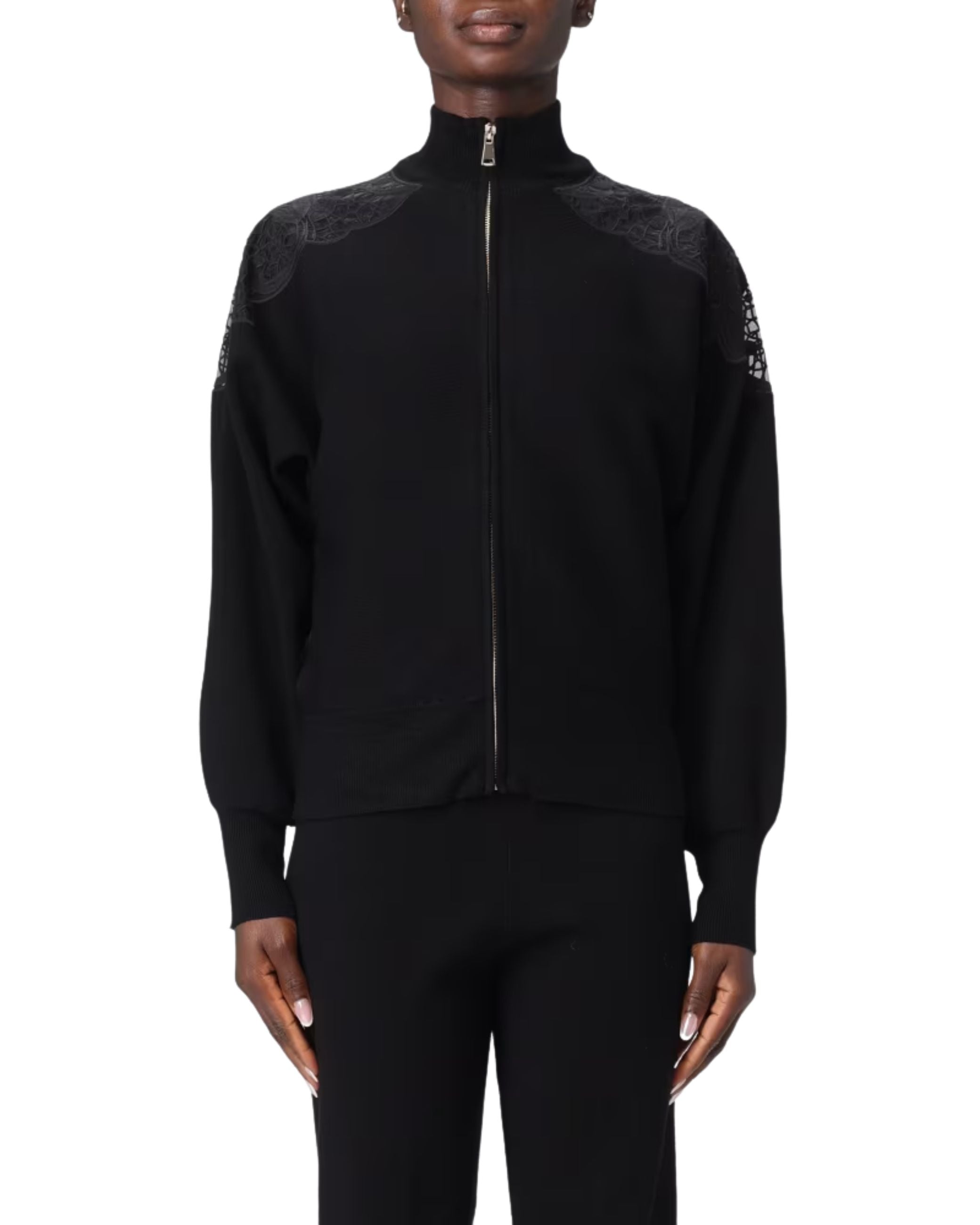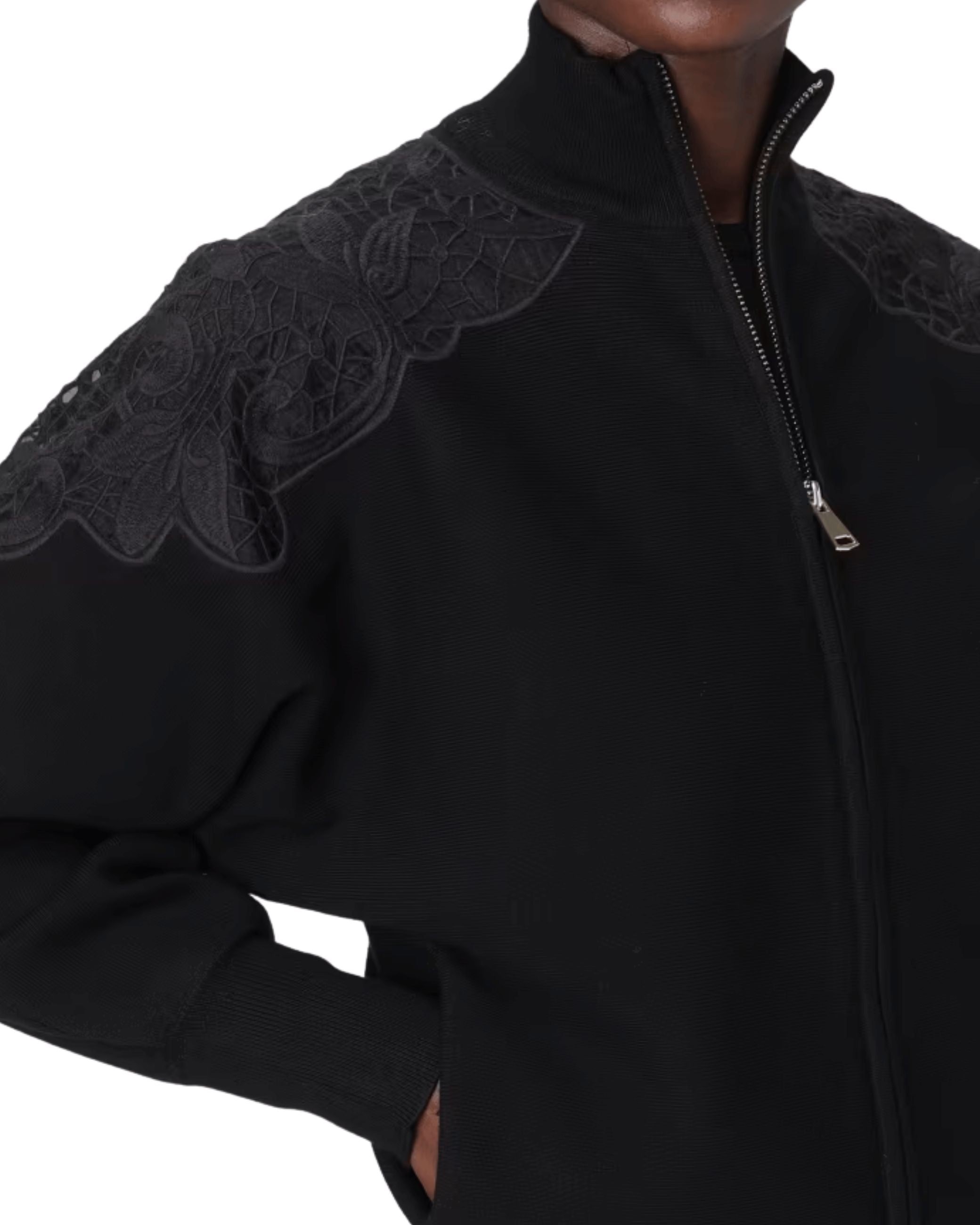 Giacca maglia della nuova collezione fall winter 25/26 di Twinset dal tessuto con lavorazione rasata, inserti ricamati in organza sulle spalle, collo lupetto, chiusura con zip, linea morbida.