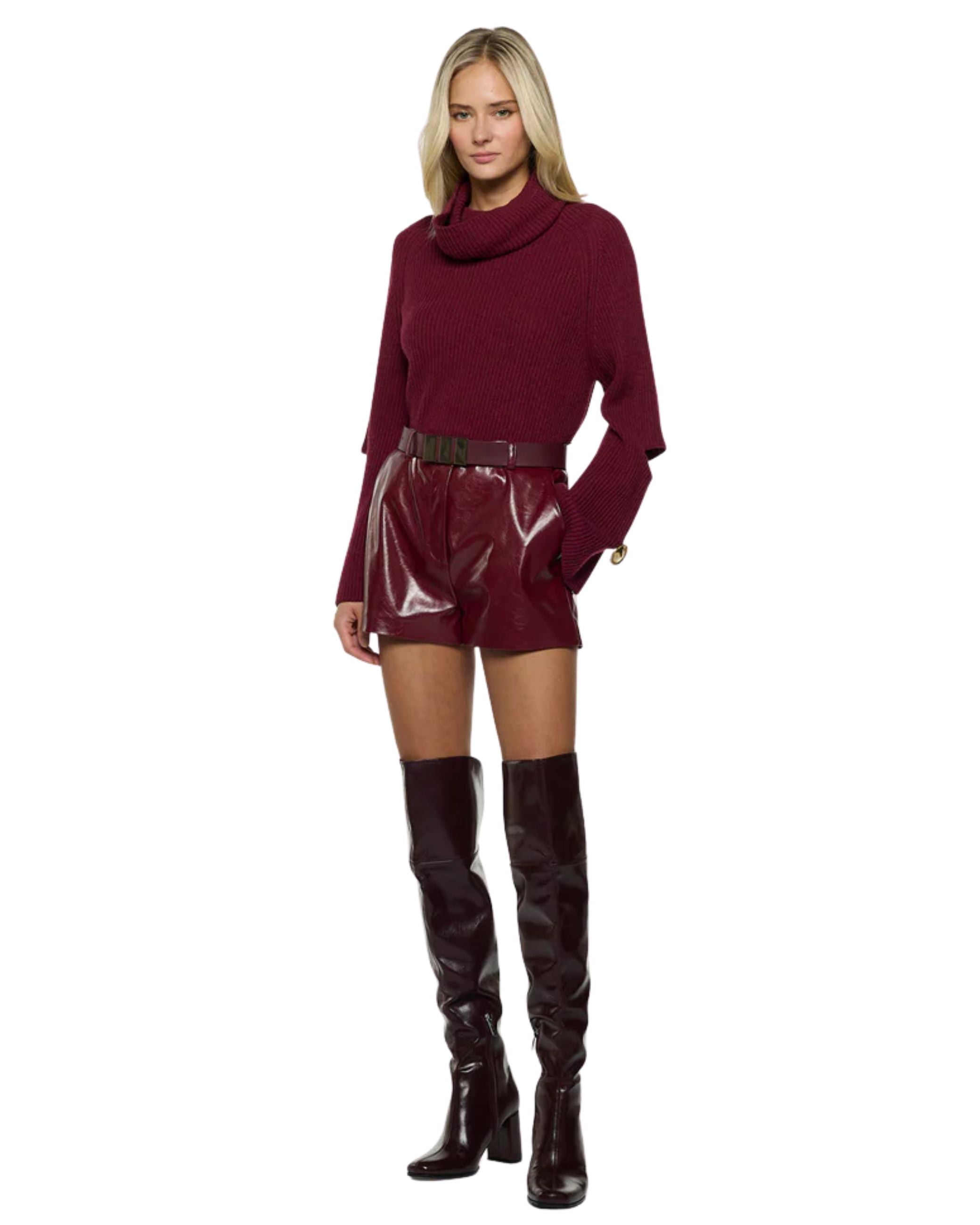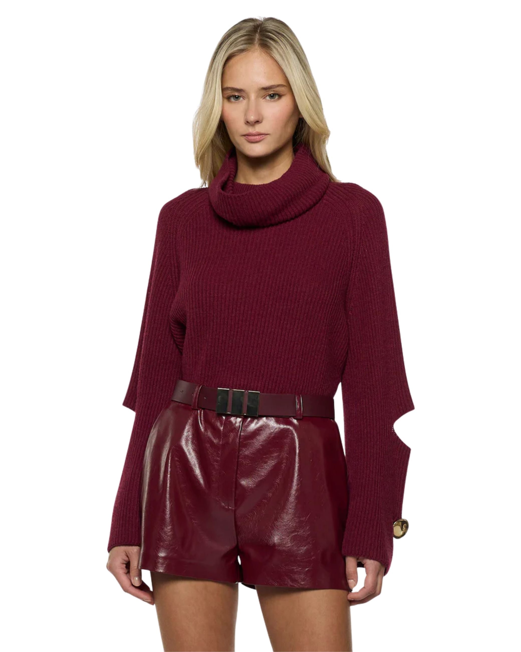 Maglia della nuova collezione fall winter 25/26 di Simona Corsellini realizzata in misto lana con collo alto e morbido, lavorazione a costine, maniche lunghe con aperture sui gomiti.