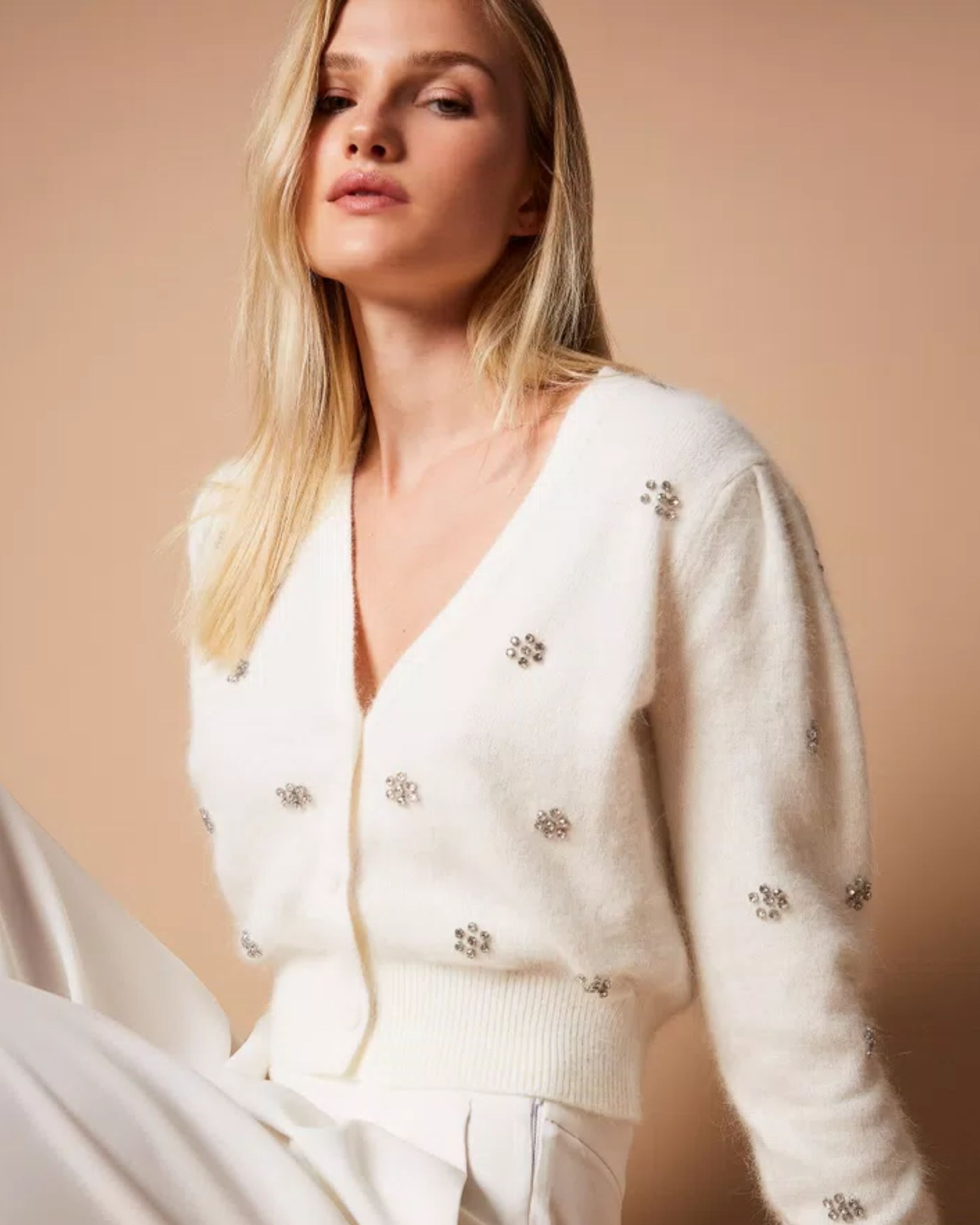 Cardigan della nuova collezione fall winter 25/26 di Twinset realizzato in misto angora e preziose applicazioni a forma di fiore, ha scollo V e una linea morbida.