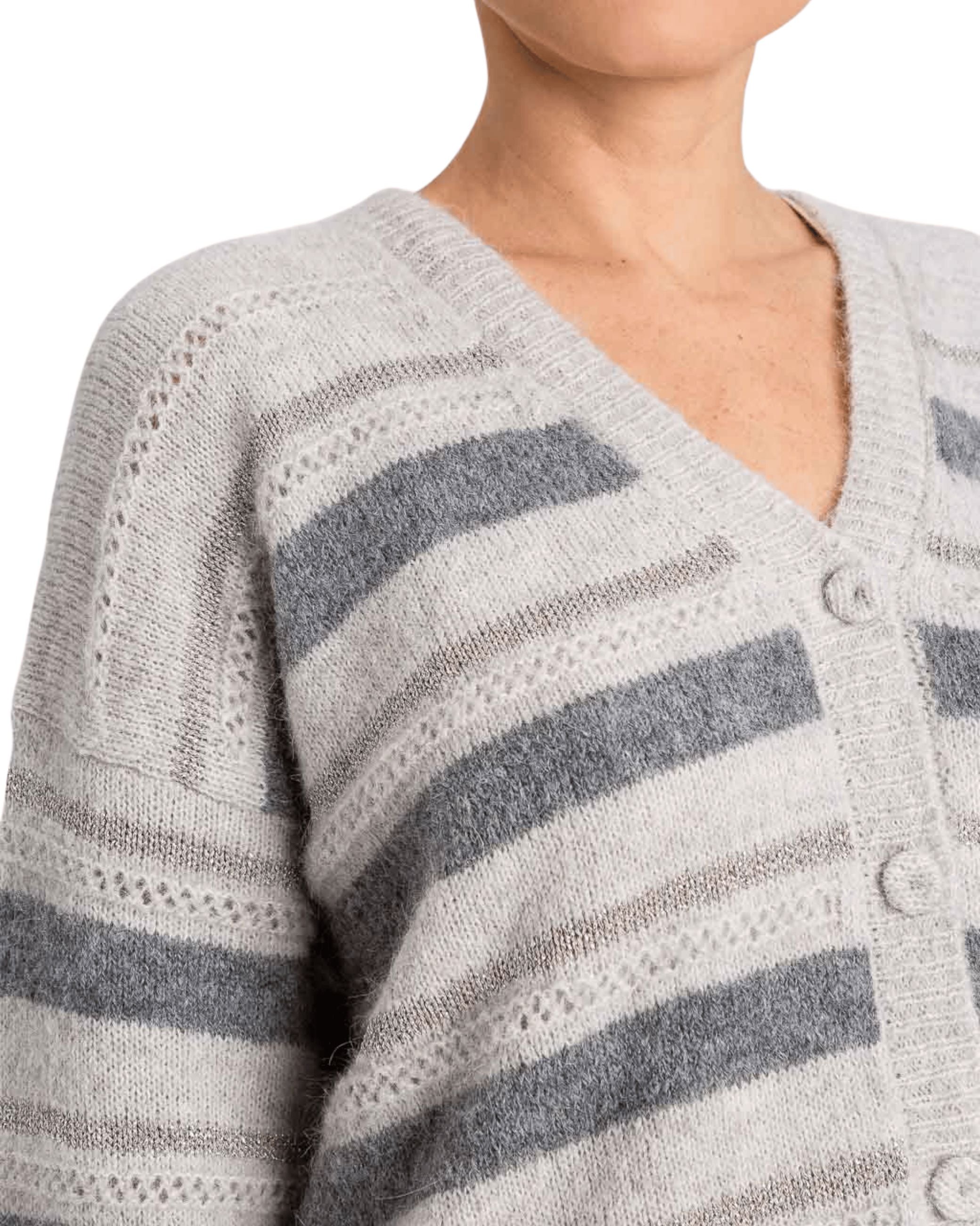 Cardigan della nuova collezione fall winter 25/26 di Twinset realizzato in misto alpaca con righe orizzontali, scollo V, bordi rifiniti a coste, ha una linea morbida.