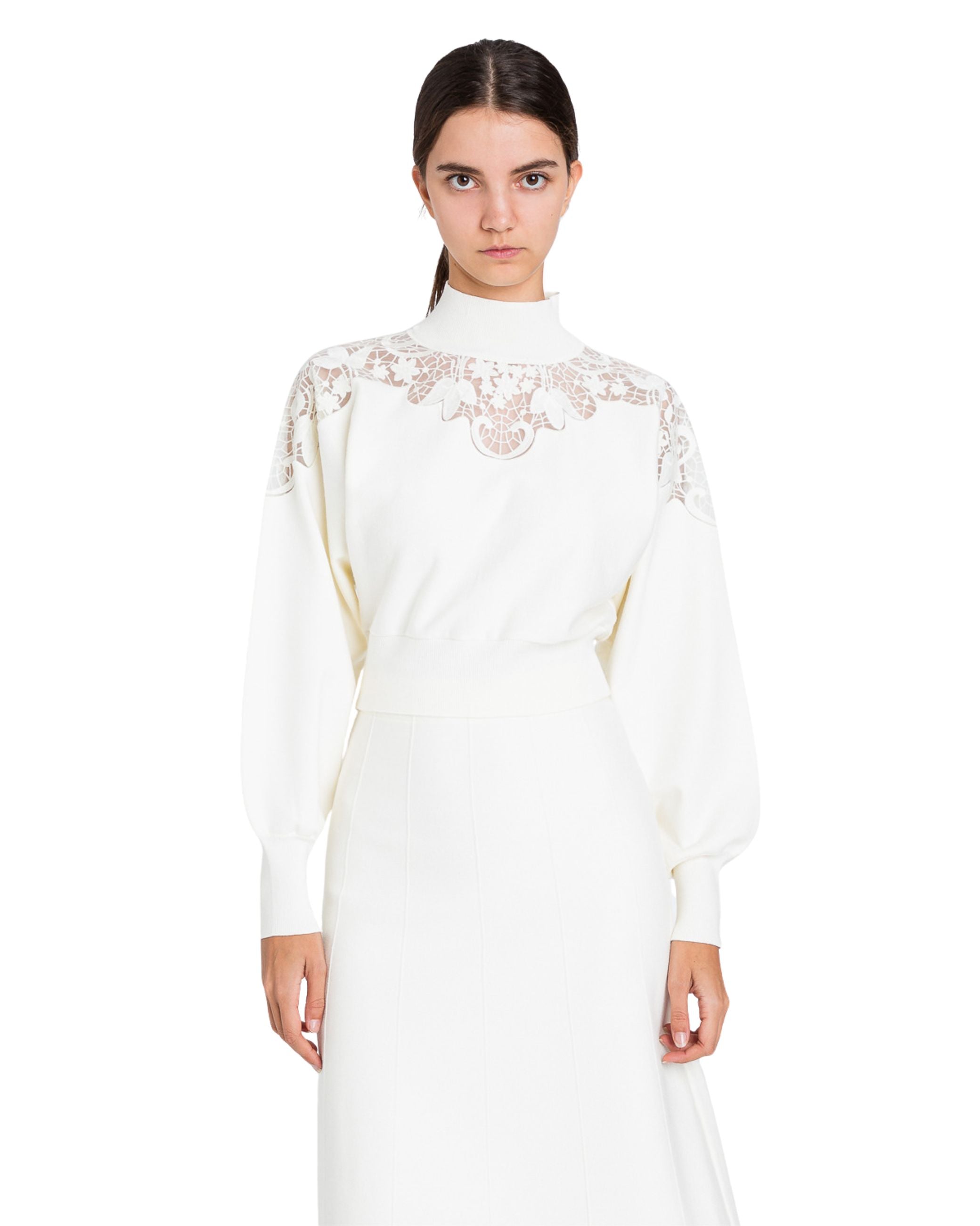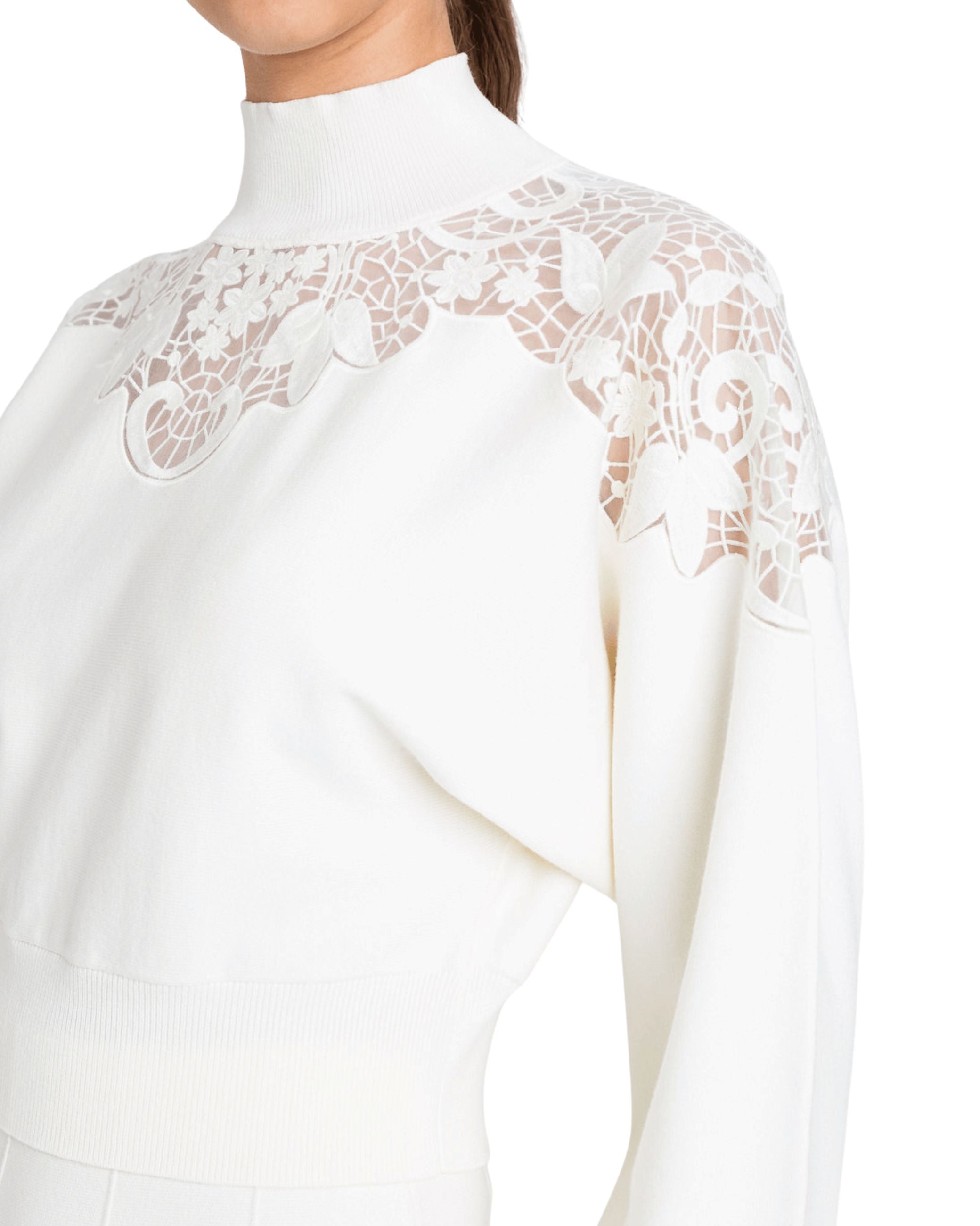 Maglia della nuova collezione fall winter 25/26 di Twinset modello cropped con ricami in pizzo sulle spalle, collo lupetto, profili rifiniti a costie, apertura a goccia sul retro, chiusura con bottoni sul retro.