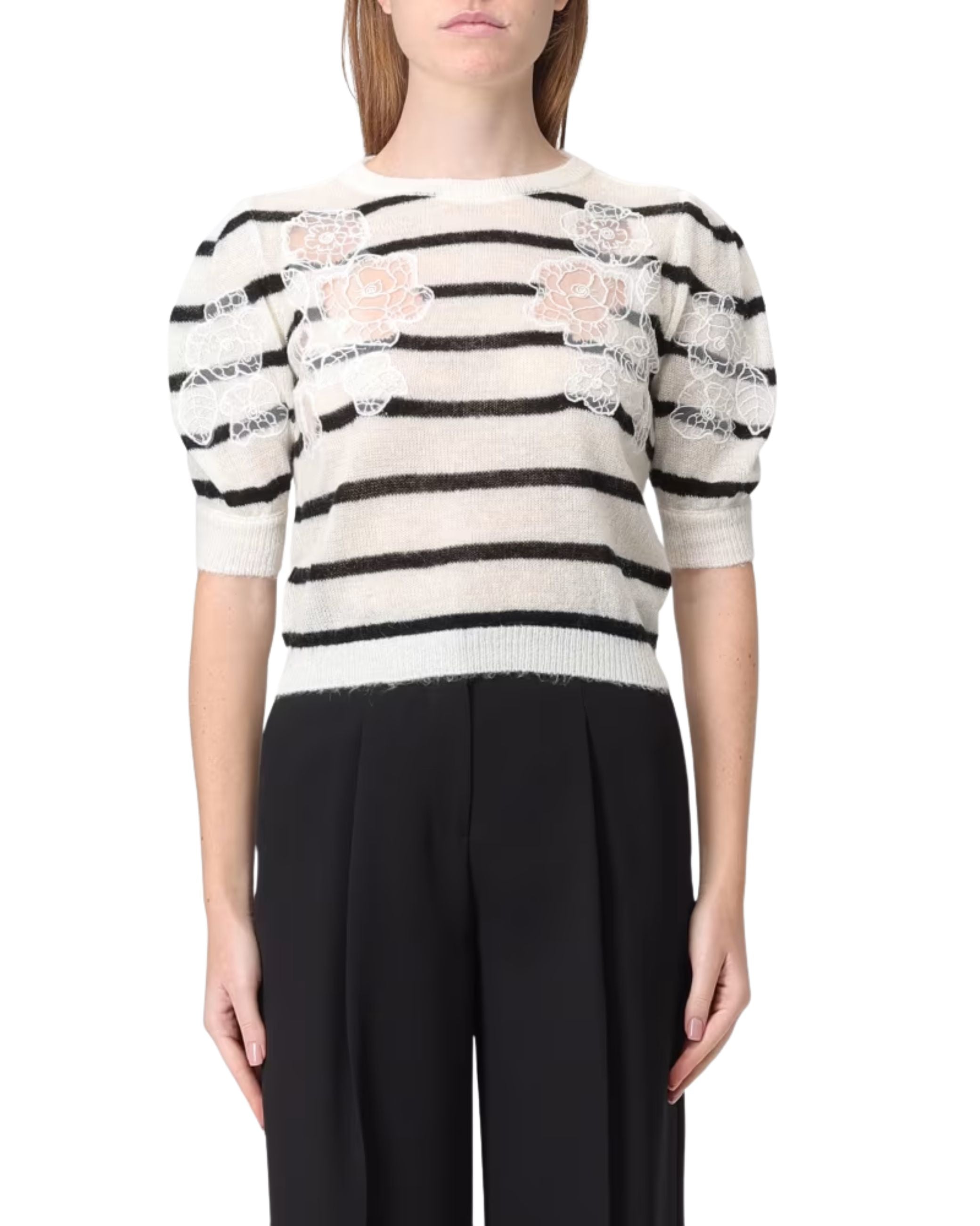 Maglia della nuova collezione fall winter 25/26 di Twinset realizzata in misto mohair, tessuto con motivo bicolore e inserti in pizzo che ricreano un disegno floreale, collo tondo, maniche corte.