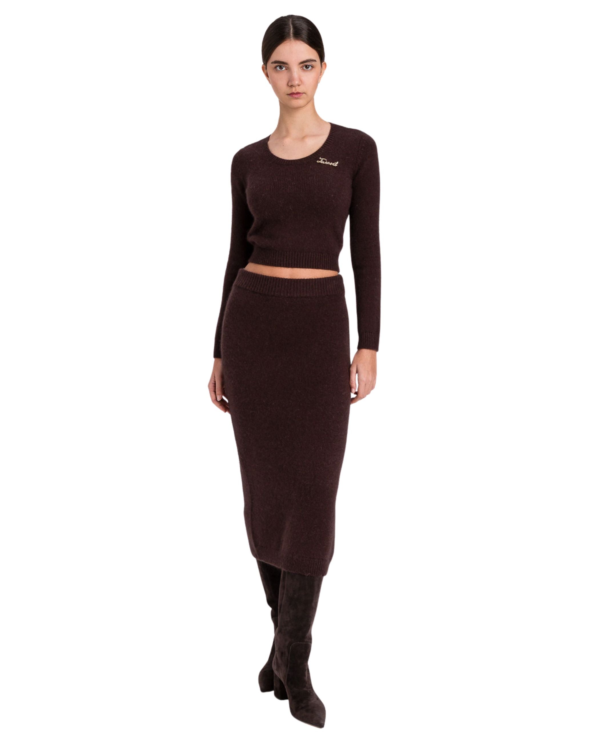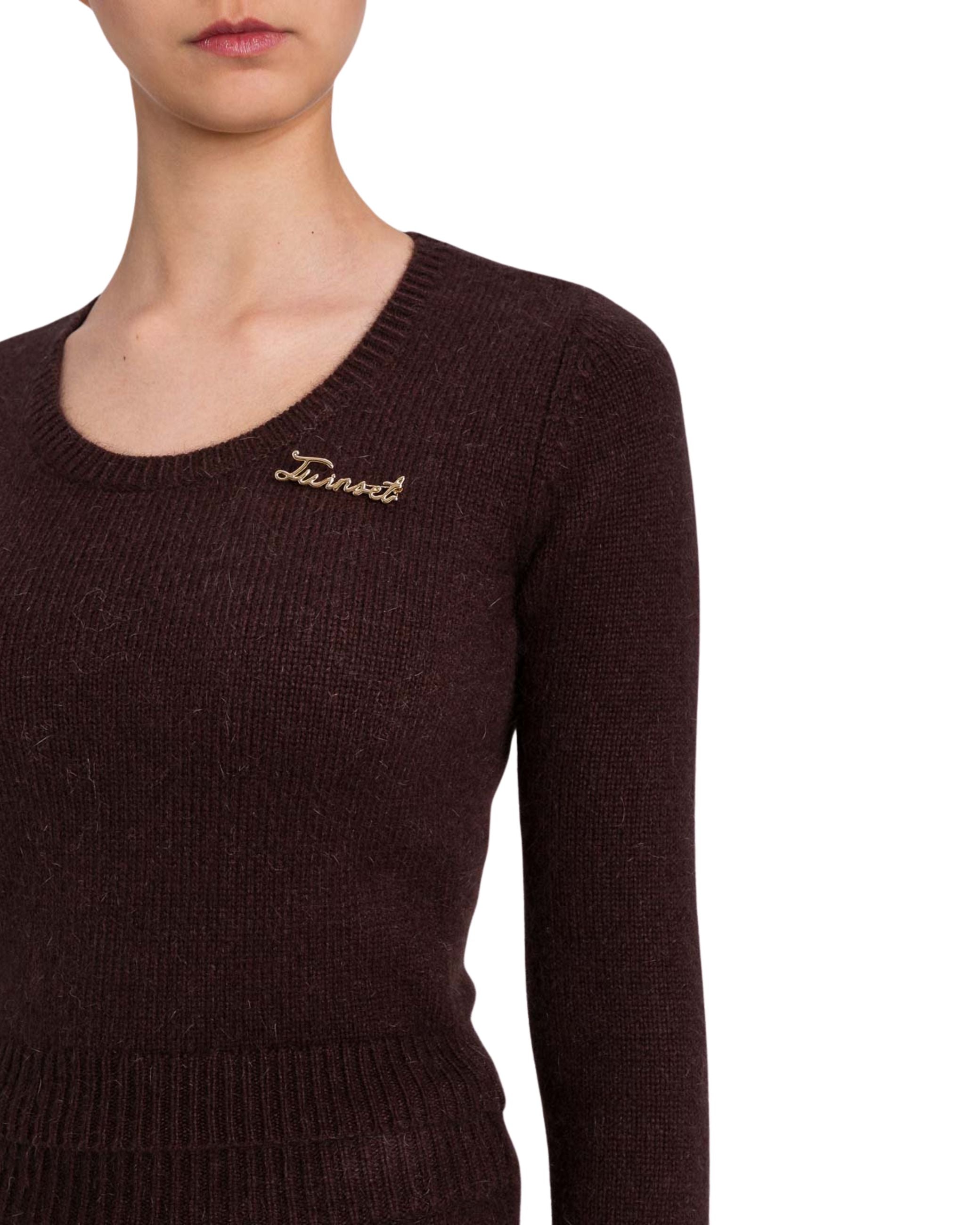 Maglia della nuova collezione fall winter 25/26 di Twinset modello cropped realizzato in angora, bordi rifiniti a coste, impreziosita da spilla logo colore oro, ha una linea fitted.