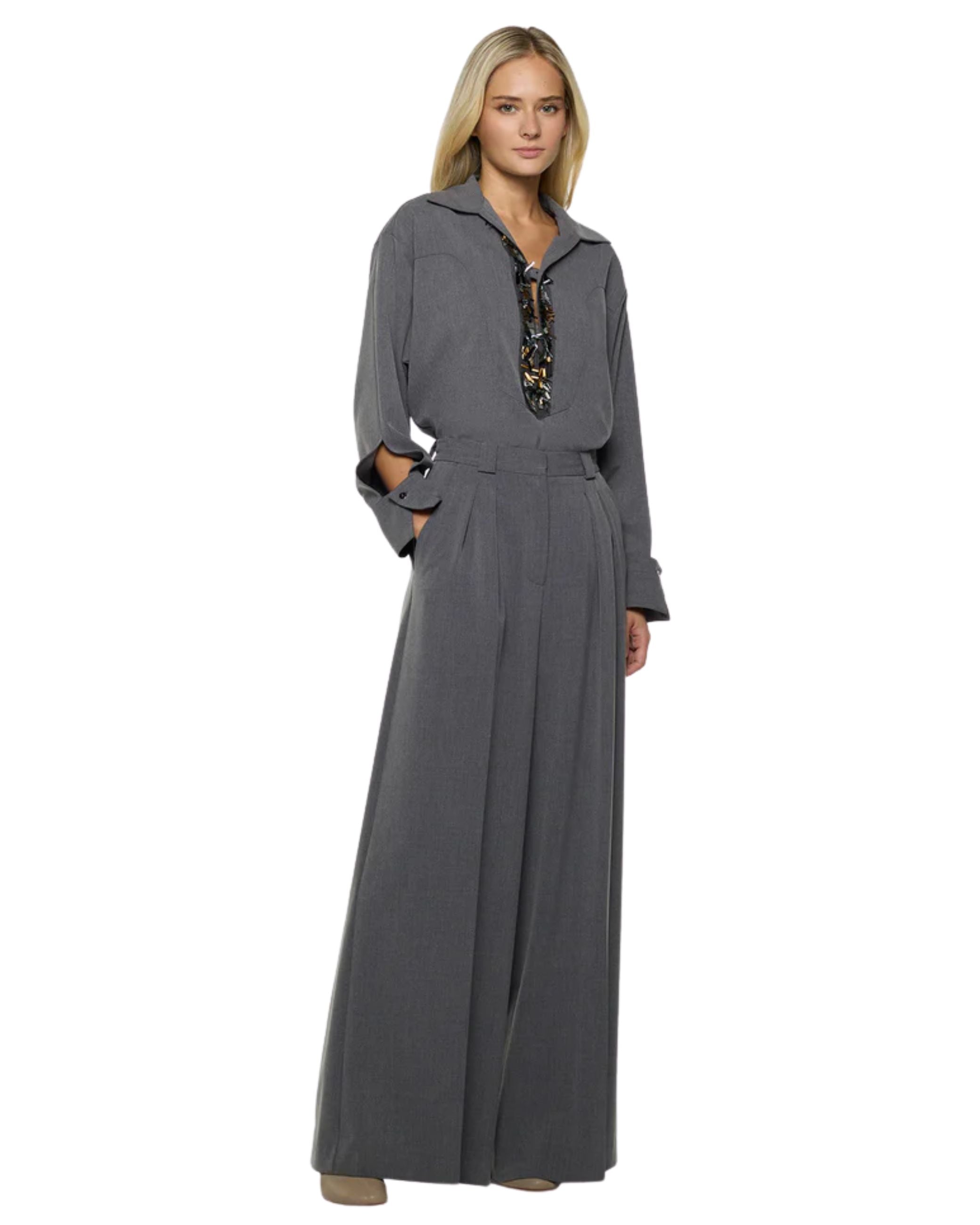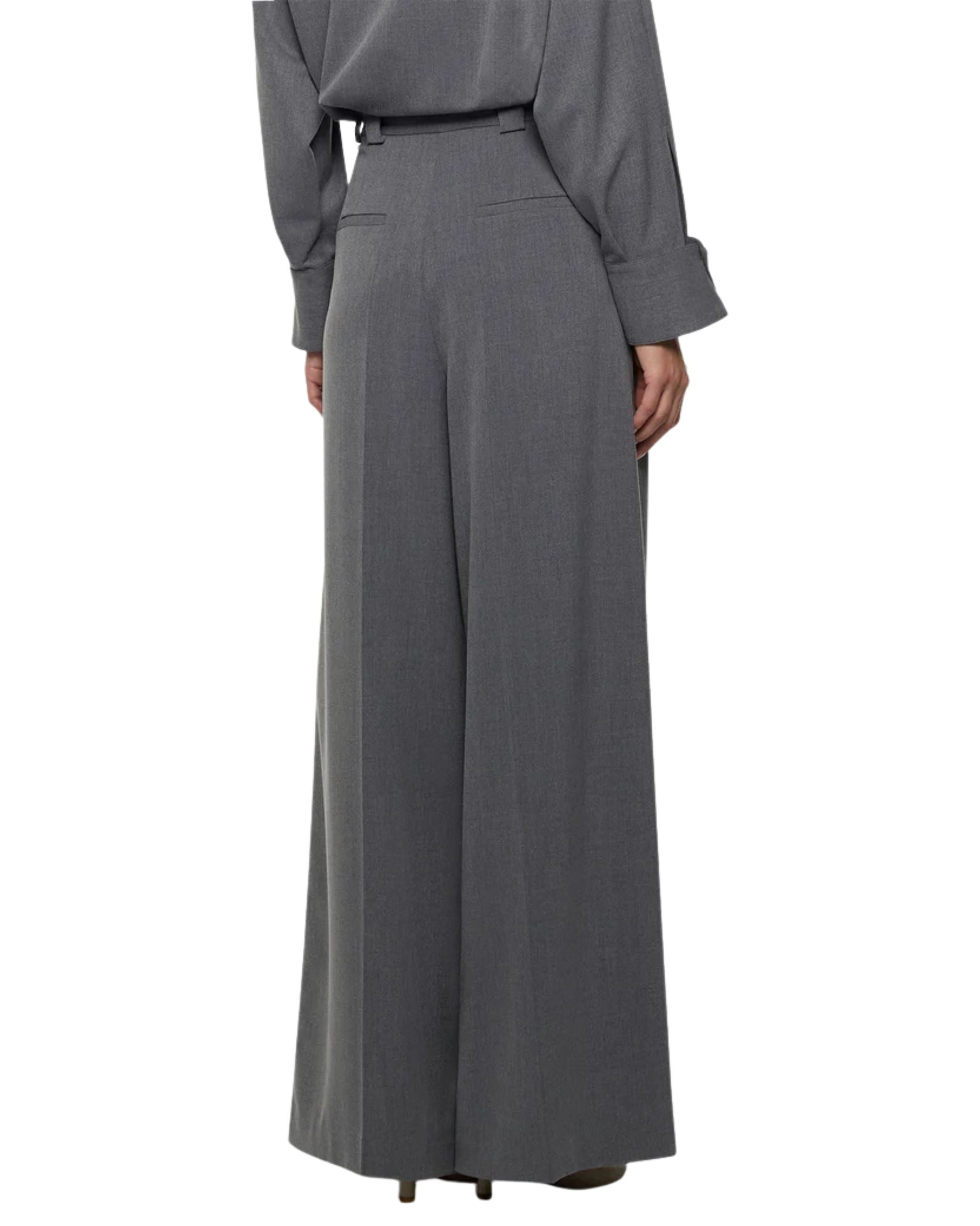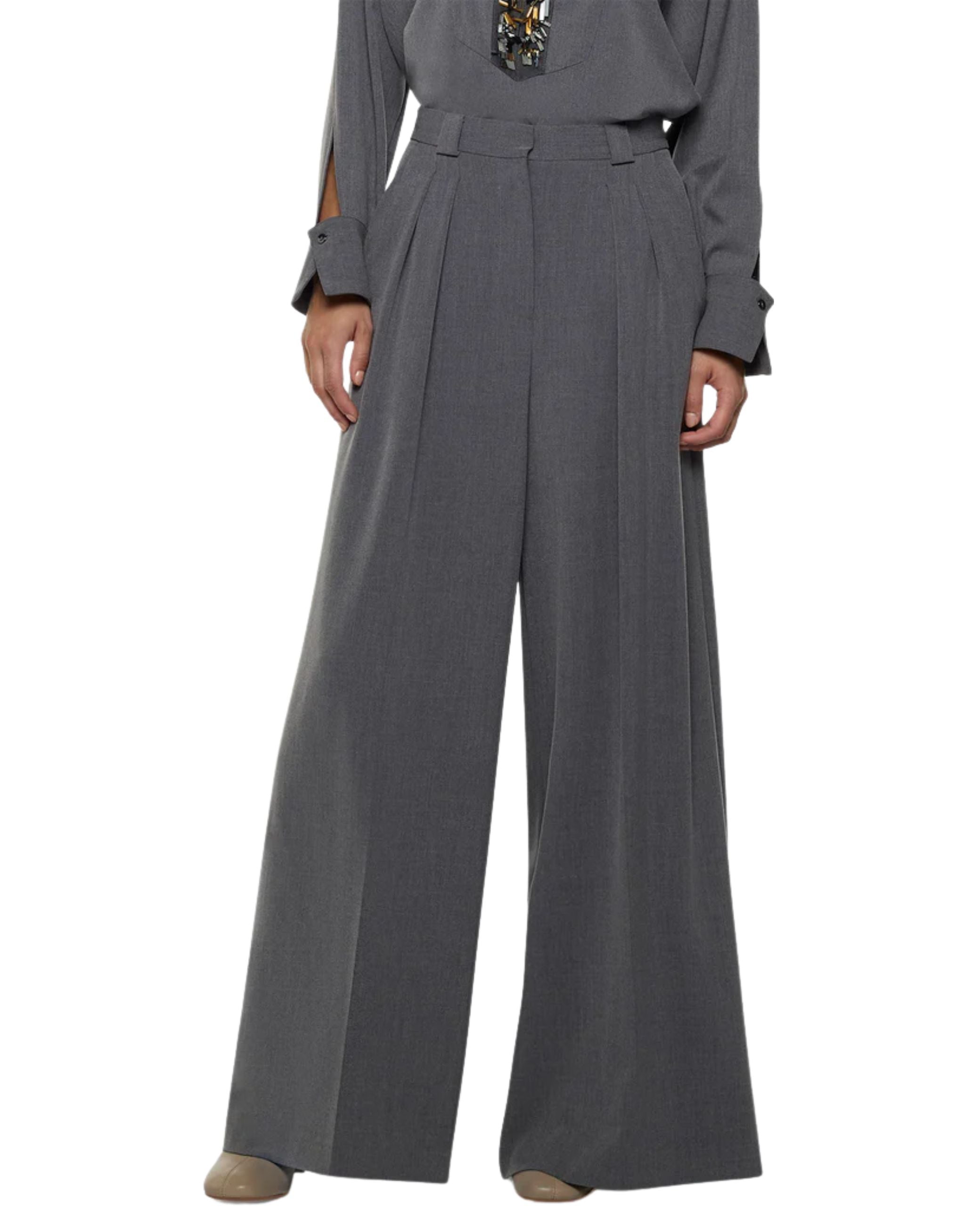 Pantalone della nuova collezione fall winter 25/26 di Simona Corsellini modello ampio caratterizzato da pinces e doppia piega, tasche laterali e finte tasco a filo sul retro, ha chiusura frontale con bottone e zip.