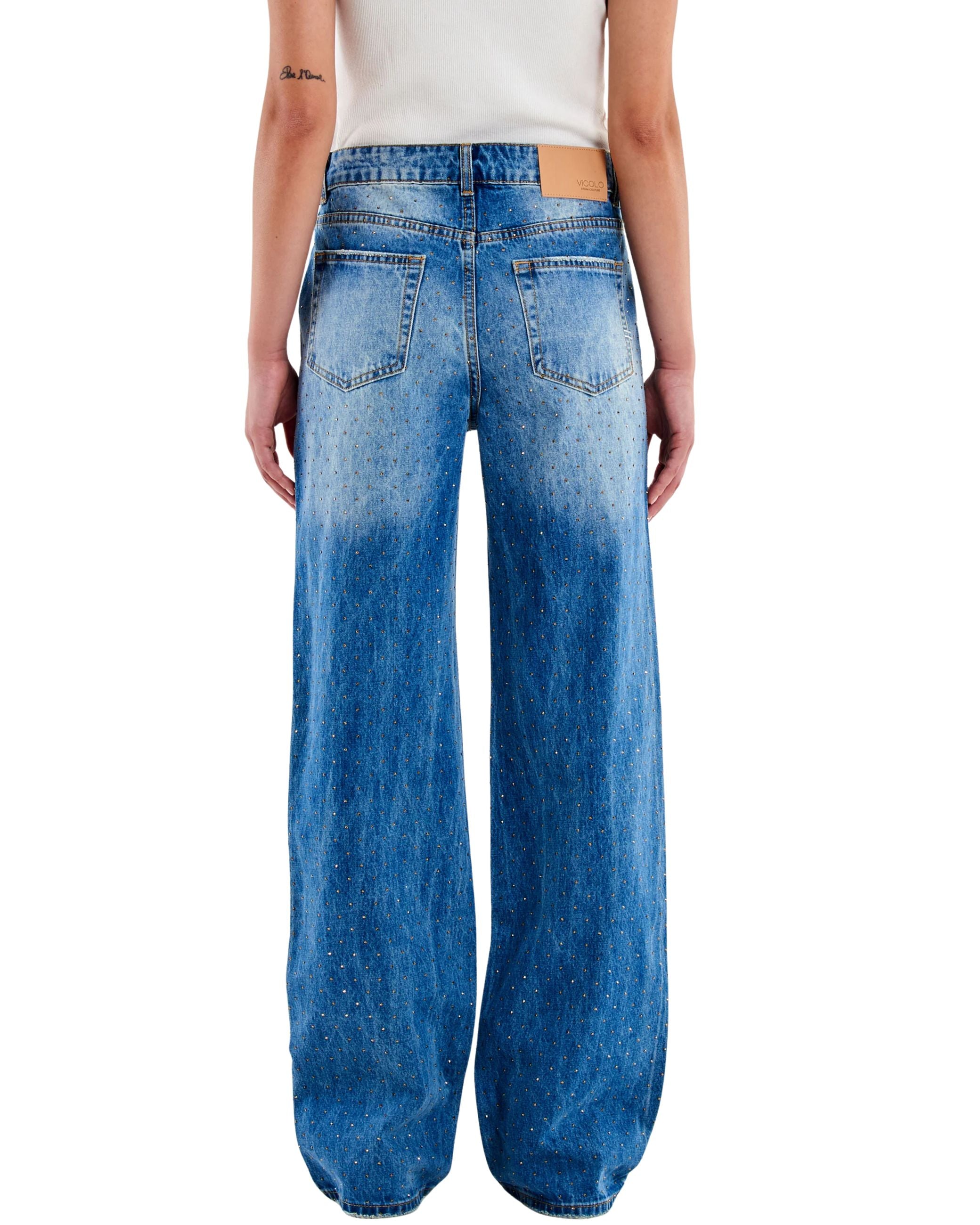 Jeans della nuova collezione fall winter 25/26del brand Vicolo modello Aurora a vita alta e gamba dritta impreziosito da borchie e strass.