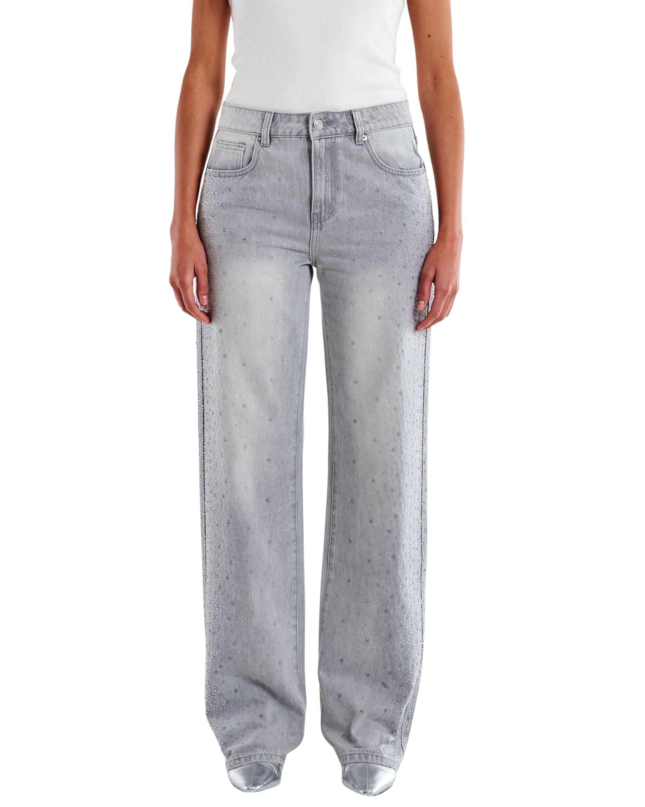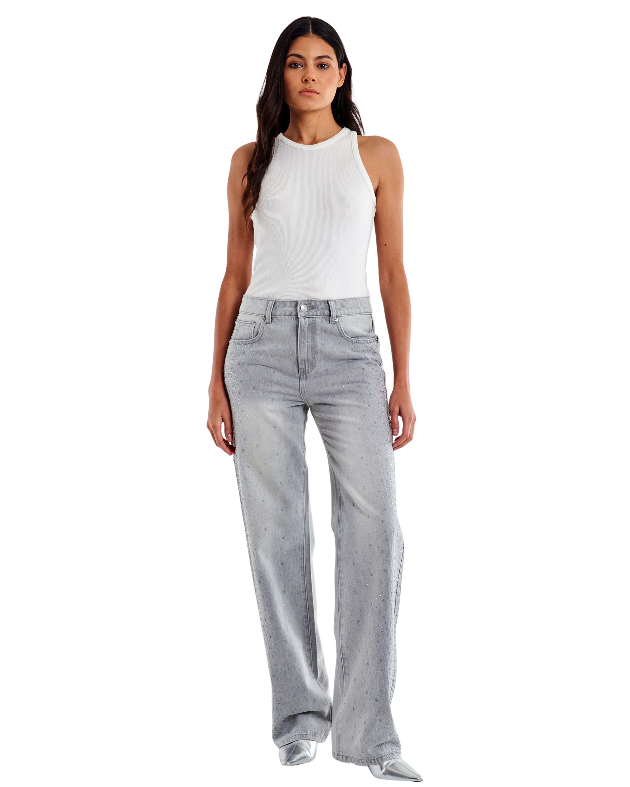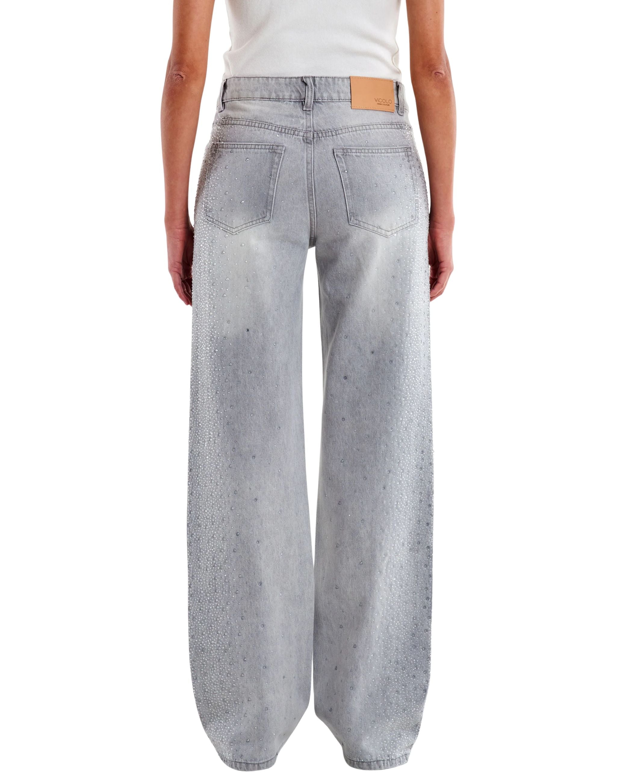 Jeans della nuova collezione fall winter 25/26del brand Vicolo modello Aurora a vita alta e gamba dritta dalla vestibilità regolare, impreziosito da strass.