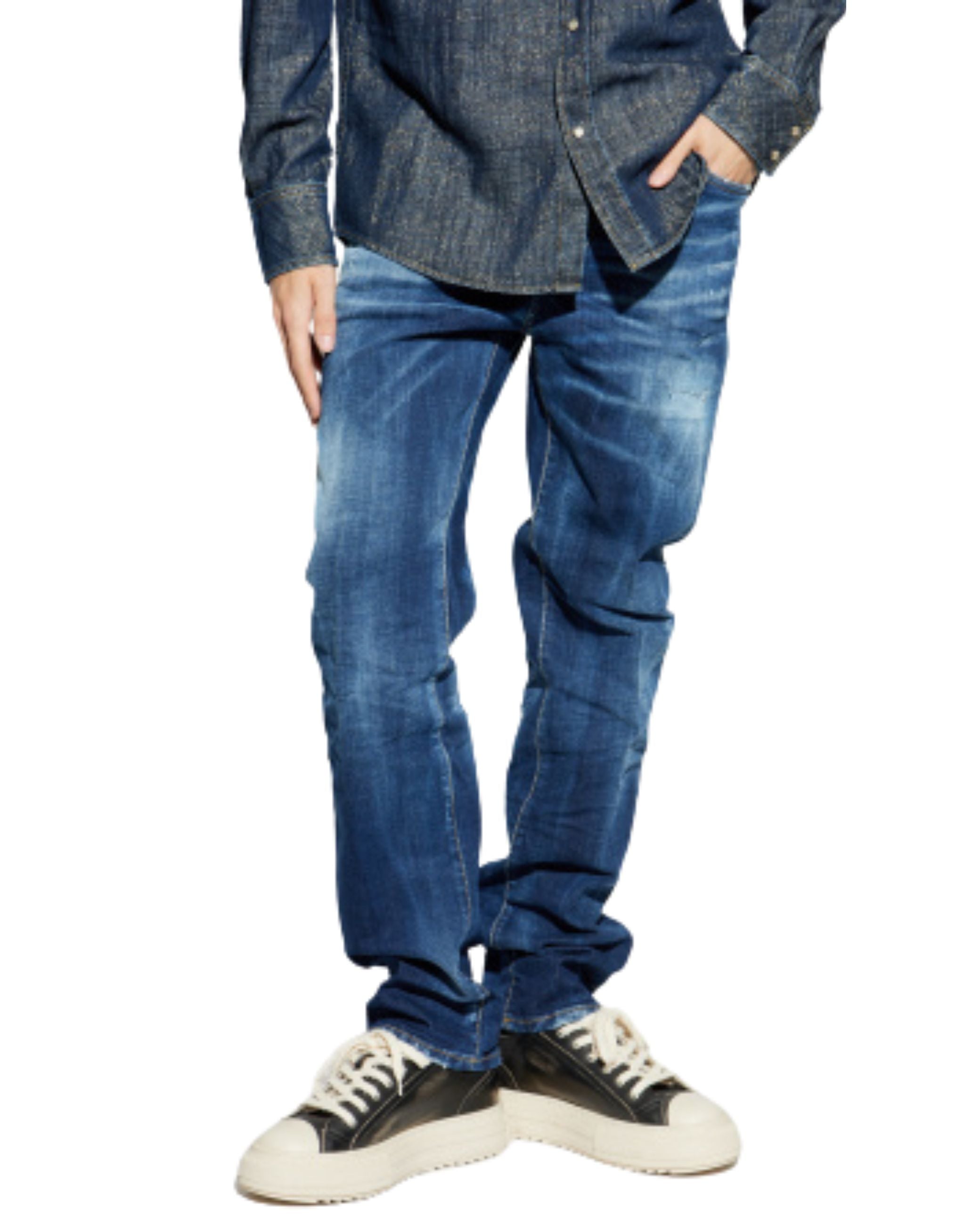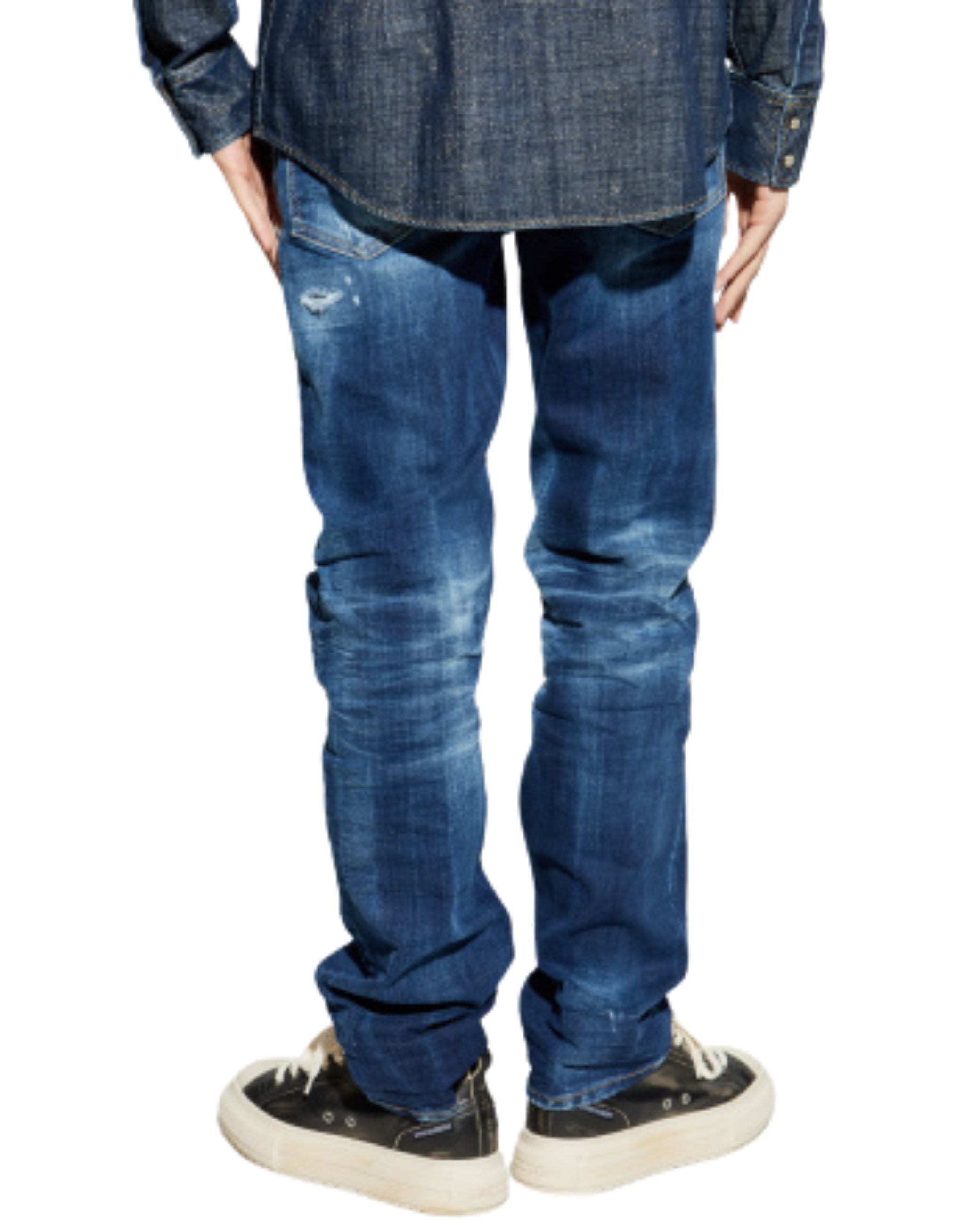 Jeans della nuova collezione fall winter 25/26 del brand Dsquared2 modello 642 realizzato in cotone dalla vestibilità regolare, ha un lavaggio effetto stone wash con micro rotture, finta doppia chiusura, patch logo applicato sul retro.