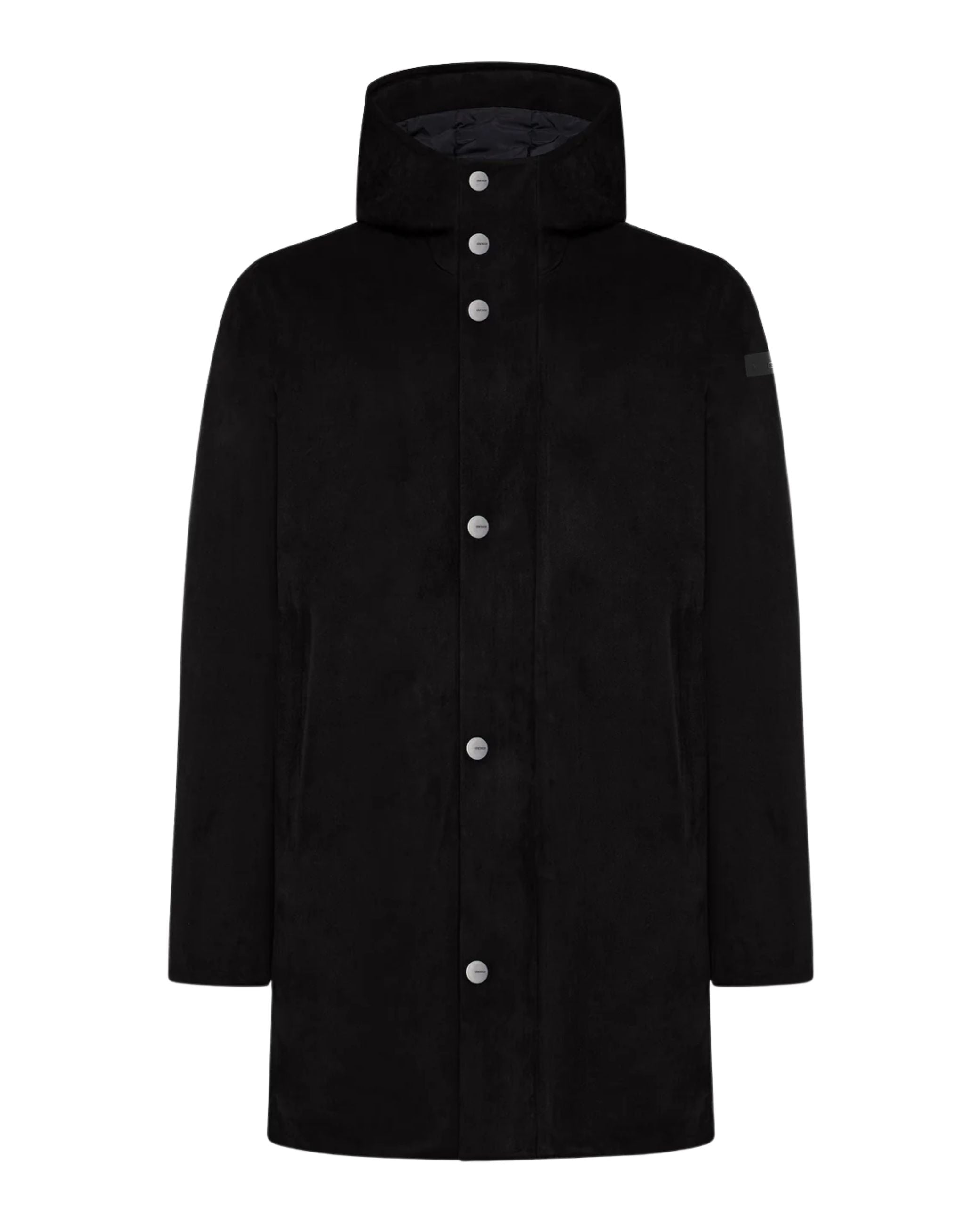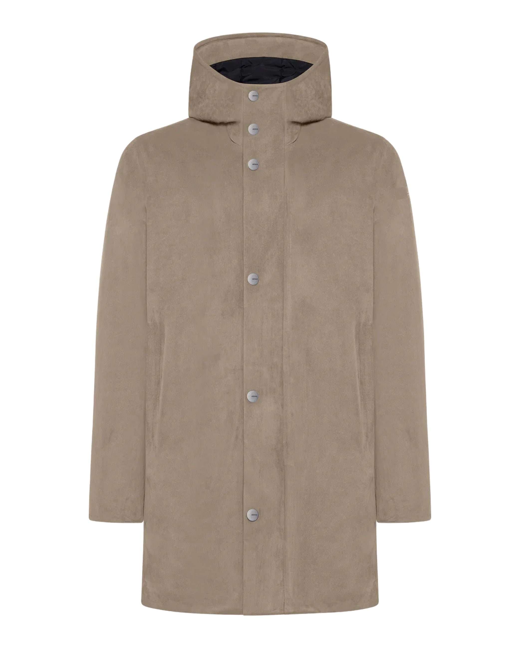 Giubbino della nuova collezione RRD collezione fall winter 25/26 modello Nabucco Floating Eskimo Jkt dalla lunghezza tre quarti realizzato in tessuto eco suede effetto nabuk morbido al tatto, imbottito in vera piuma, chiusura con zip e bottoni a pressione, cappuccio fisso.