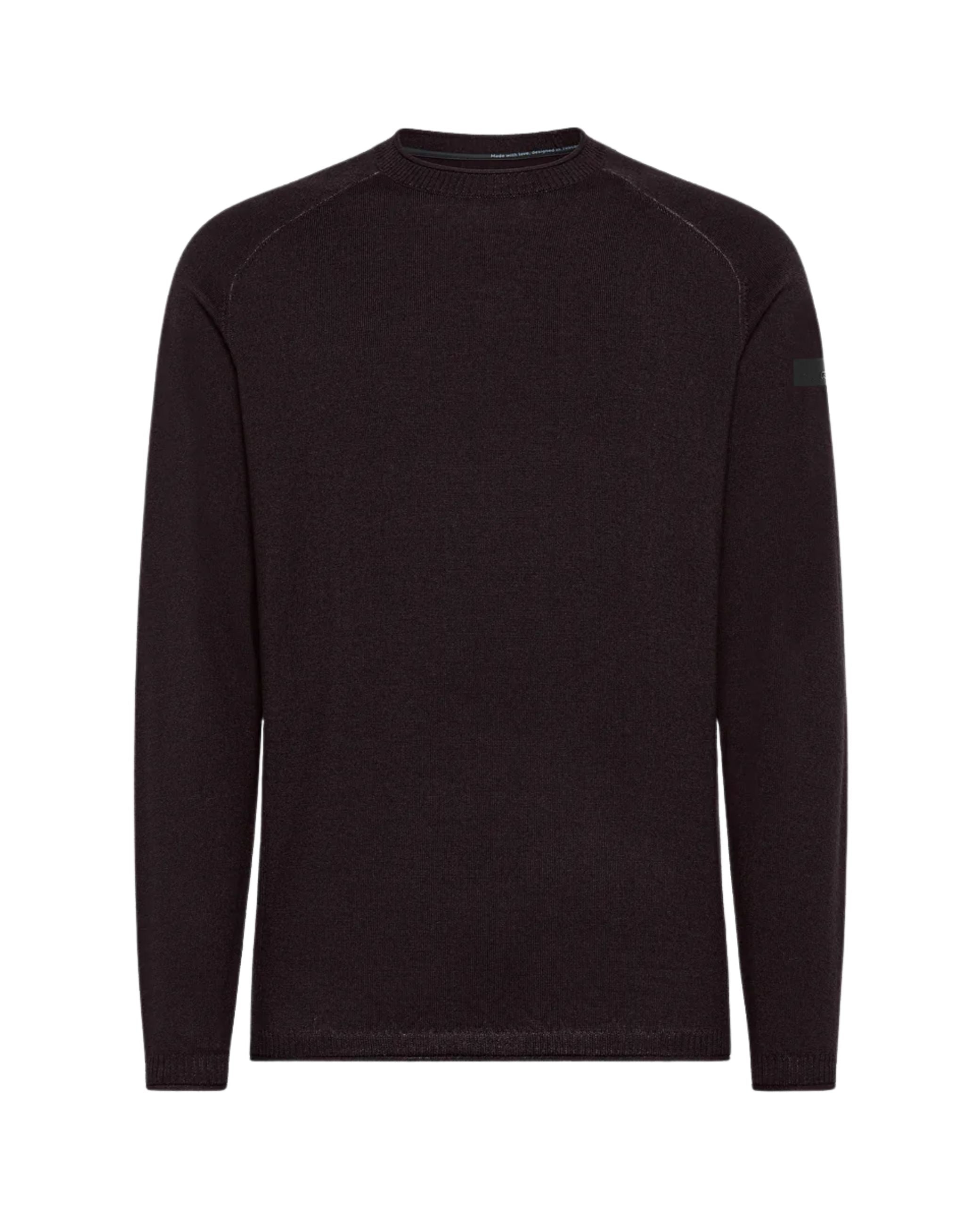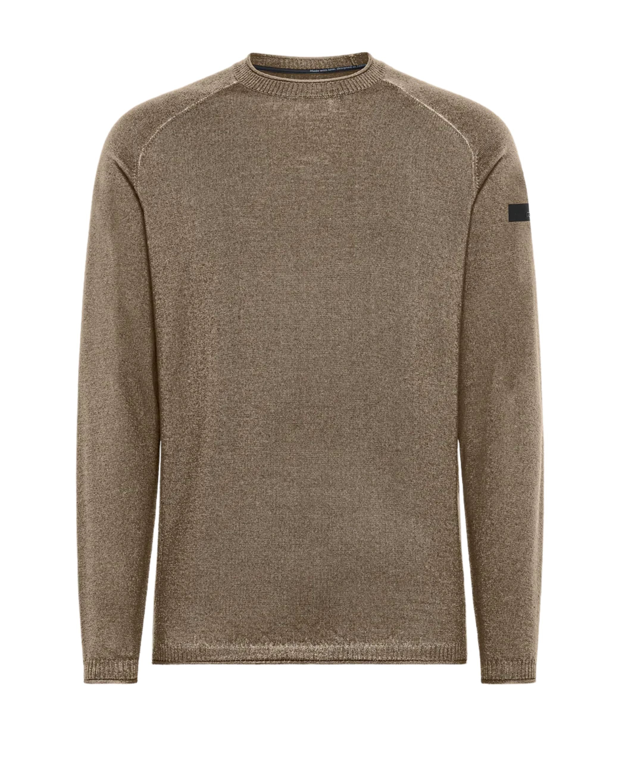 Maglia della nuova collezione RRD collezione fall winter 25/26 modello Crispy Round Knit realizzata in lana merino elasticizzata dalla lavorazione delavè, profili collo, polsi e fondo a coste inglesi con arricciatura.