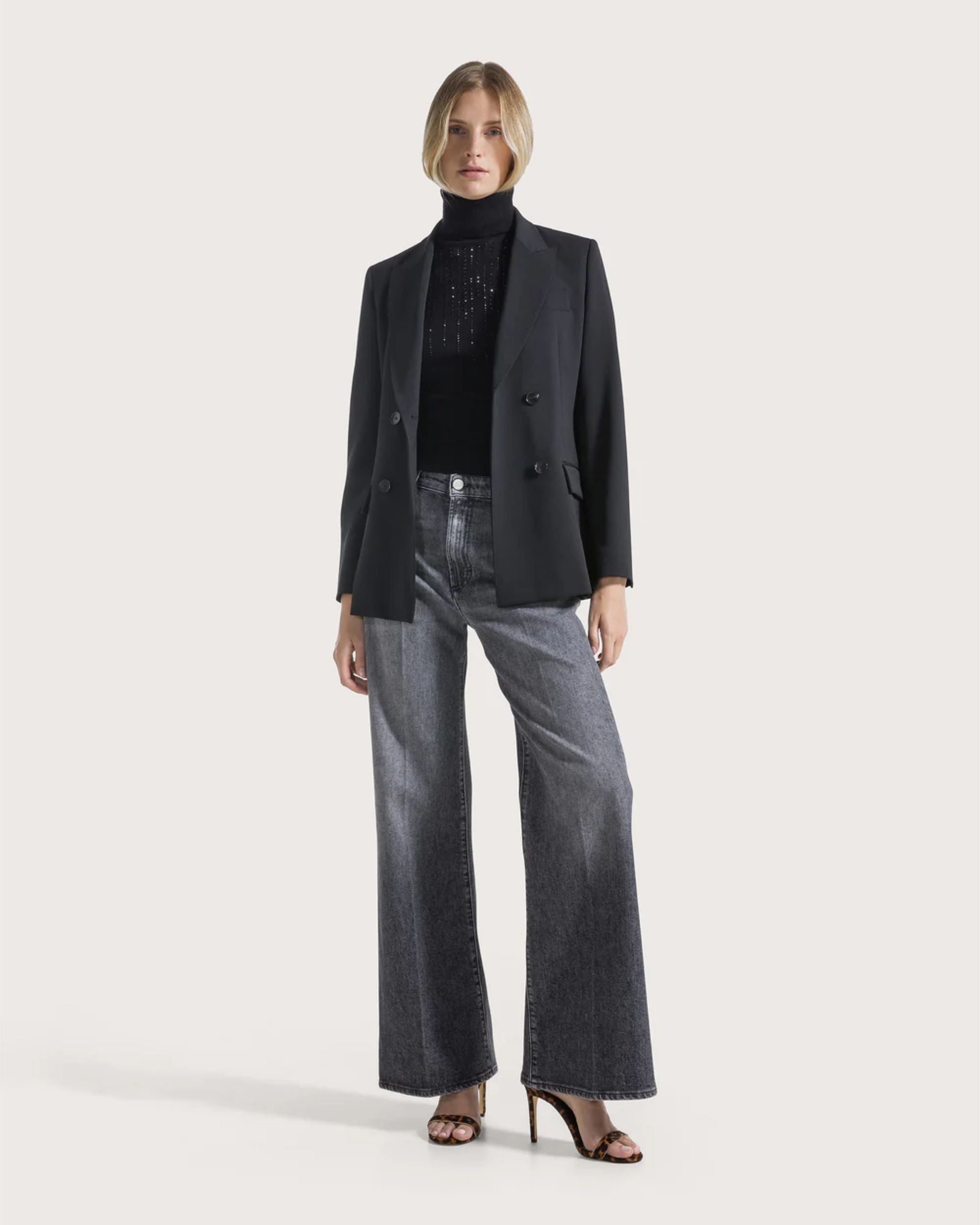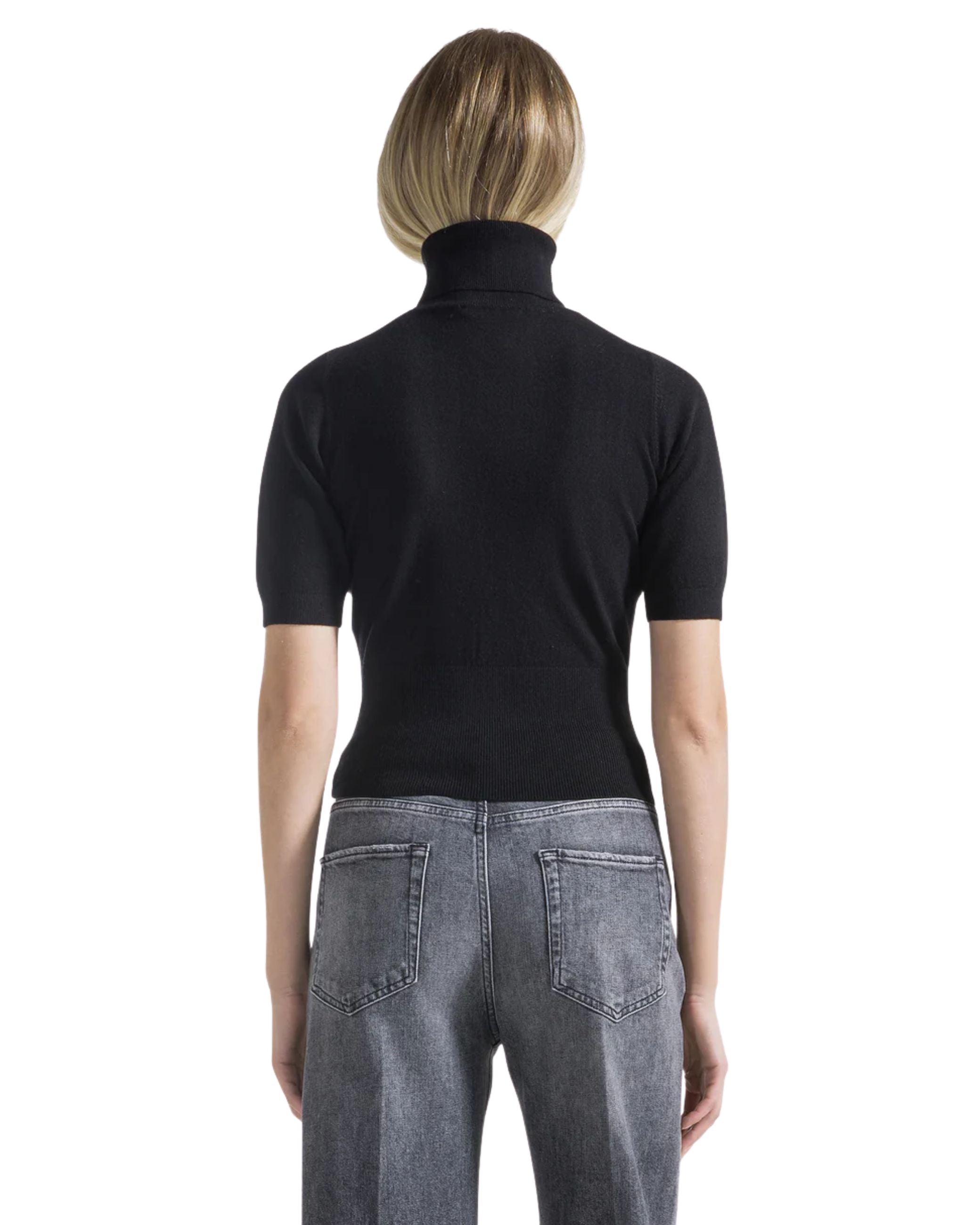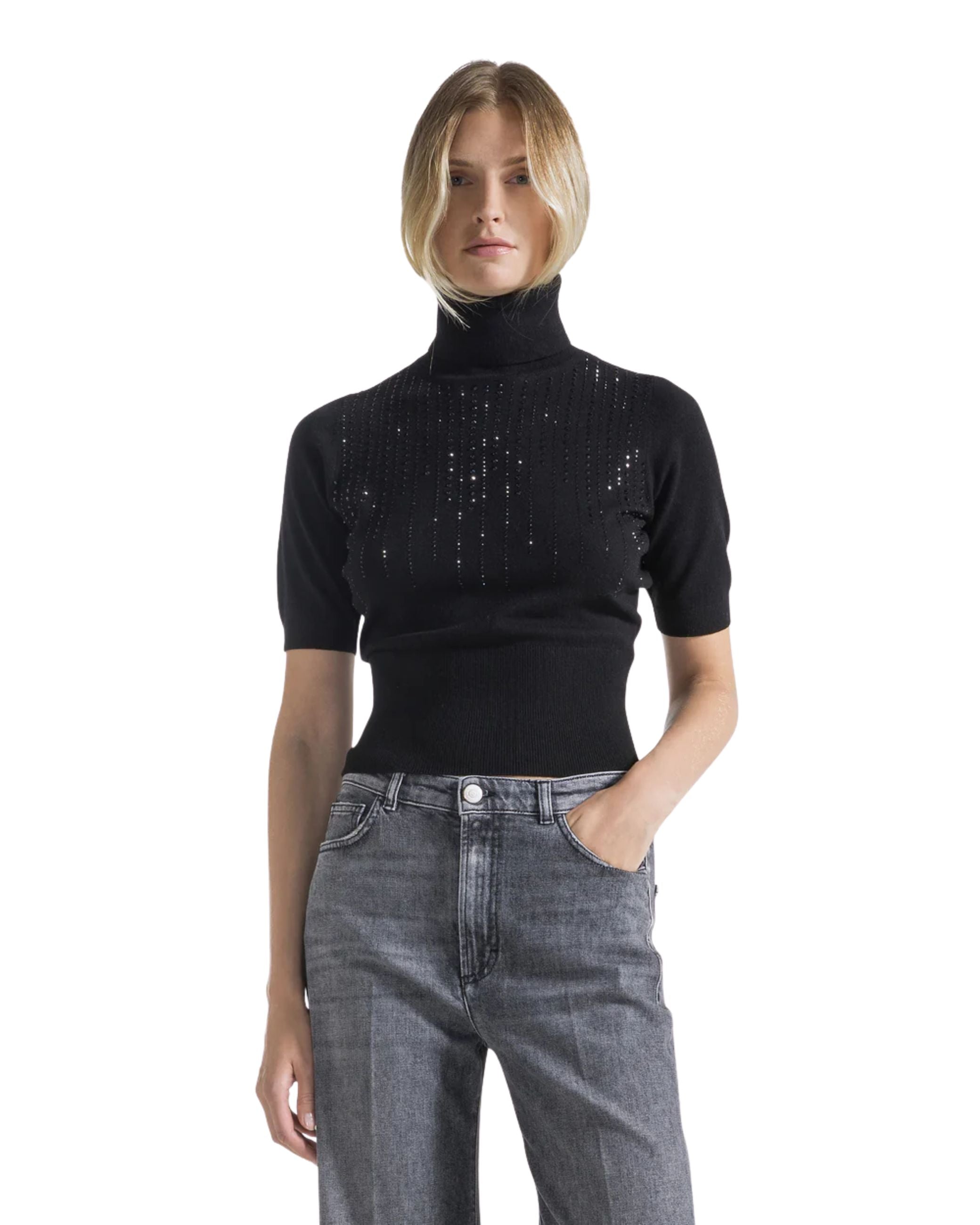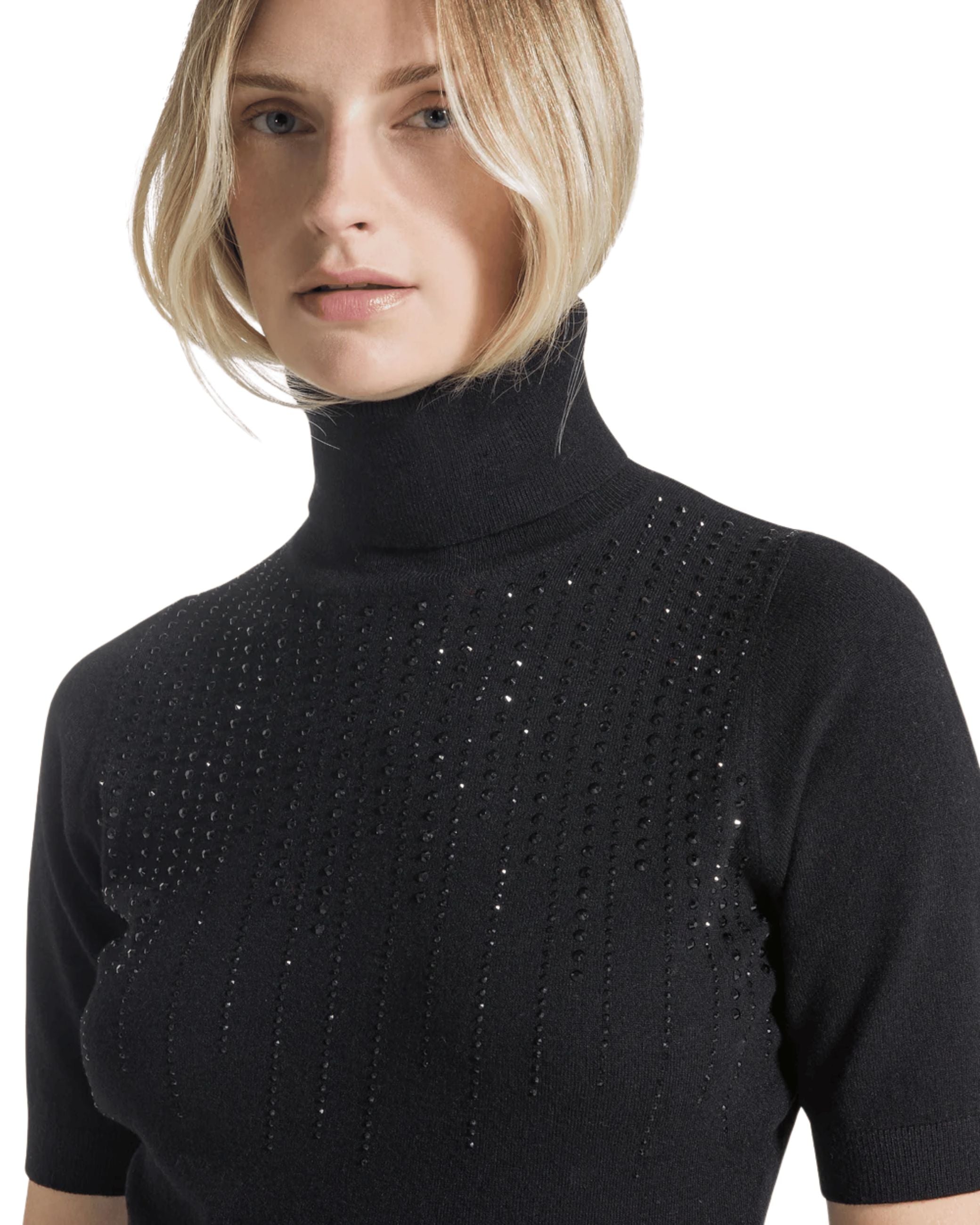 Maglia della nuova collezione fall winter 25/26 di Seventy modello dolcevita realizzato in viscosa stretch, impreziosito sul davanti da applicazioni strass, maniche corte, profili collo, polsi e fondo rifiniti a costine.