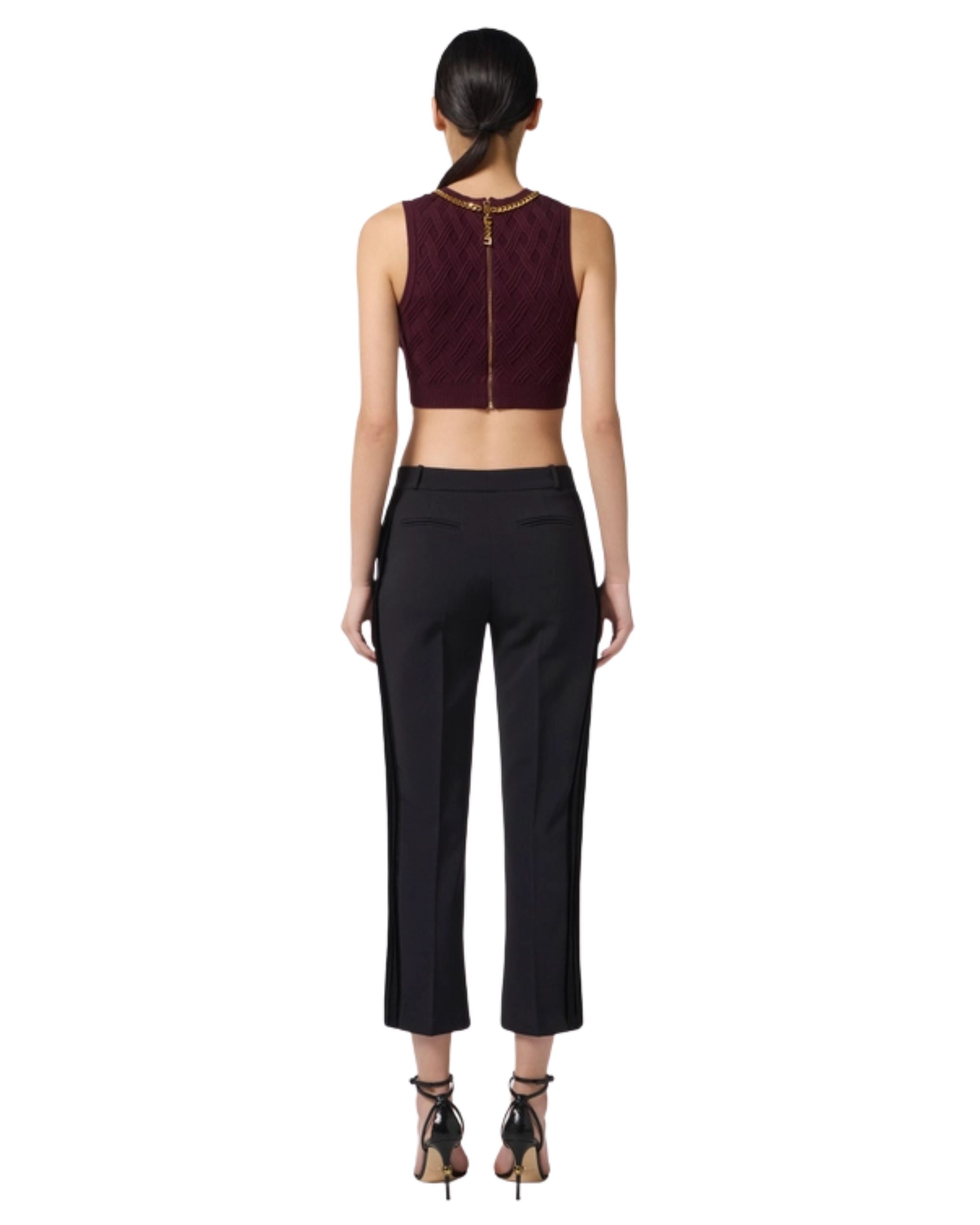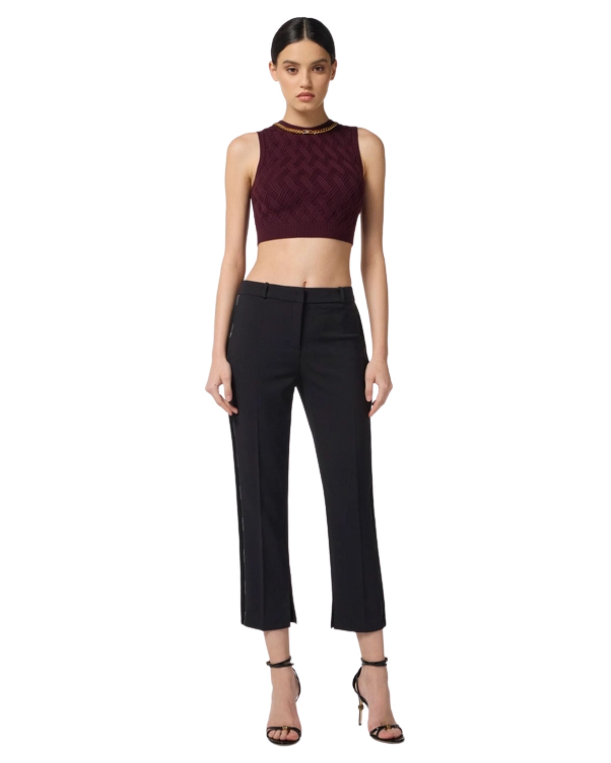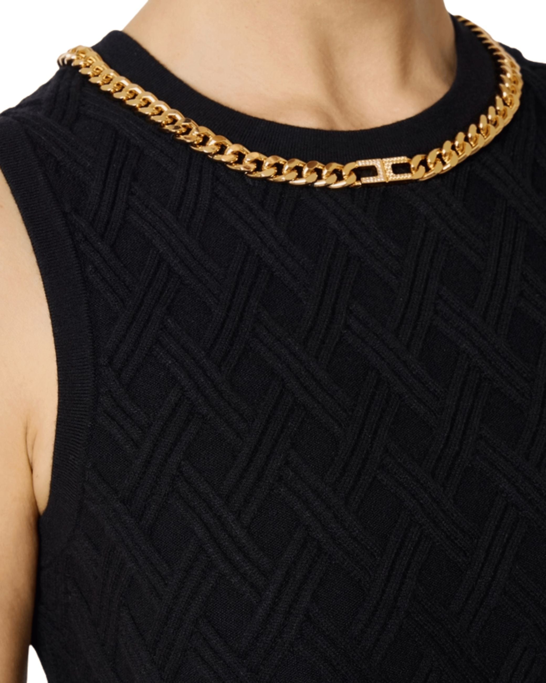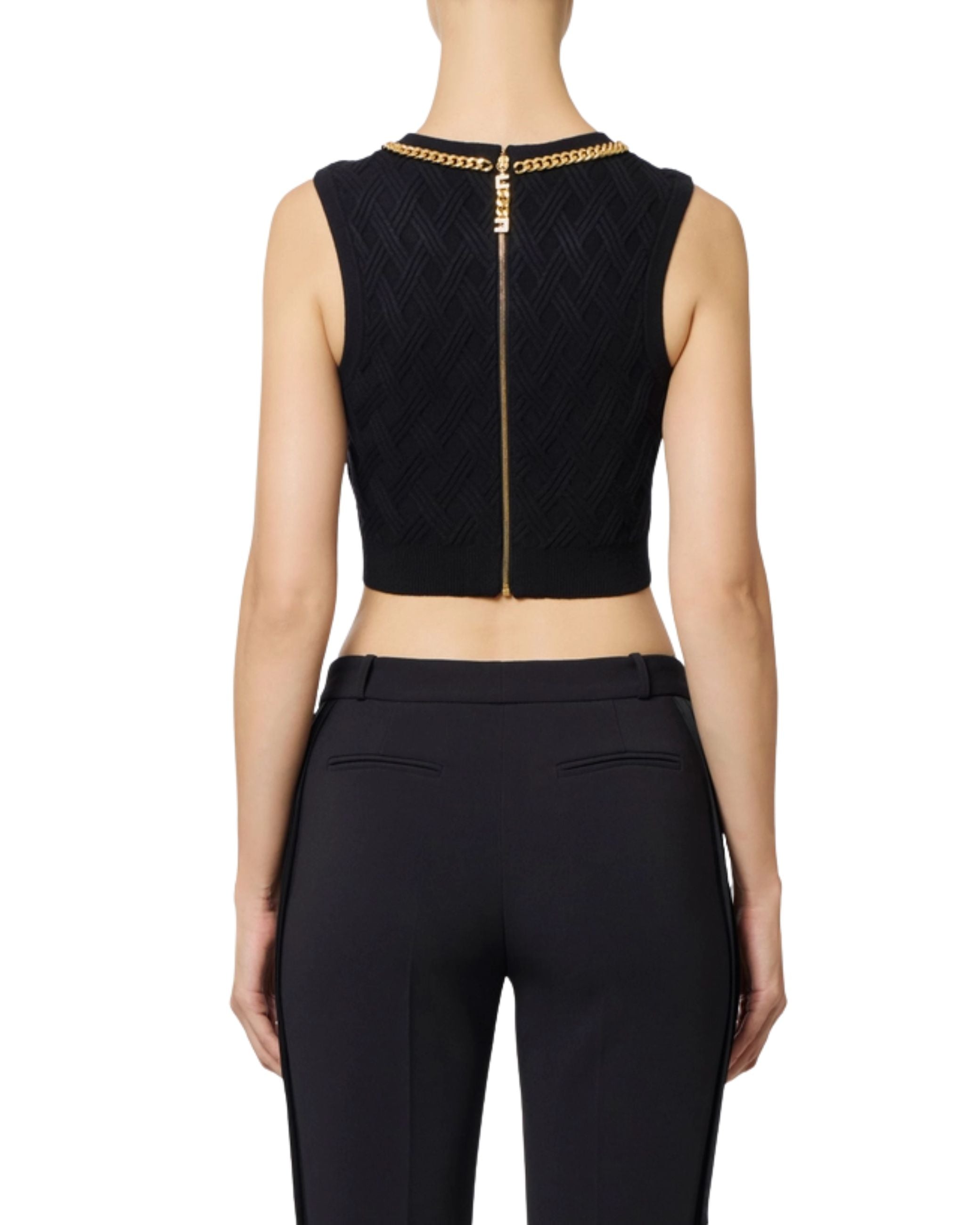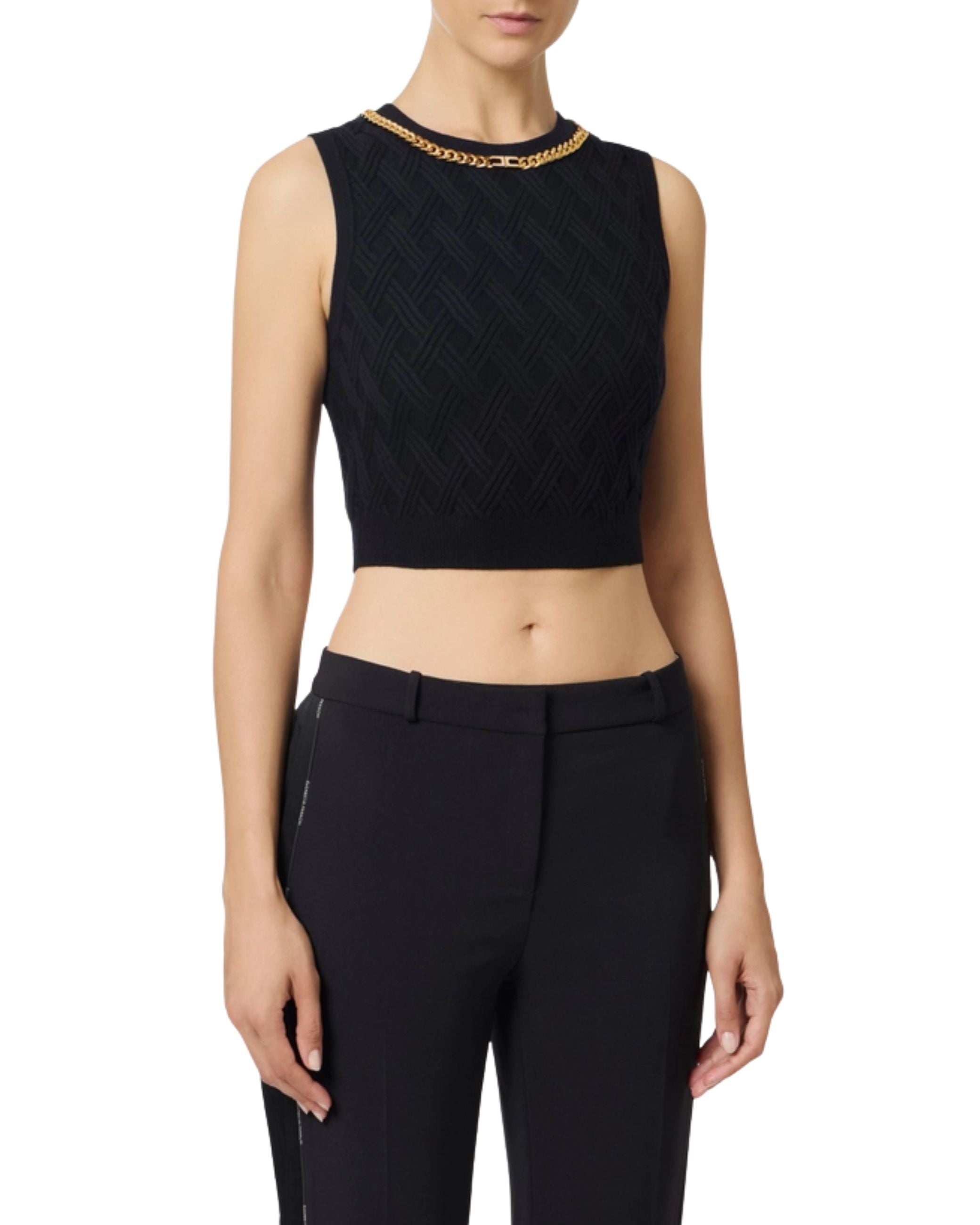 Top della nuova collezione fall winter 25/26 del brand Elisabetta Franchi caratterizzato da lavorazione 3D in rilievo dai motivi geometrici, impreziosito al collo da catena groumette, chiusura zip sul retro con tira zip gioiello, ha una vestibilità aderente.