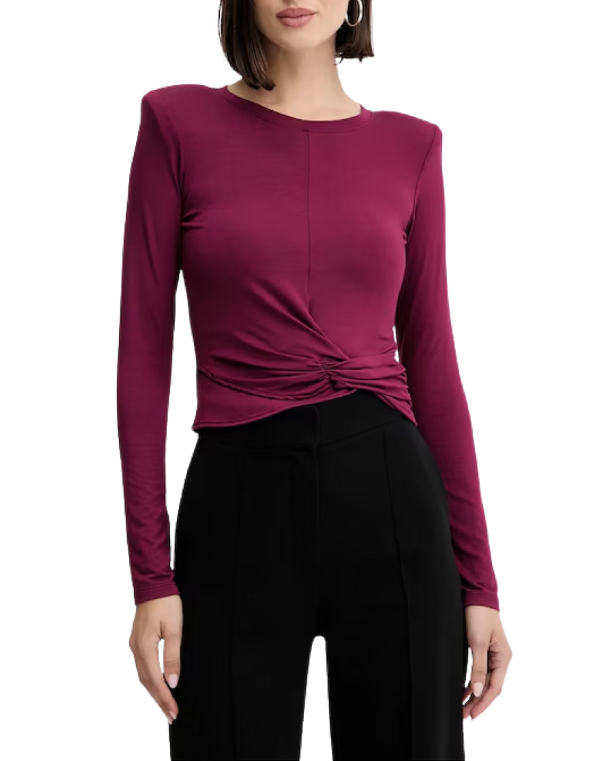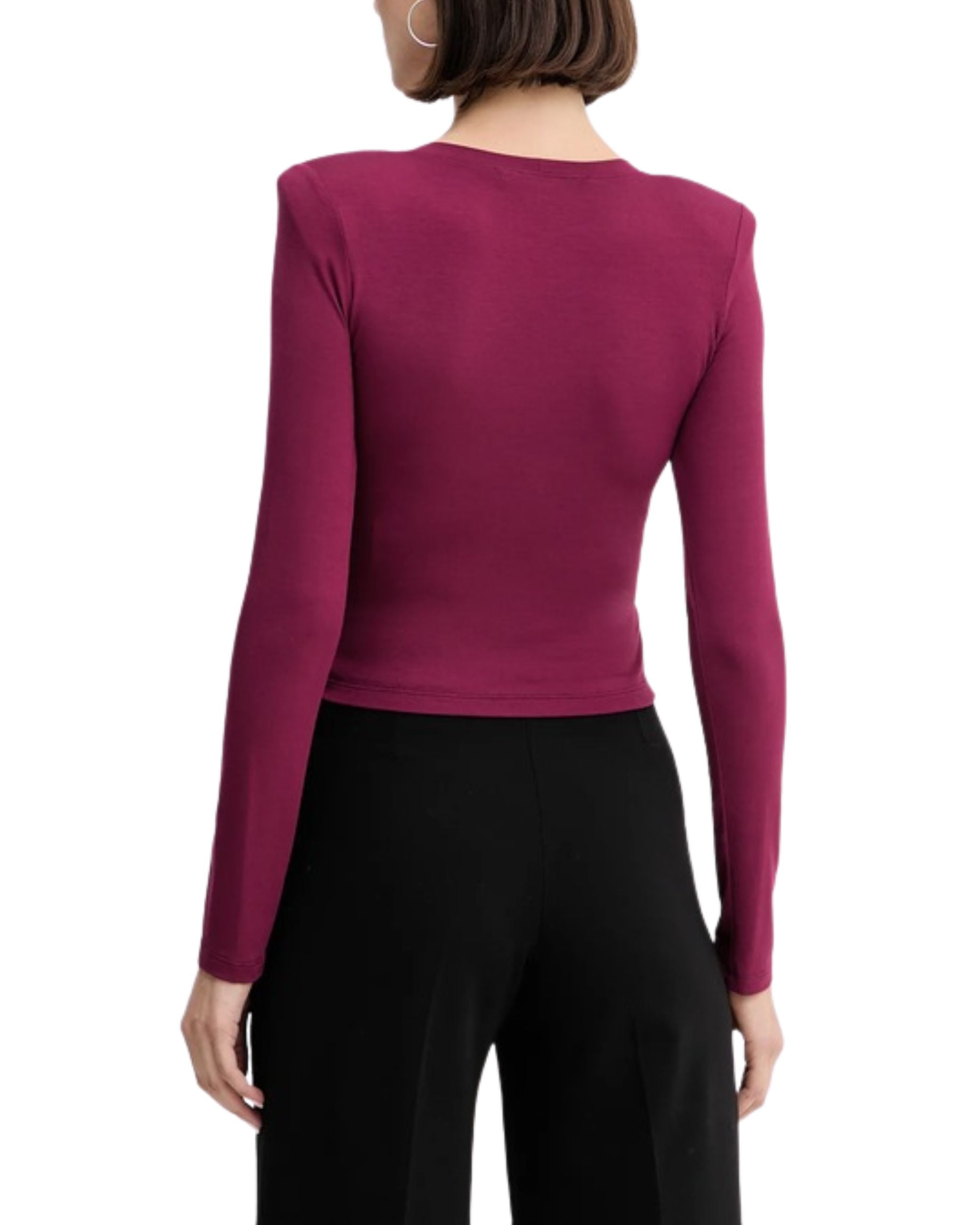 T-shirt della nuova collezione fall winter 25/26 di Simona Corsellini modello a maniche lunghe, collo tondo, spalle strutturate e imbottite, drappeggio sul davanti, ha una vestibilità aderente.