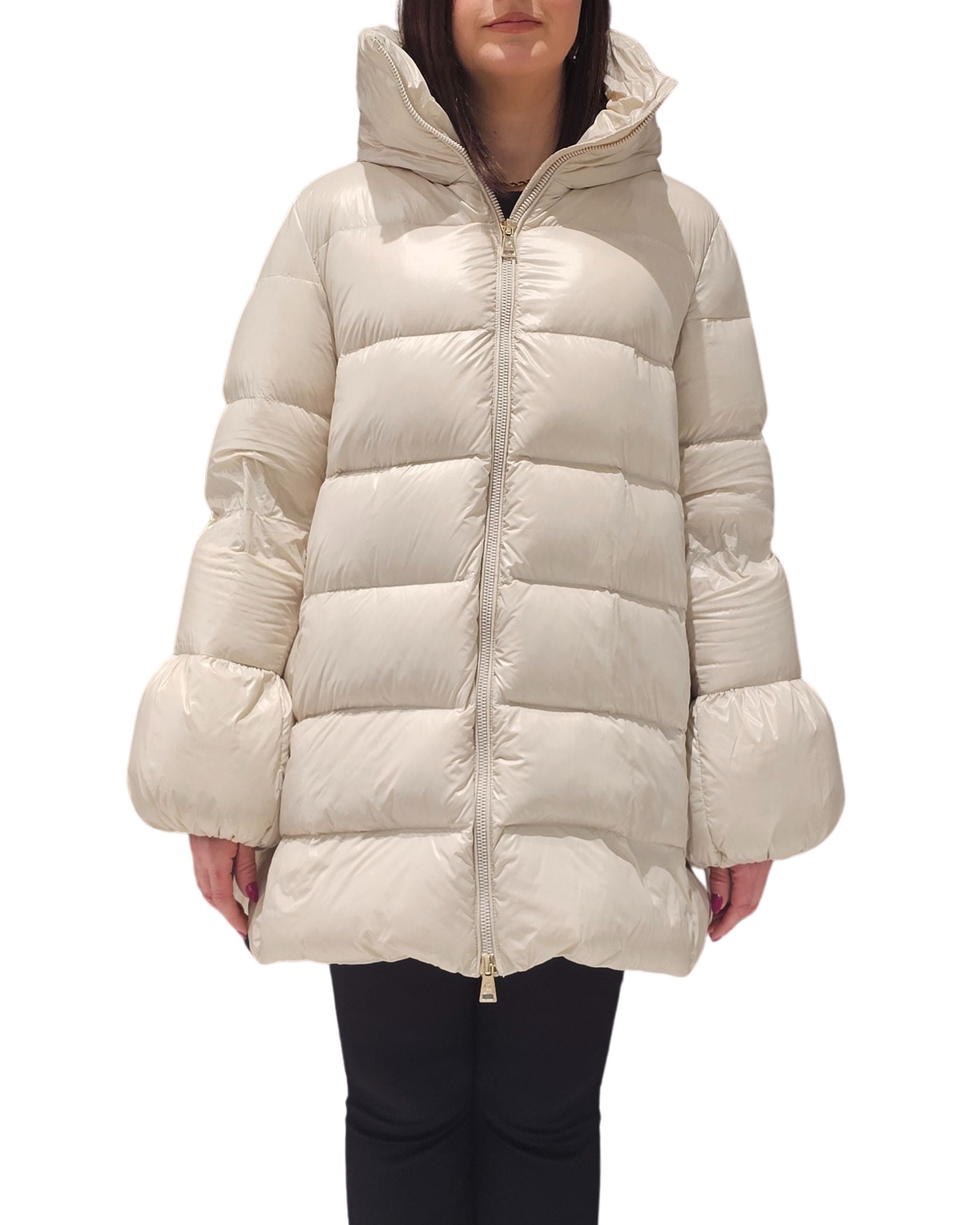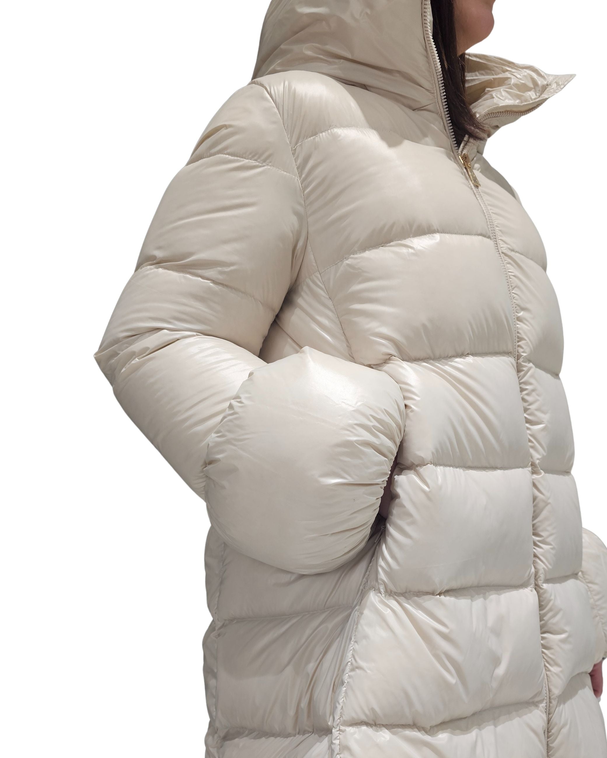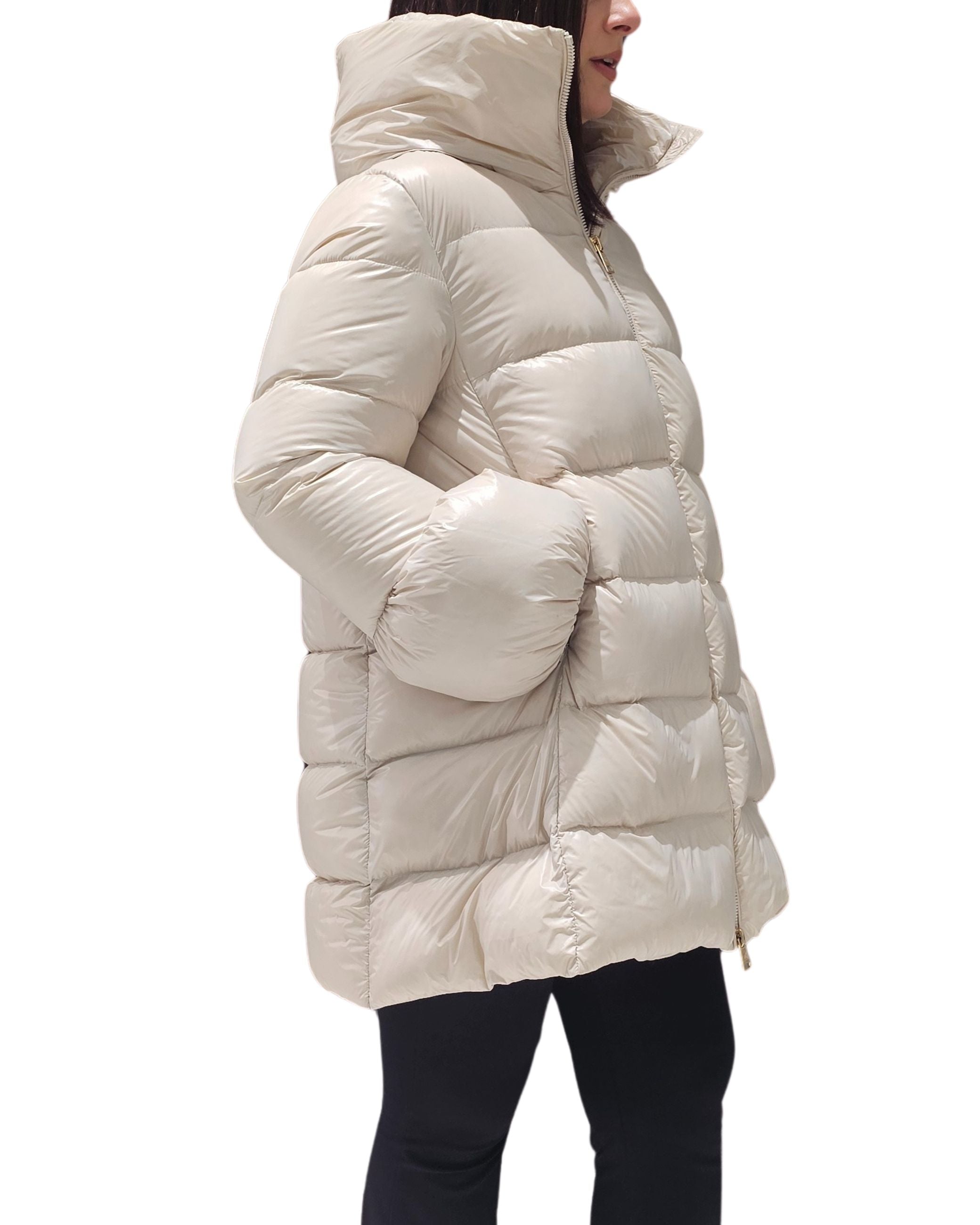 Giubbino della collezione fall winter Emma&Gaia, modello lungo imbottito in piuma, chiusura zip, collo alto.